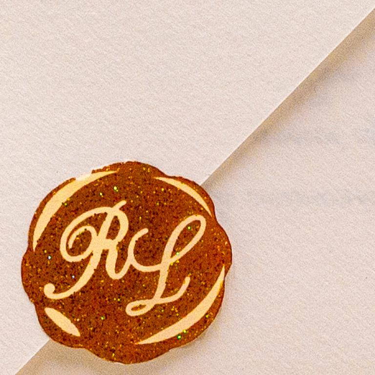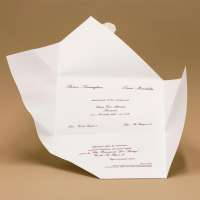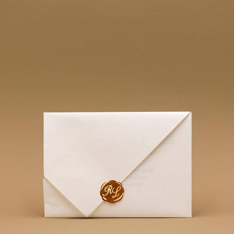 Partecipazione di matrimonio piegata a formare una busta dal taglio asimmetrico. Bollino tipo ceralacca adesivo con iniziali per sigillare il foglio.