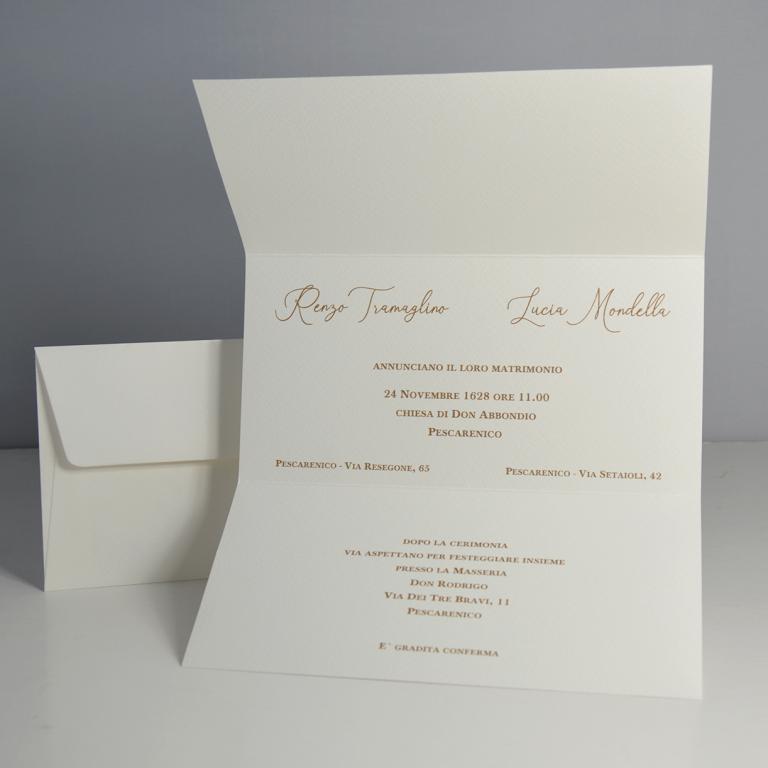 Partecipazione di matrimonio rettangolare realizzata con carta martellata panna, esterno con nomi degli sposi. Interno con annuncio e invito. Chiusura con fascia color tortora e data del matrimonio.