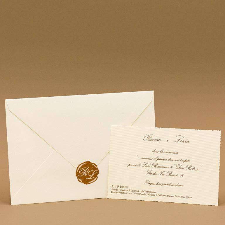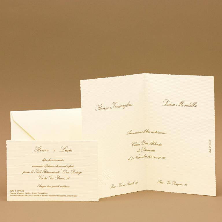 Partecipazioni di matrimonio formato con apertura a libro e margini frastagliati. Carta tipo pergamena con iniziali a secco piccole su esterno. Invito abbinato con margini frastagliati.