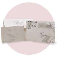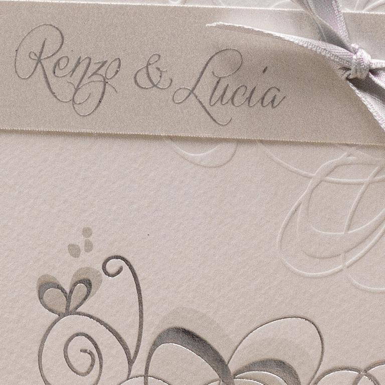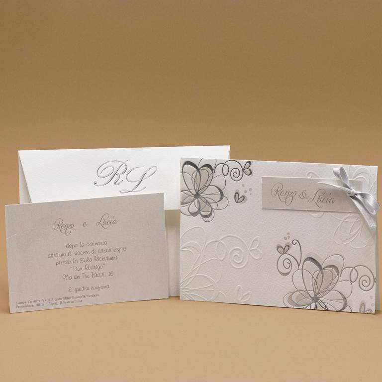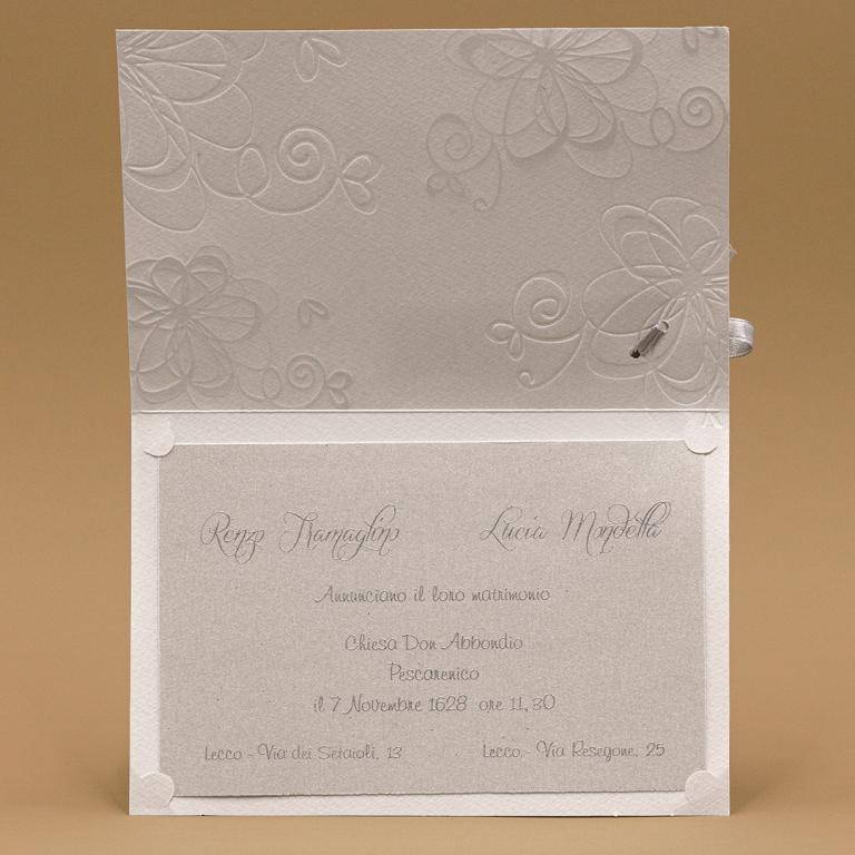 Partecipazioni di matrimonio con apertura verso l'alto, decori a secco argento motivo fiori su copertina. Nastro che lega un talloncino con nomi degli sposi. Invito abbinato senza decori.