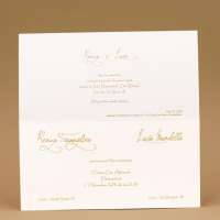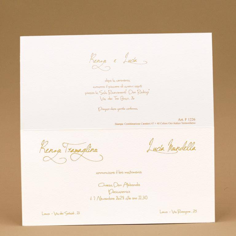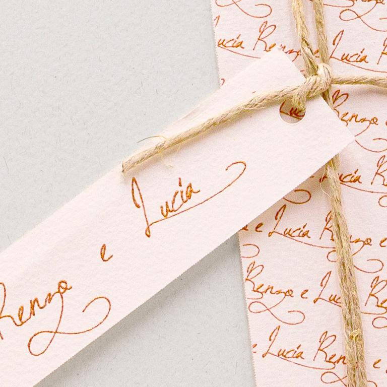 Partecipazione di matrimonio rettangolare con invito incluso, fascia con nomi sposi ripetuti e spago e talloncino con nomi.