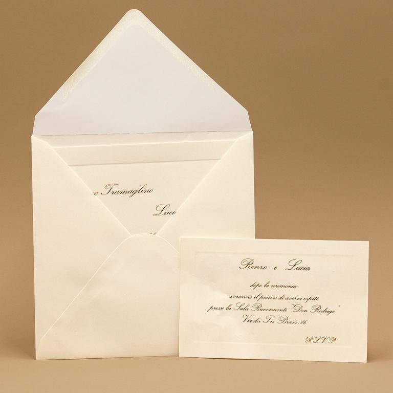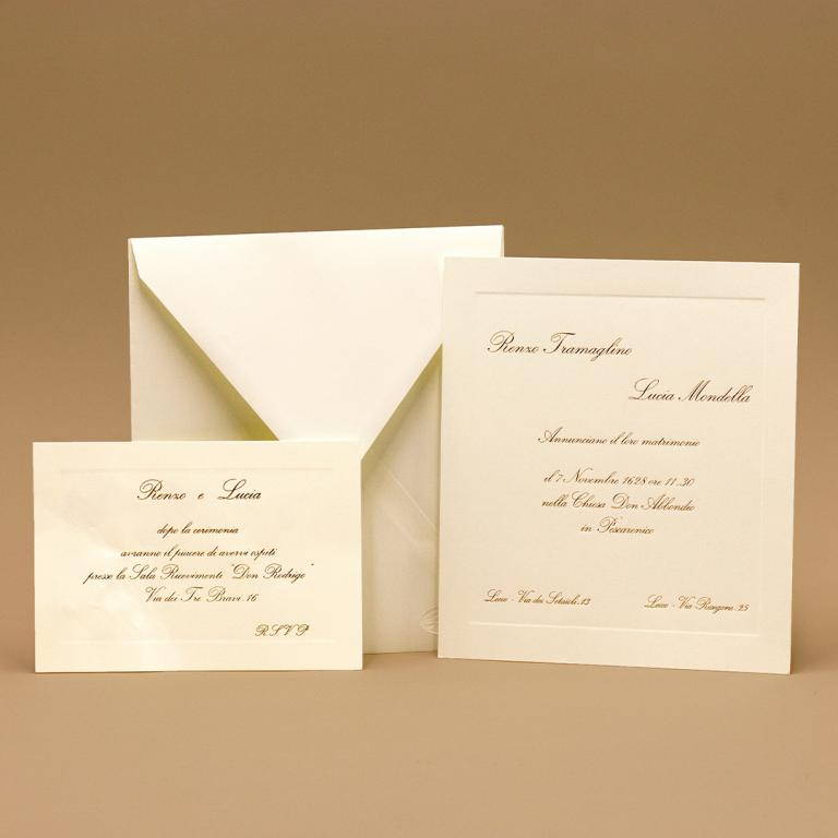 Partecipazioni di matrimonio quadrata color avorio con cornice liscia a rilievo, invito che riprende la stessa cornice.