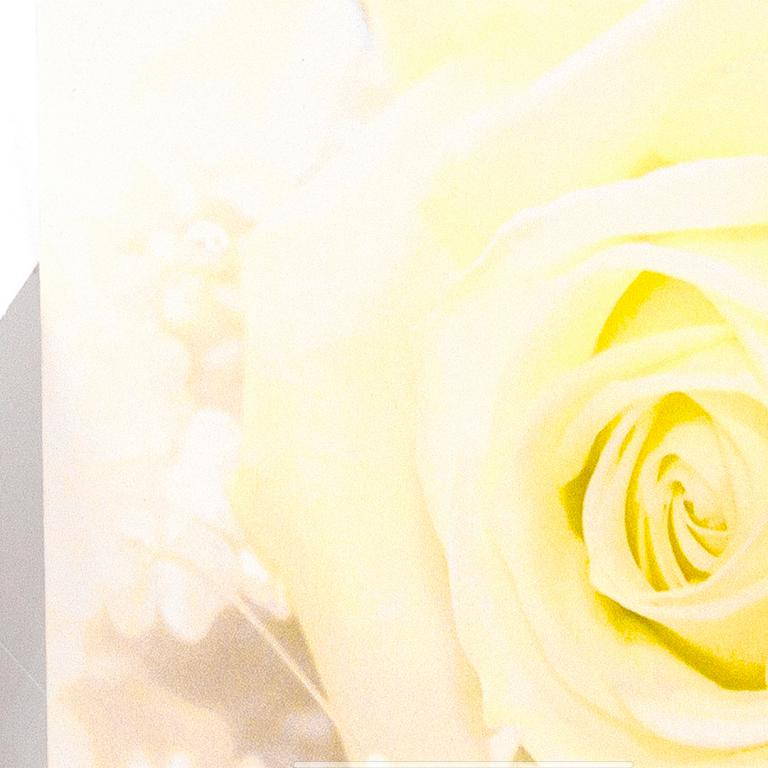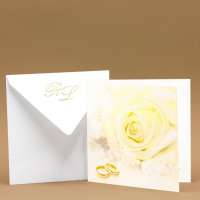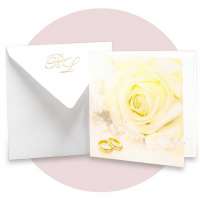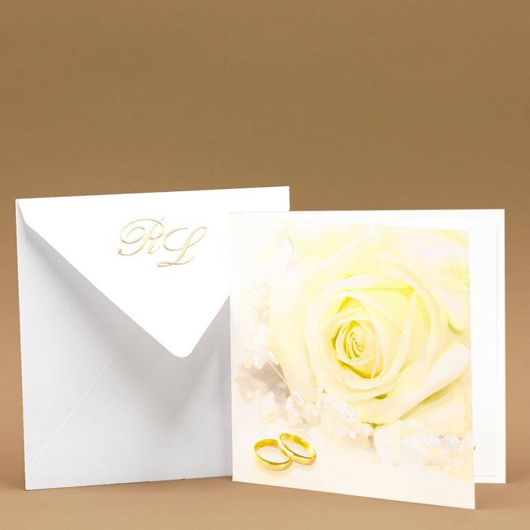 Partecipazioni di matrimonio quadrata con rosa bianca e fedi sulla copertina, intercalare bianca con invito incluso.
