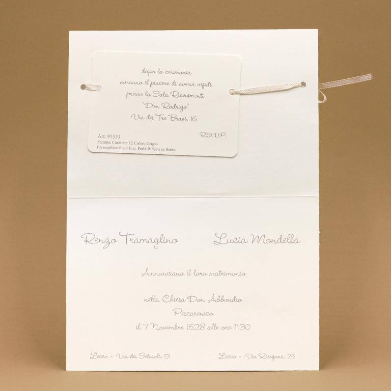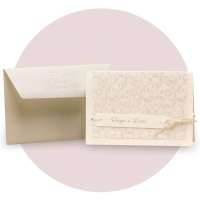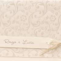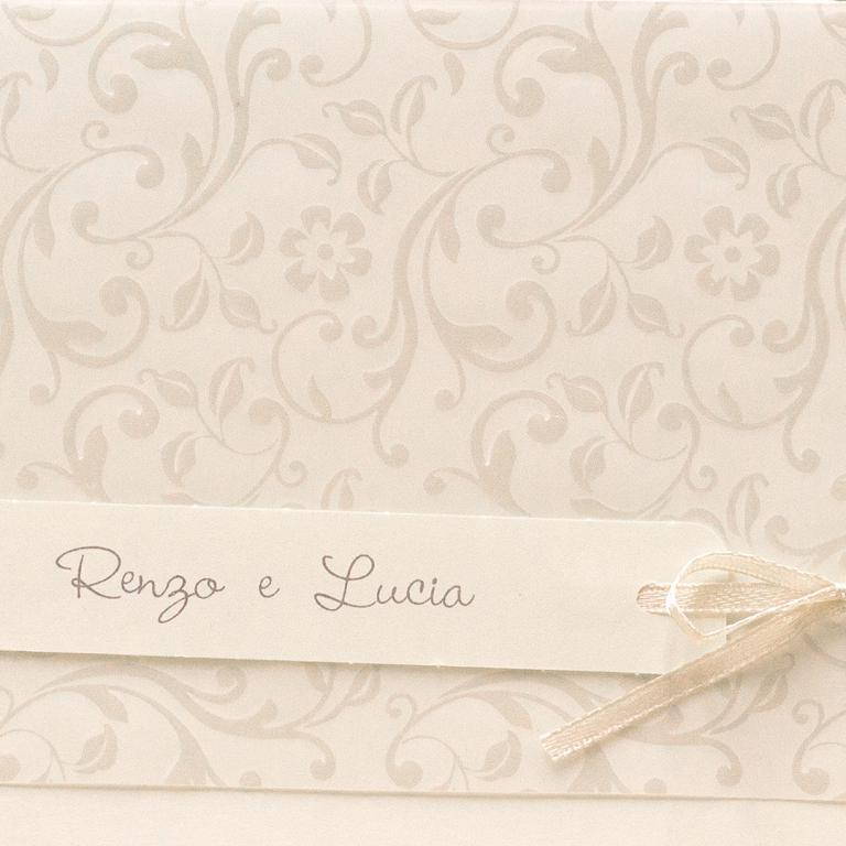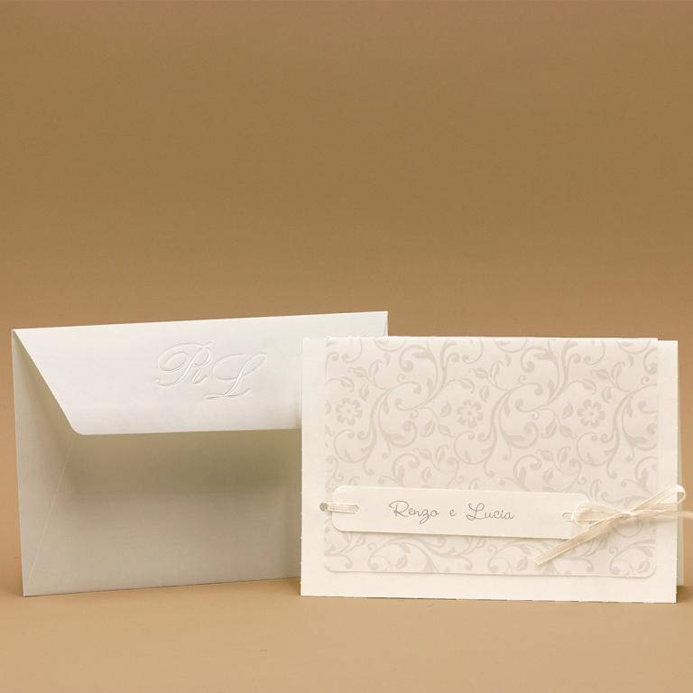 Partecipazioni di matrimonio rettangolare formato libro con apertura verso l'alto. È composta da un foglio esterno in carta trasparente opaca decorato con motivi floreali a rilievo, all'interno con cartoncino in carta liscia avorio. La partecipazione ha due fori per il passaggio di un nastrino in raso che lega l'invito all'interno ad un talloncino con i nomi degli sposi posizionato all'esterno.