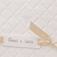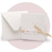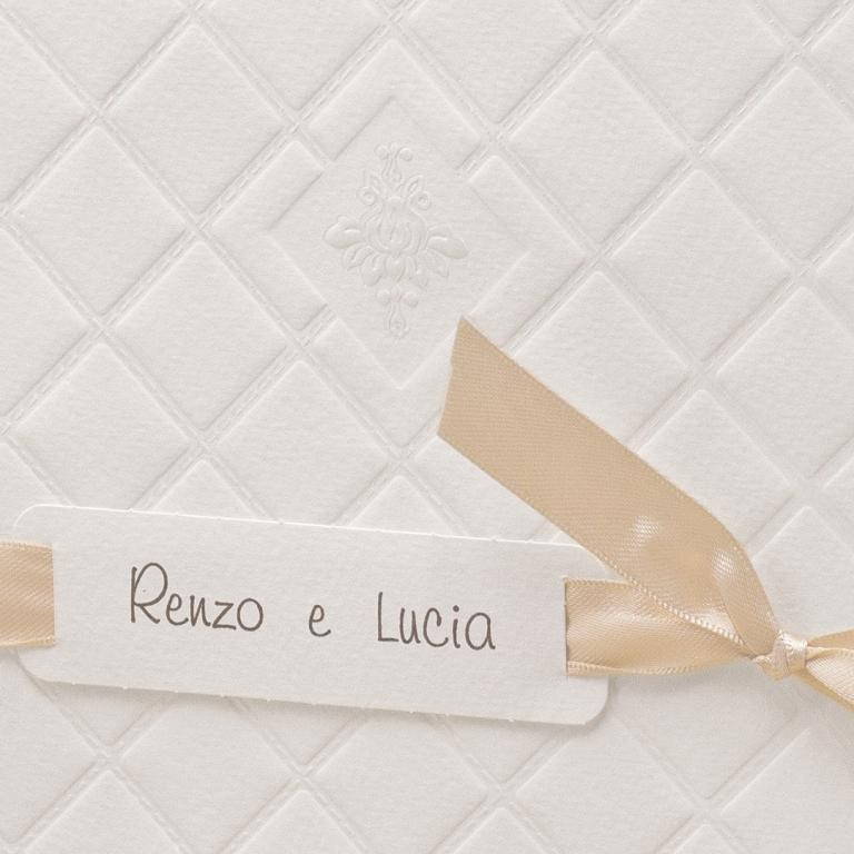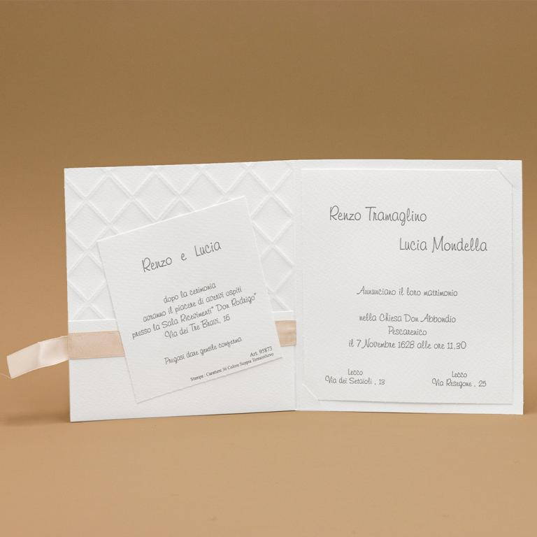 Partecipazioni di nozze quadrata realizzata con carta ruvida bianca, composta da: esterno che presenta sul fronte un decoro a rilievo tipo greca; interno con due fogli in carta bianca ruvida per l'inserimento dei dati. Il nastrino in raso rosa permette di unire la partecipazione con il talloncino esterno per i nomi degli sposi.