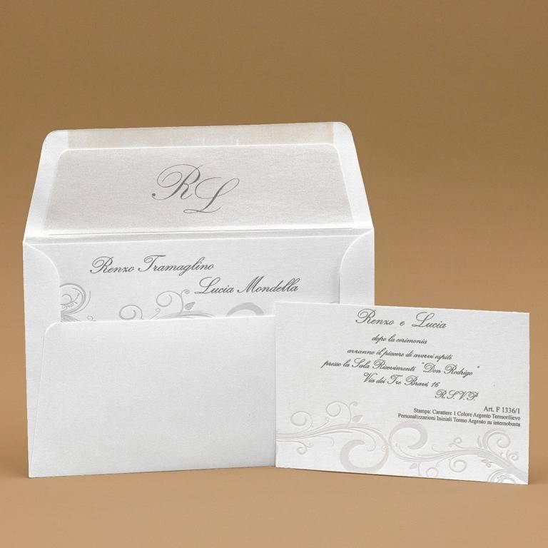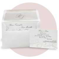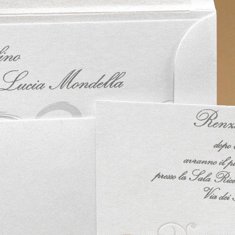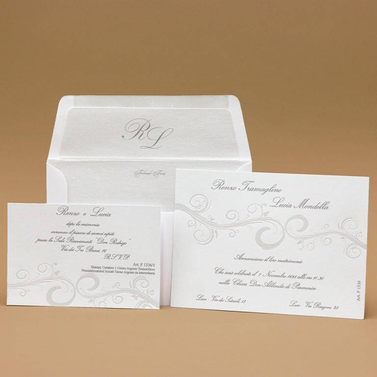 Partecipazioni di nozze rettangolare con decoro a rilievo tra nomi sposi e testo partecipazione, invito abbinato con stesso decoro a rilievo.