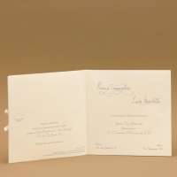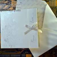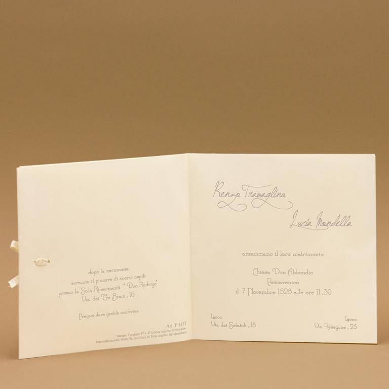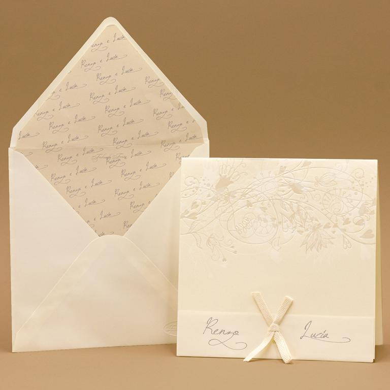 Partecipazioni di matrimonio con decoro a rilievo a sinistra e nomi laterali su lembo piegato e legato con fiocco su copertina. Intercalare per annuncio e invito incluso.