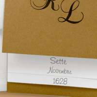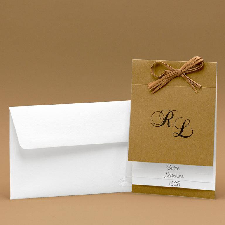 Partecipazioni di matrimonio rettangolare con fogli avorio legati da raffia alla copertina marrone, personalizzazione con iniziali sposi, data a vista sui singoli fogli a scala.