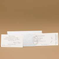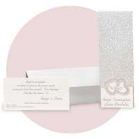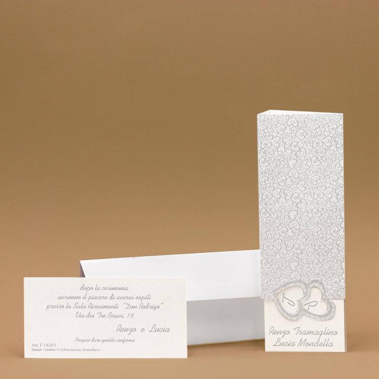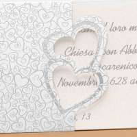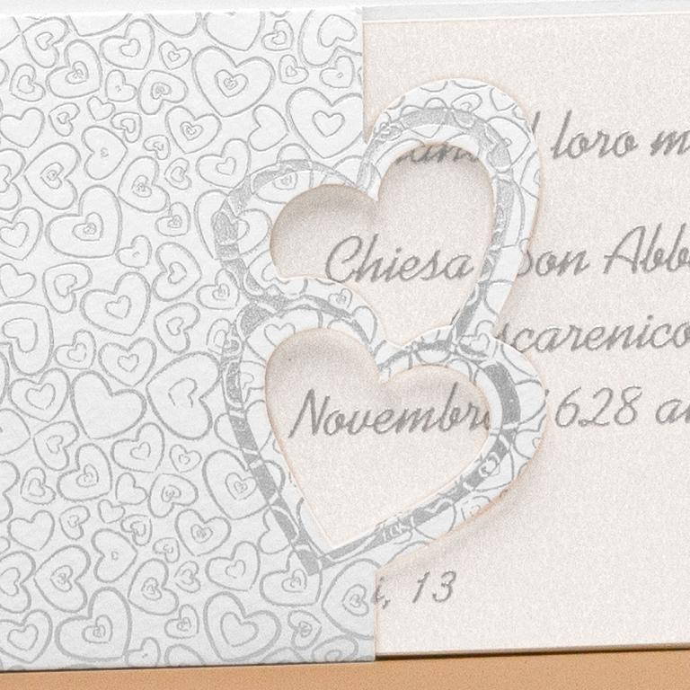Partecipazioni di matrimonio con decori di cuori in argento, due finestrelle a forma di cuori per iniziali degli sposi e invito semplice.