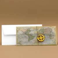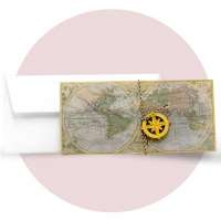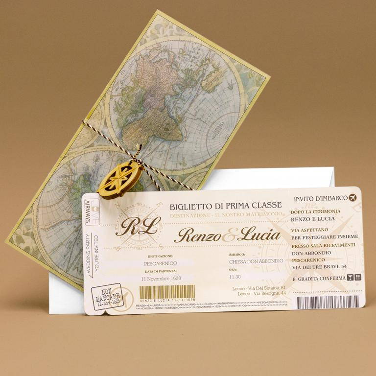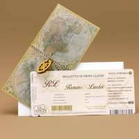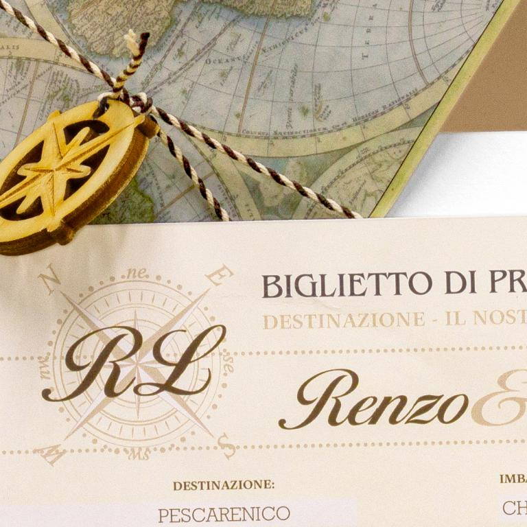 Partecipazione di matrimonio rettangolare modello biglietto aereo. La cover esterna è realizzata con carta trasparente, grafica mappamondo nelle nuances dell'azzurro, del verde e del giallo. Il fronte presenta un cordoncino bianco e nero con rosa dei venti incisa su legno che chiude la partecipazione. All'interno è inserito un cartoncino realizzato con carta bianca, tipo biglietto aereo, su cui vengono inseriti i dati del matrimonio.