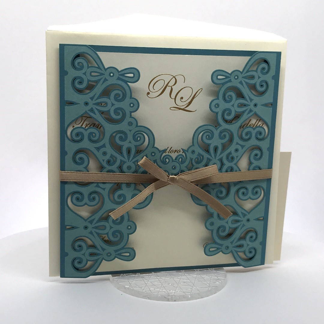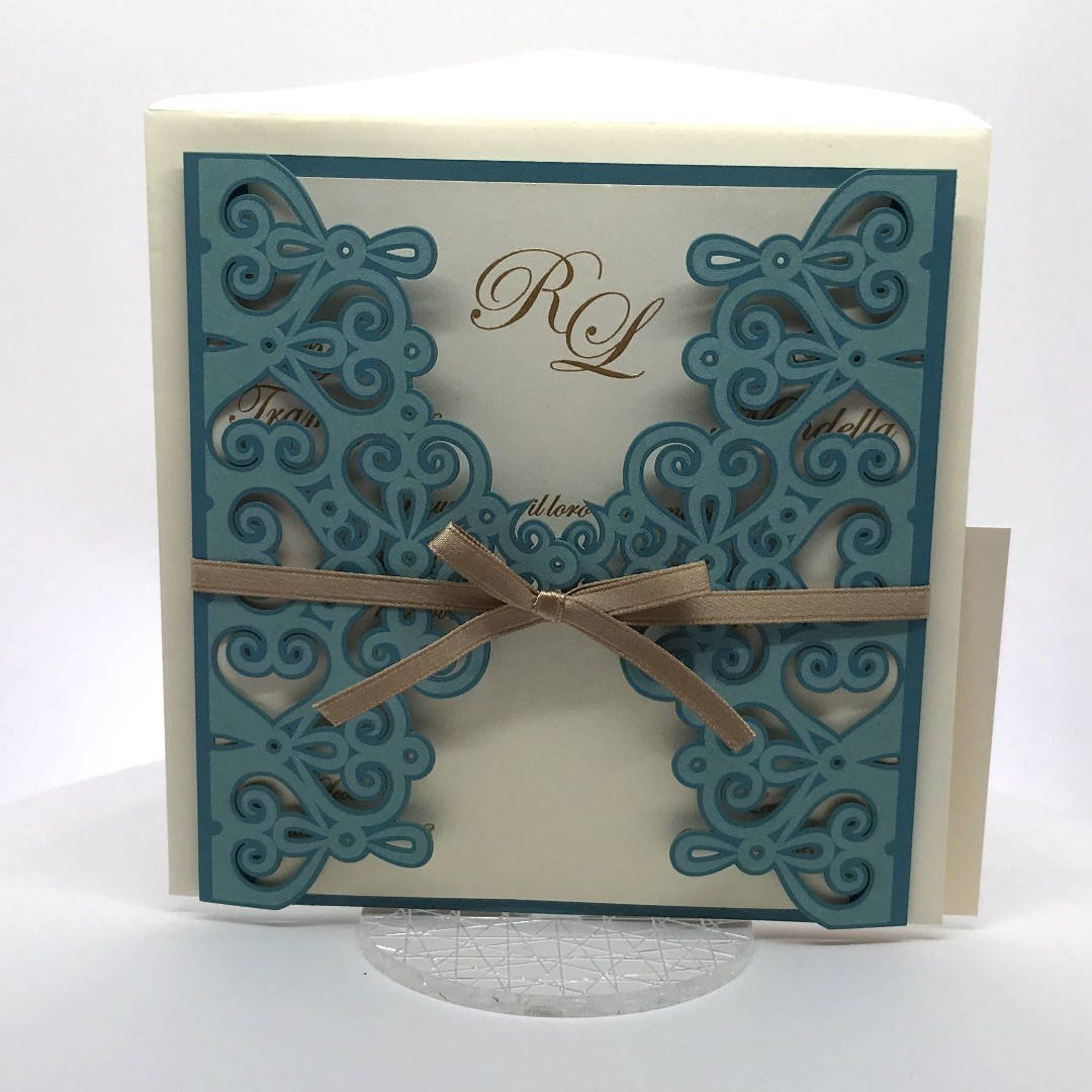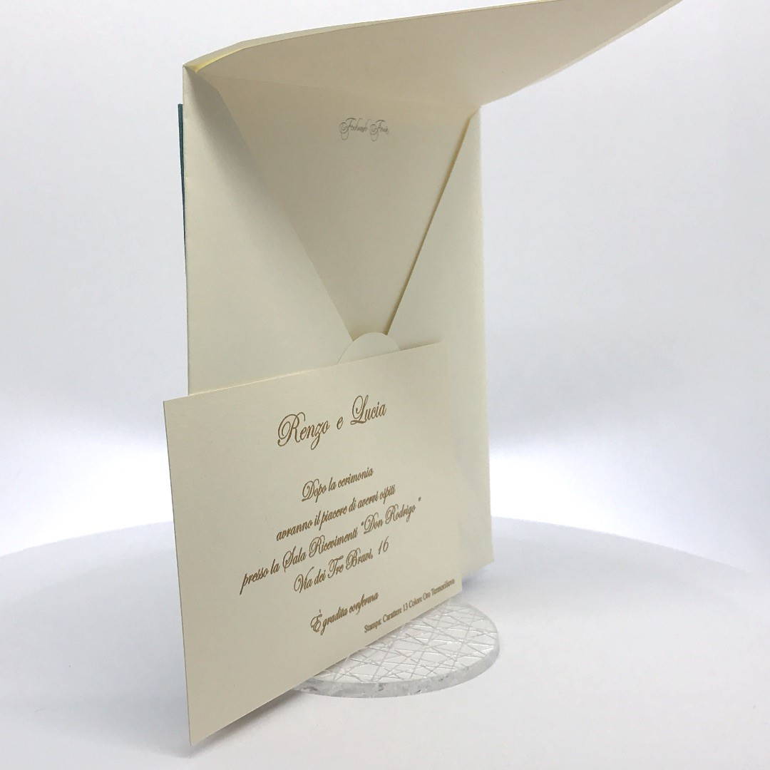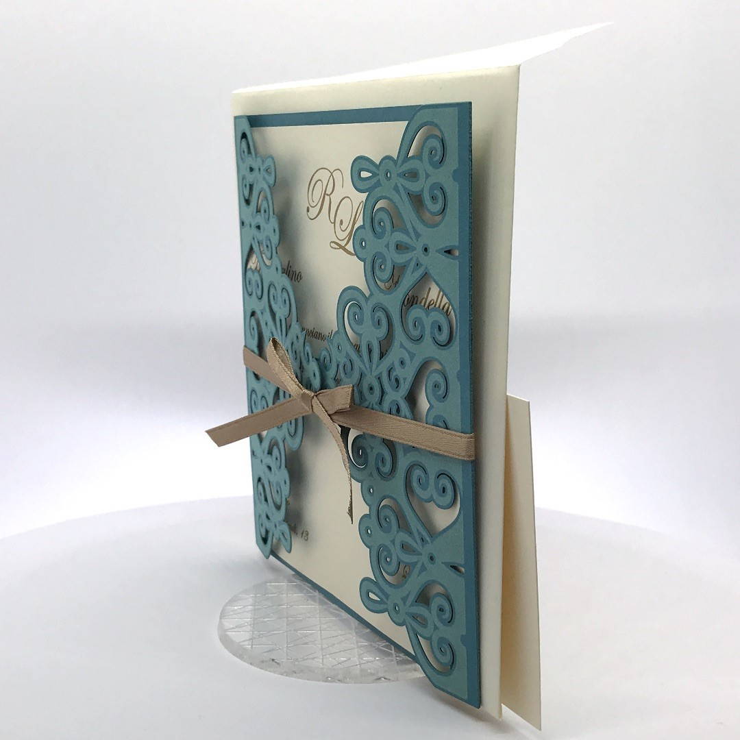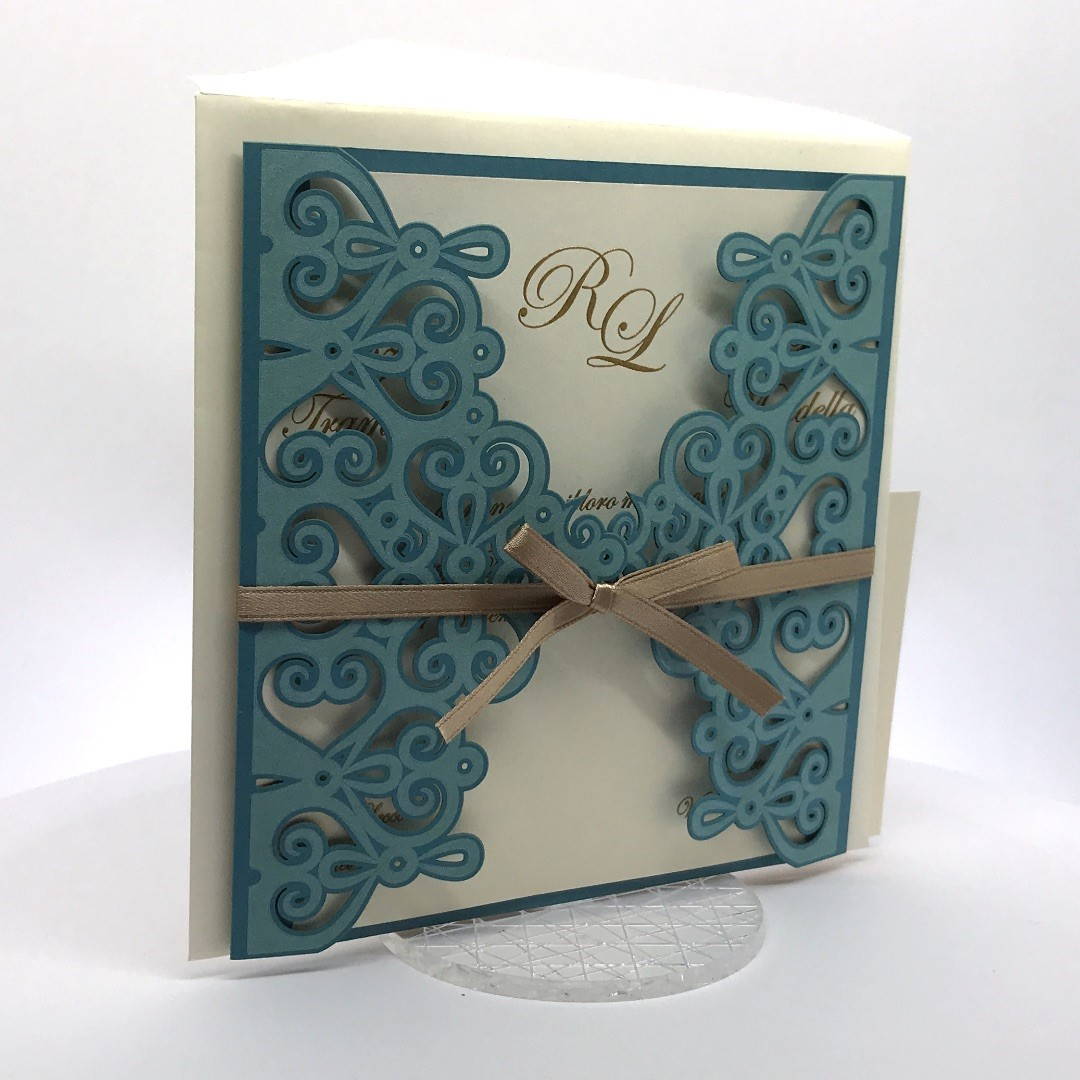 Esterno in carta verde con ghirigori intagliati a laser ed interno in carta perlata avorio, chiude la partecipazione un nastro raso marrone.