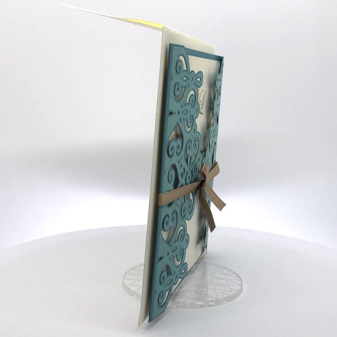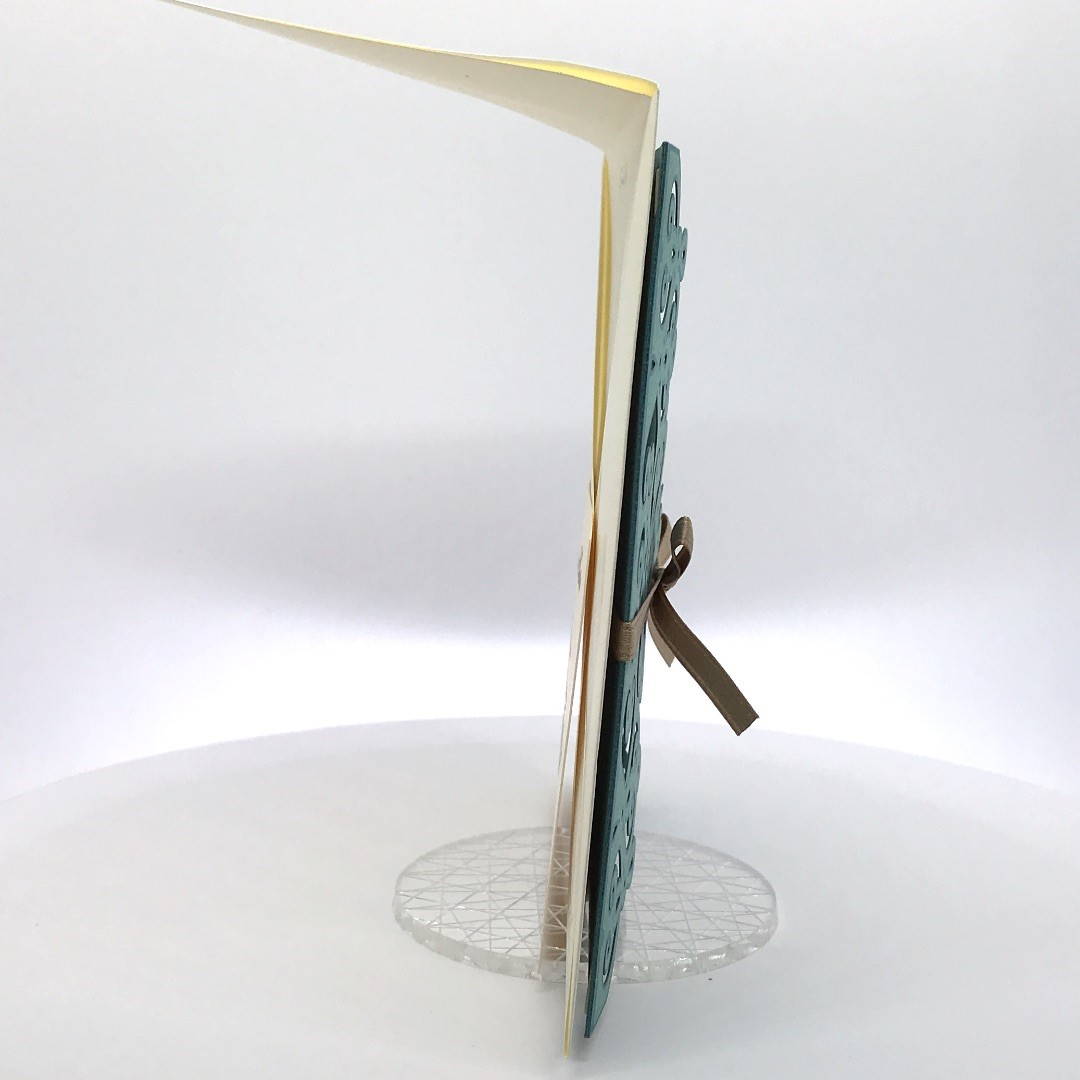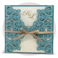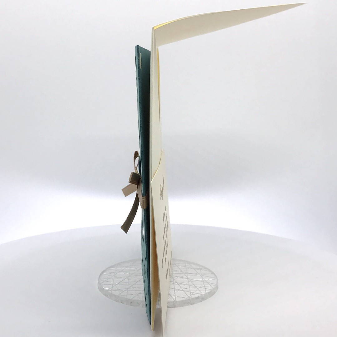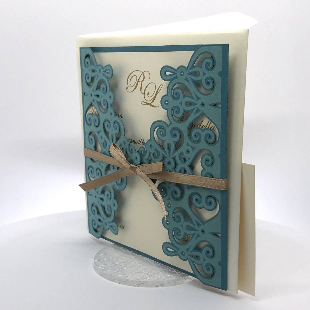 Esterno in carta verde con ghirigori intagliati a laser ed interno in carta perlata avorio, chiude la partecipazione un nastro raso marrone.