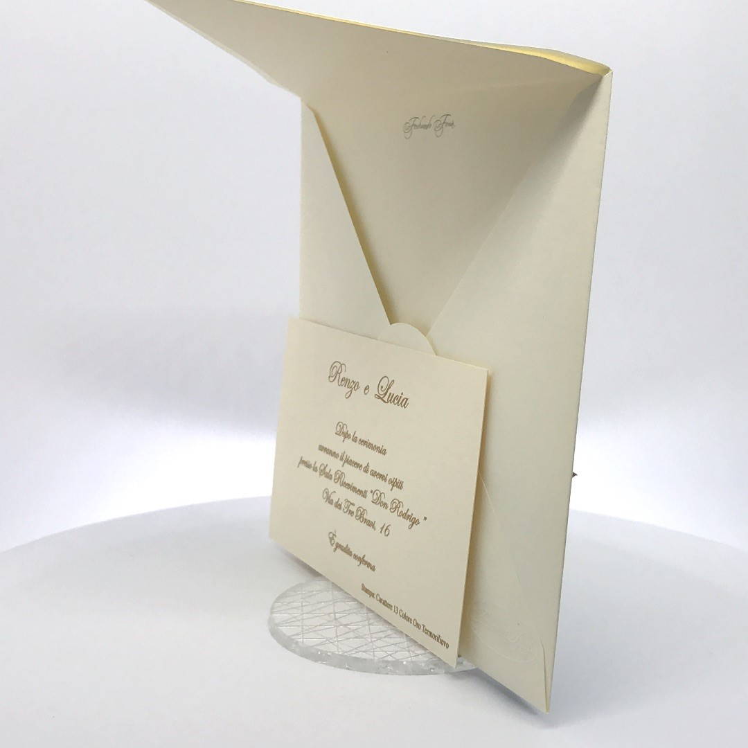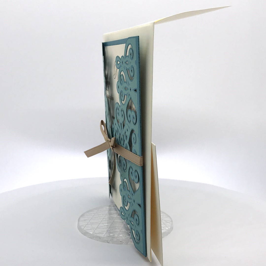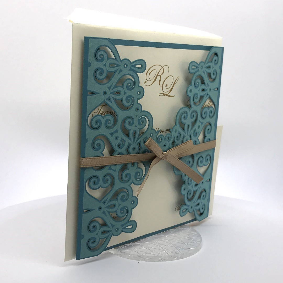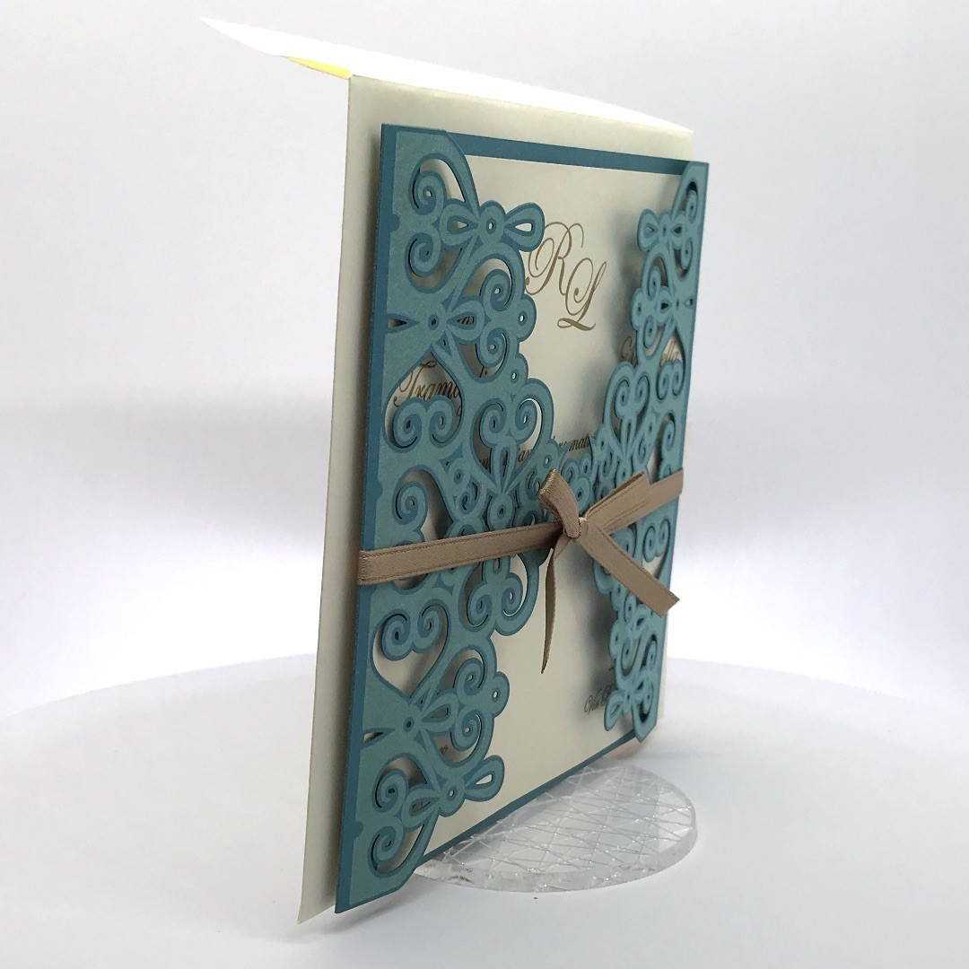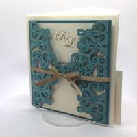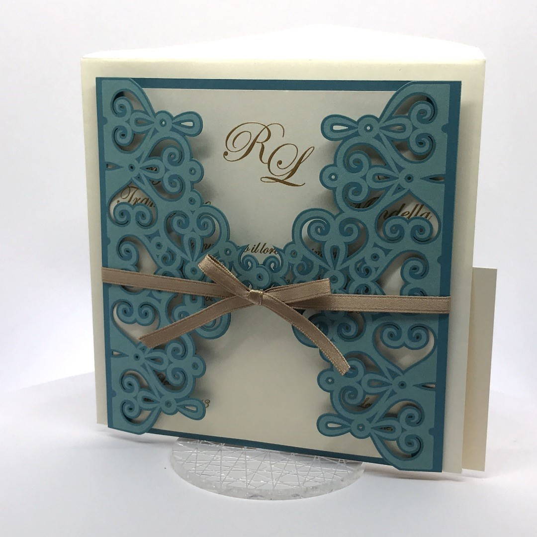 Esterno in carta verde con ghirigori intagliati a laser ed interno in carta perlata avorio, chiude la partecipazione un nastro raso marrone.
