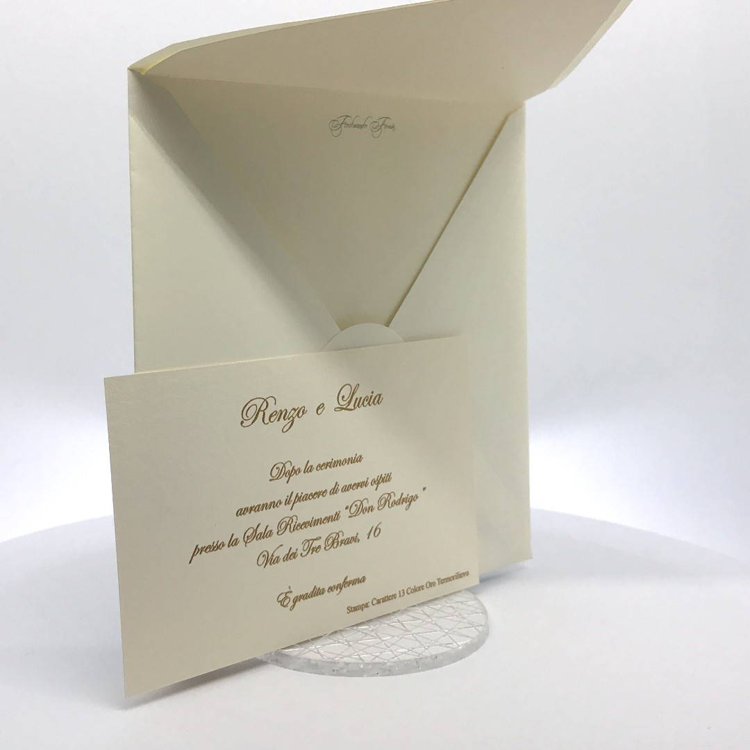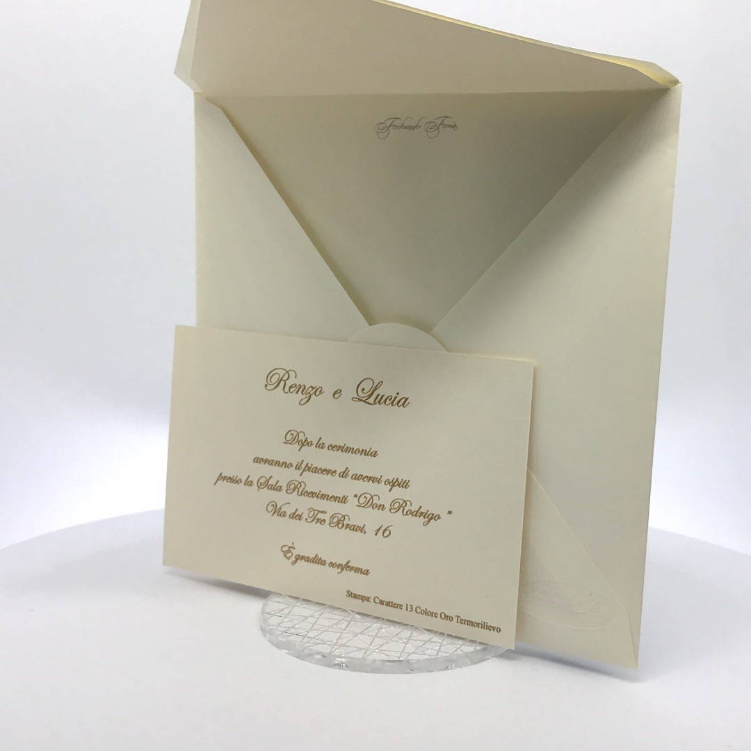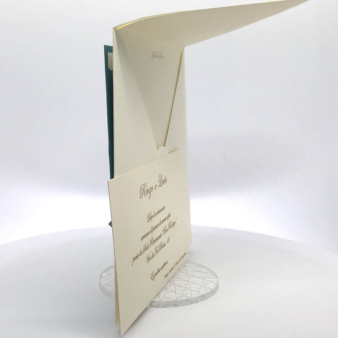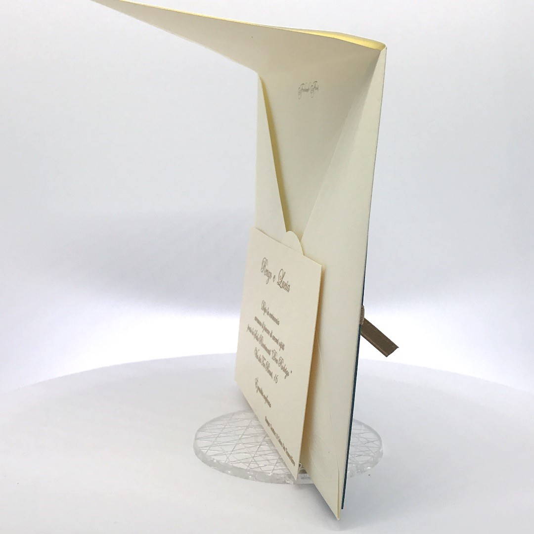 Esterno in carta verde con ghirigori intagliati a laser ed interno in carta perlata avorio, chiude la partecipazione un nastro raso marrone.