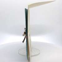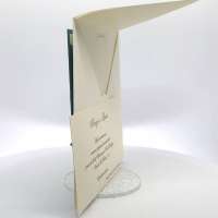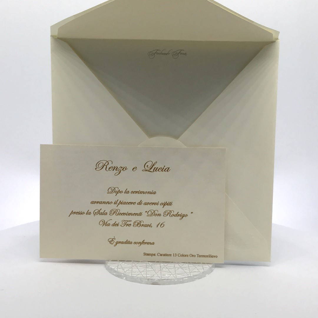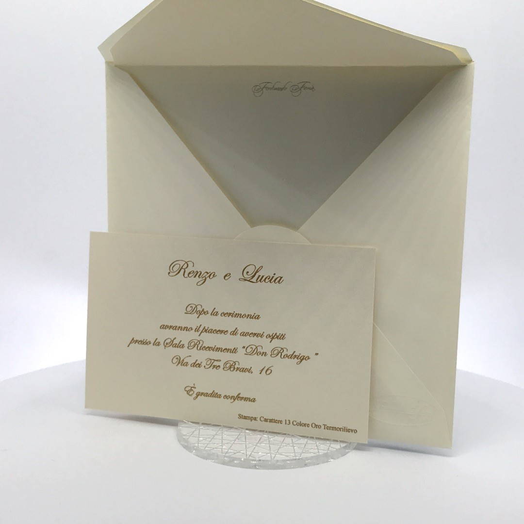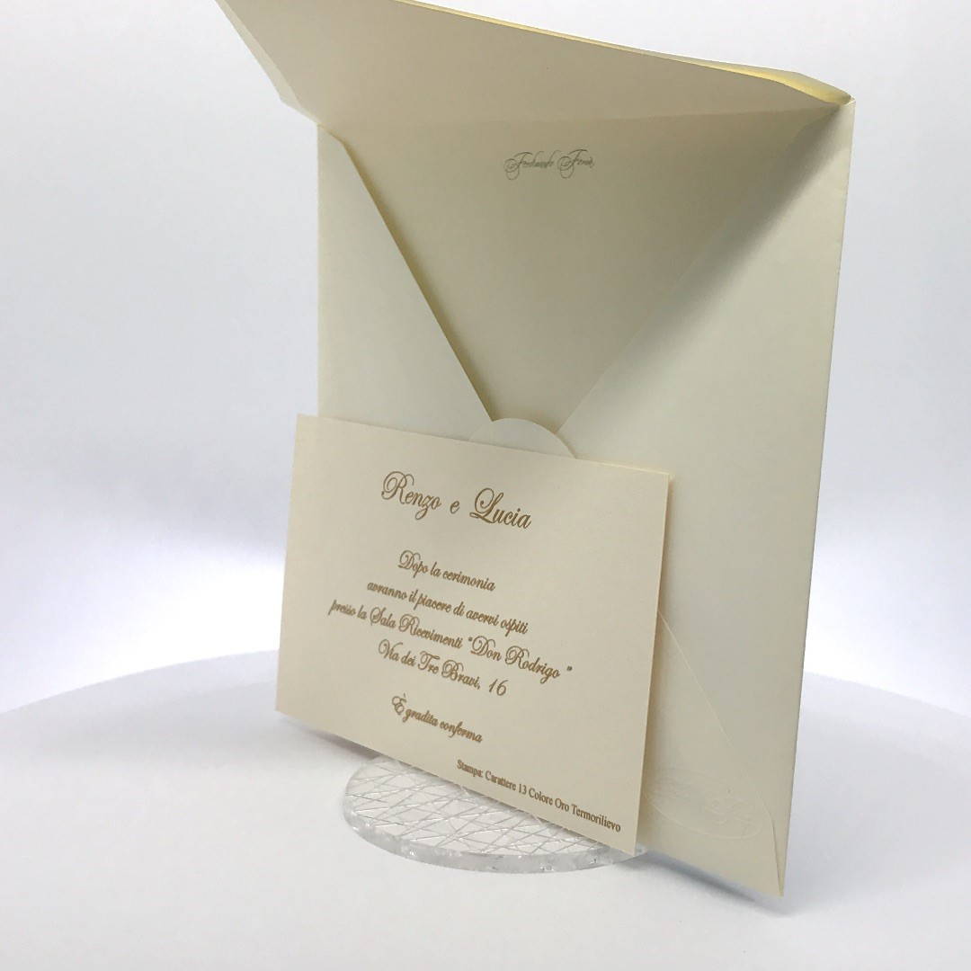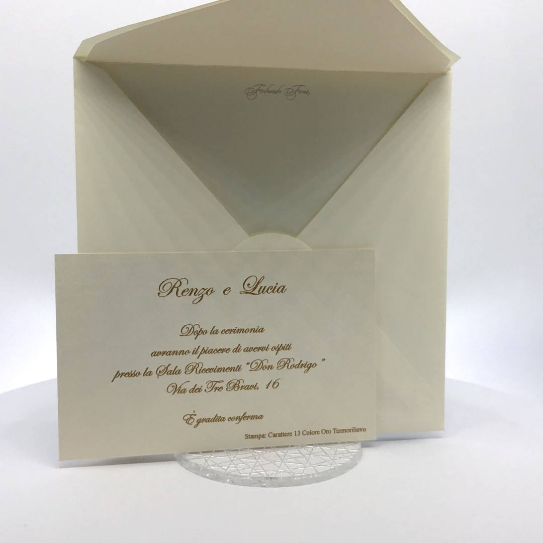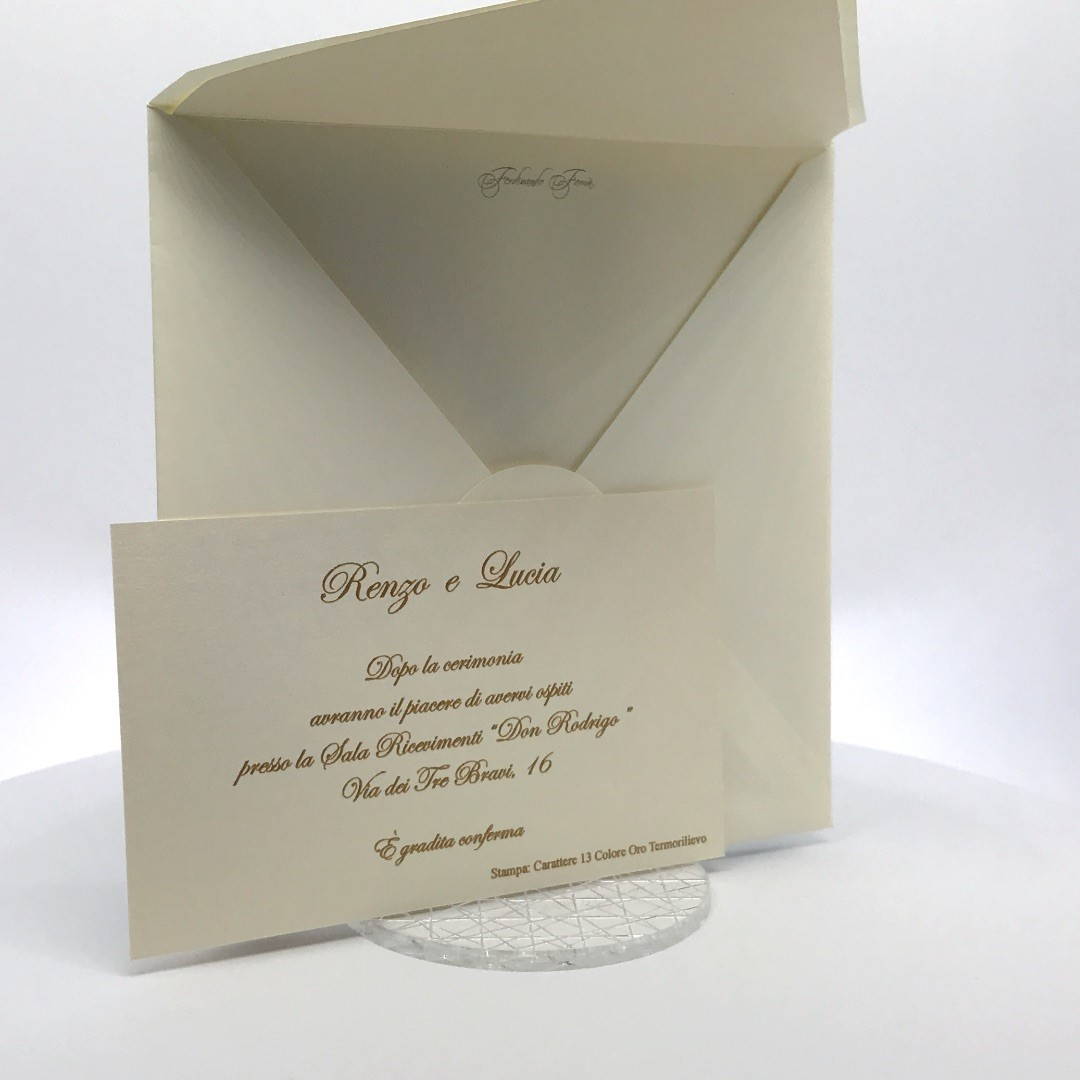 Esterno in carta verde con ghirigori intagliati a laser ed interno in carta perlata avorio, chiude la partecipazione un nastro raso marrone.