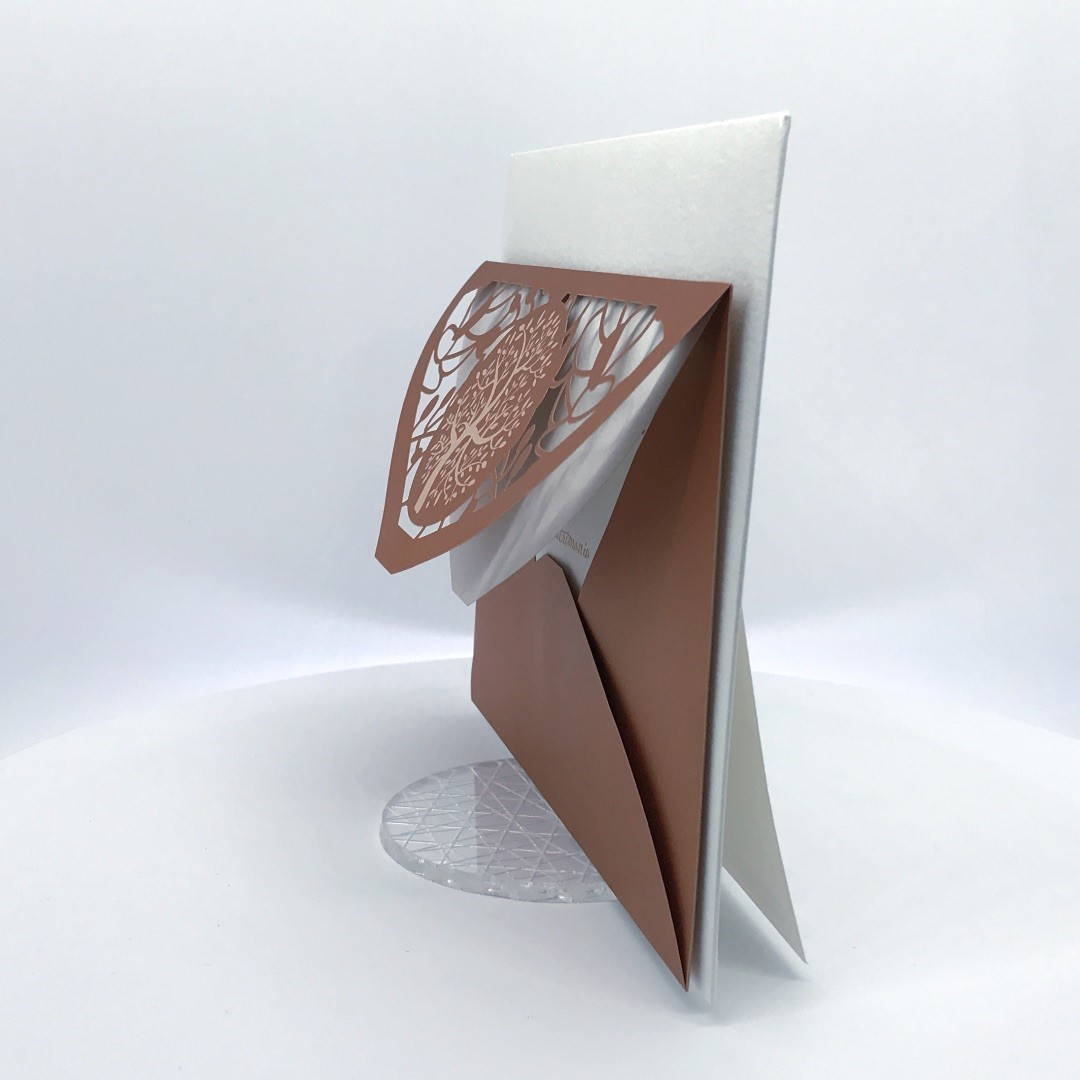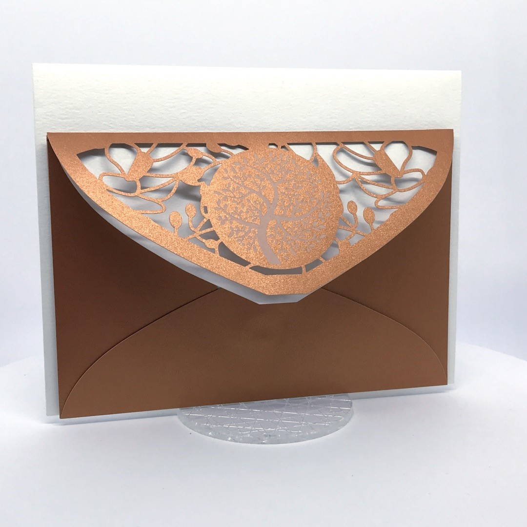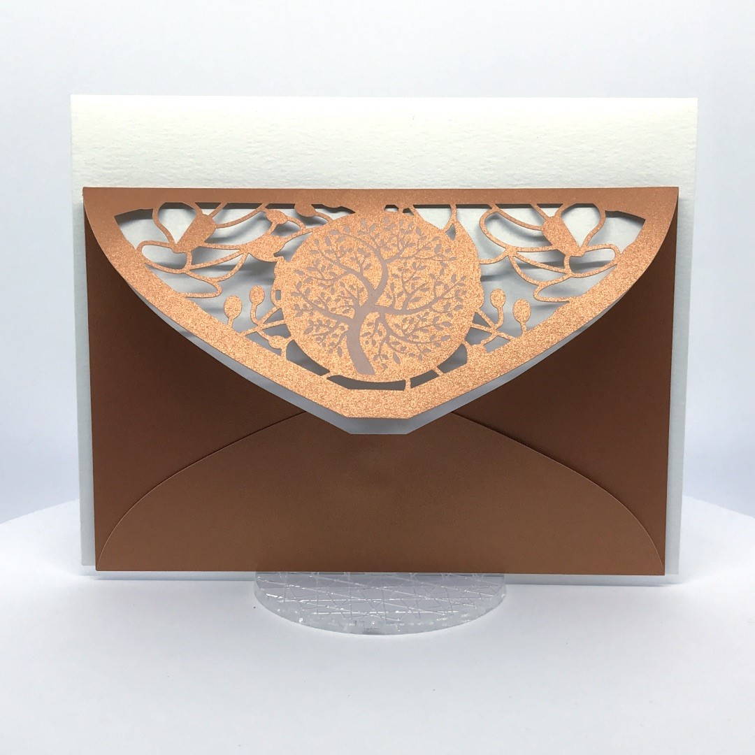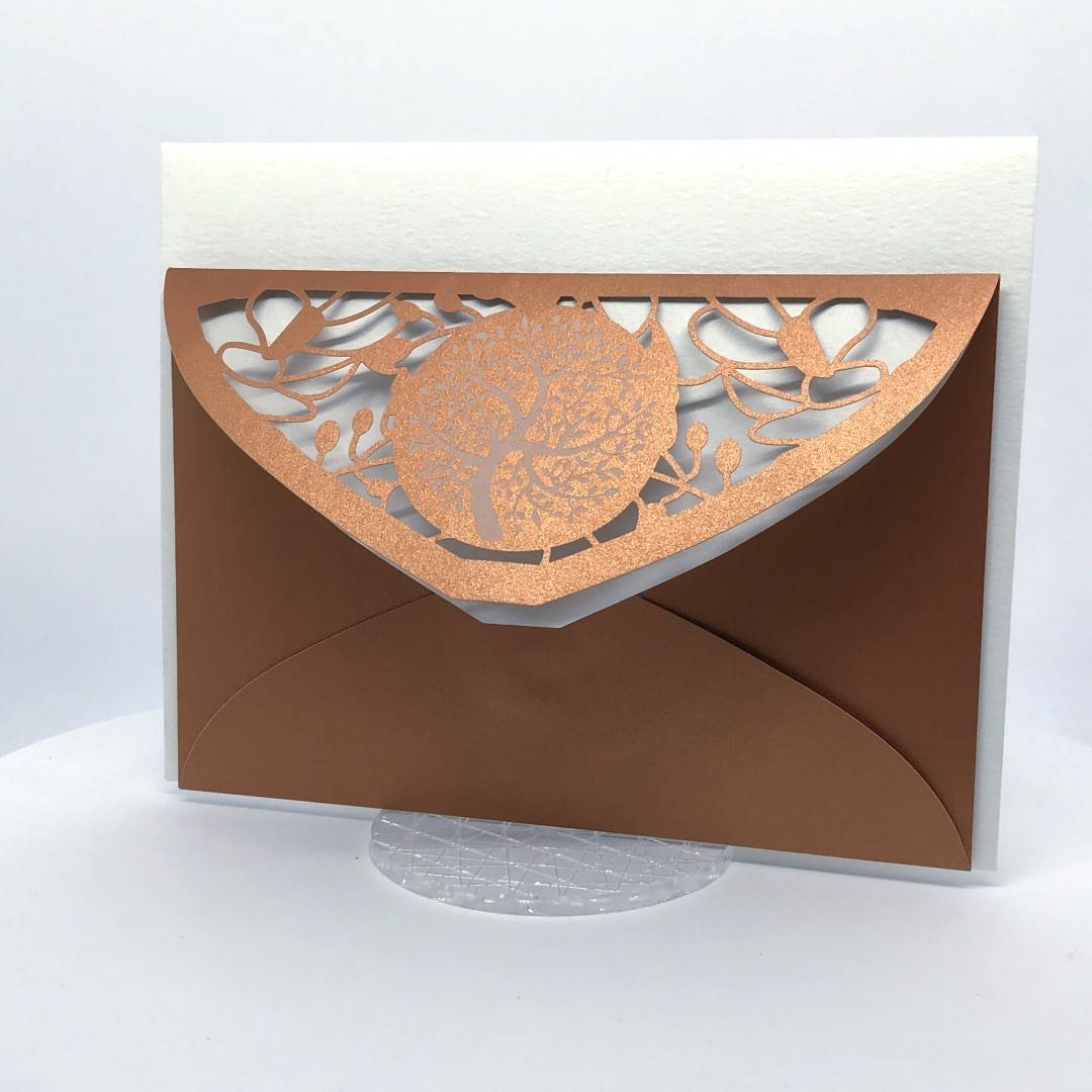 La custodia esterna è realizzata su carta perlata color rame con albero della vita inciso a laser e decori intagliati a laser, interno realizzato su carta martellata panna.