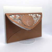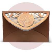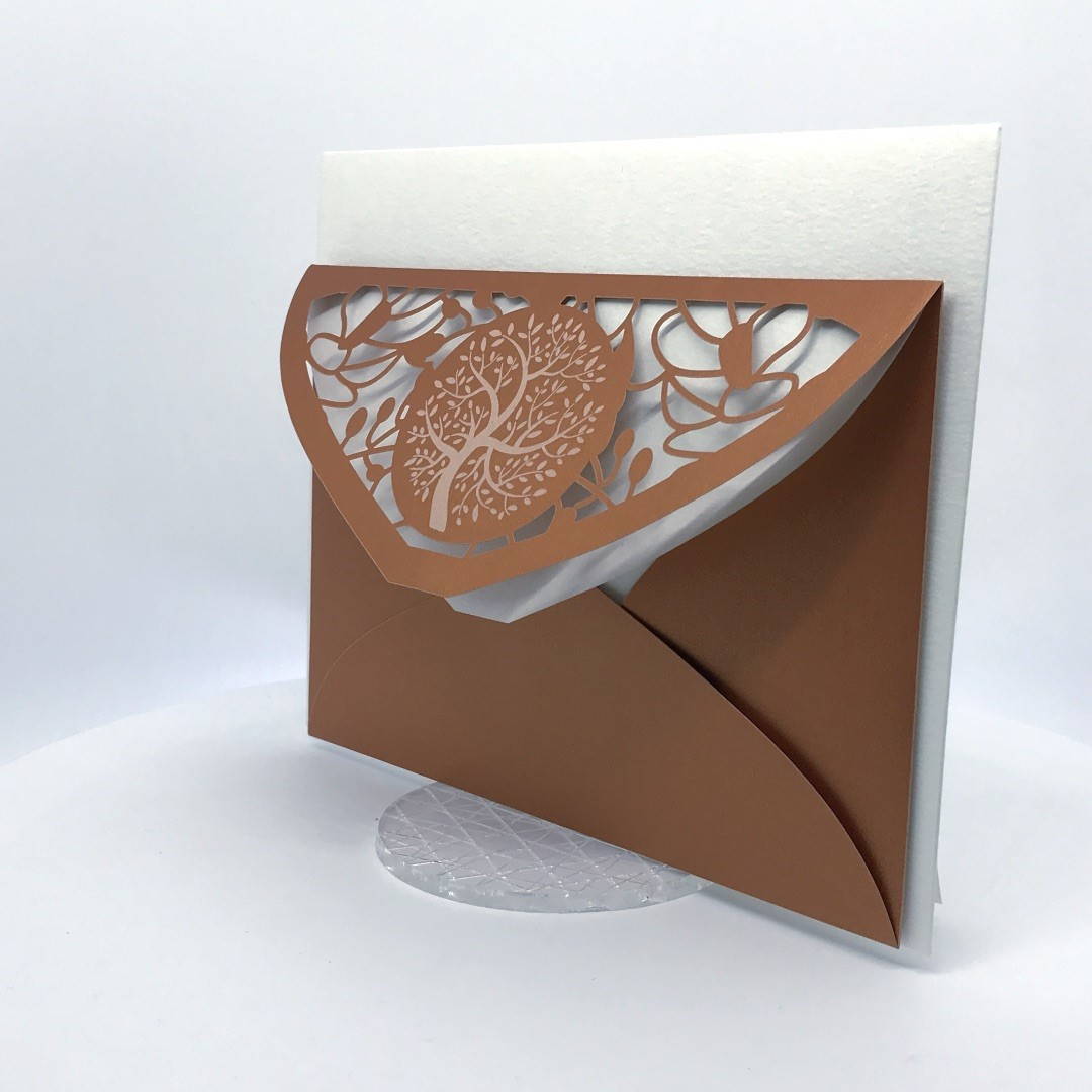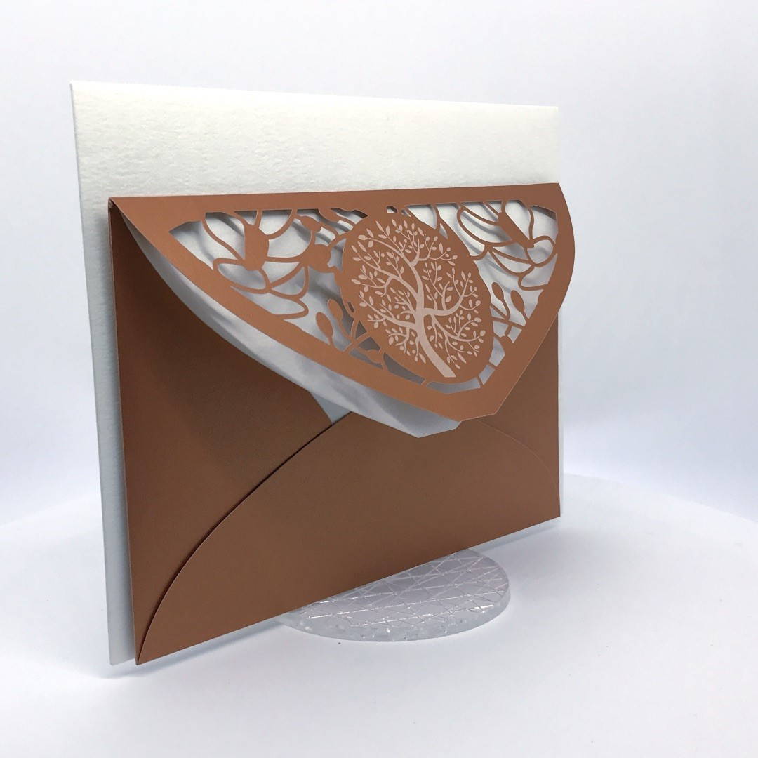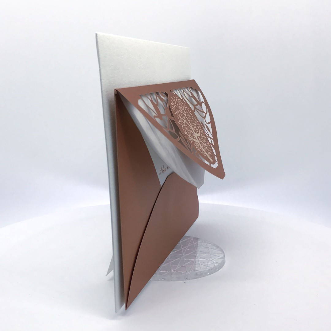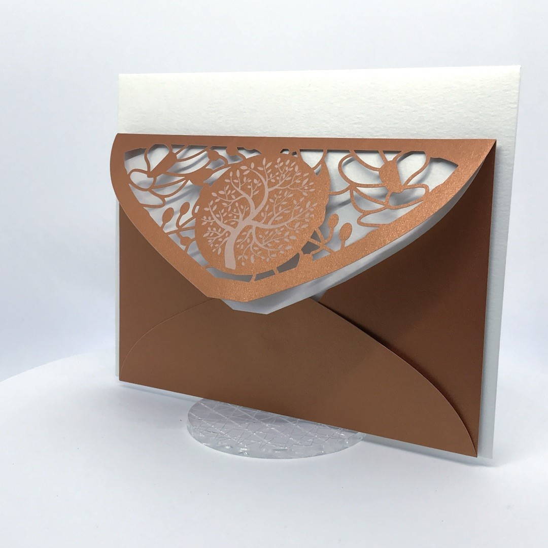 La custodia esterna è realizzata su carta perlata color rame con albero della vita inciso a laser e decori intagliati a laser, interno realizzato su carta martellata panna.