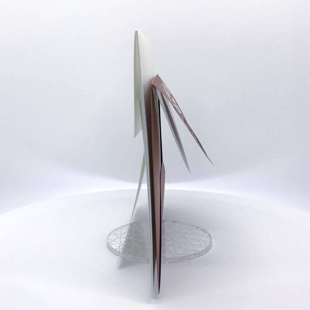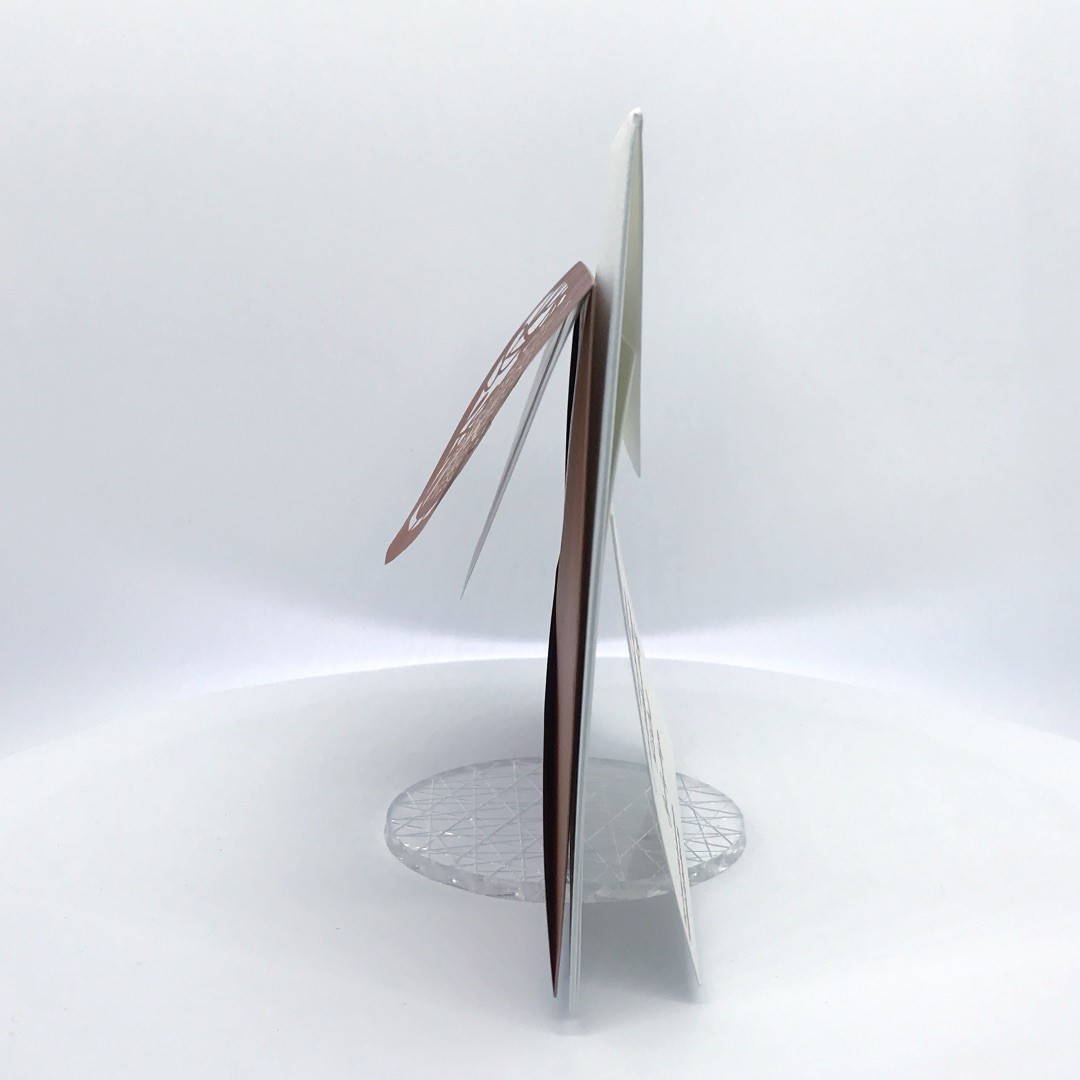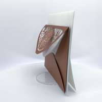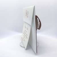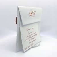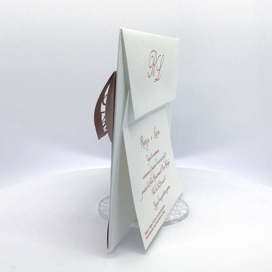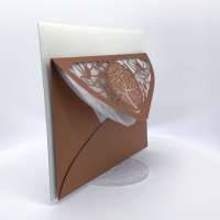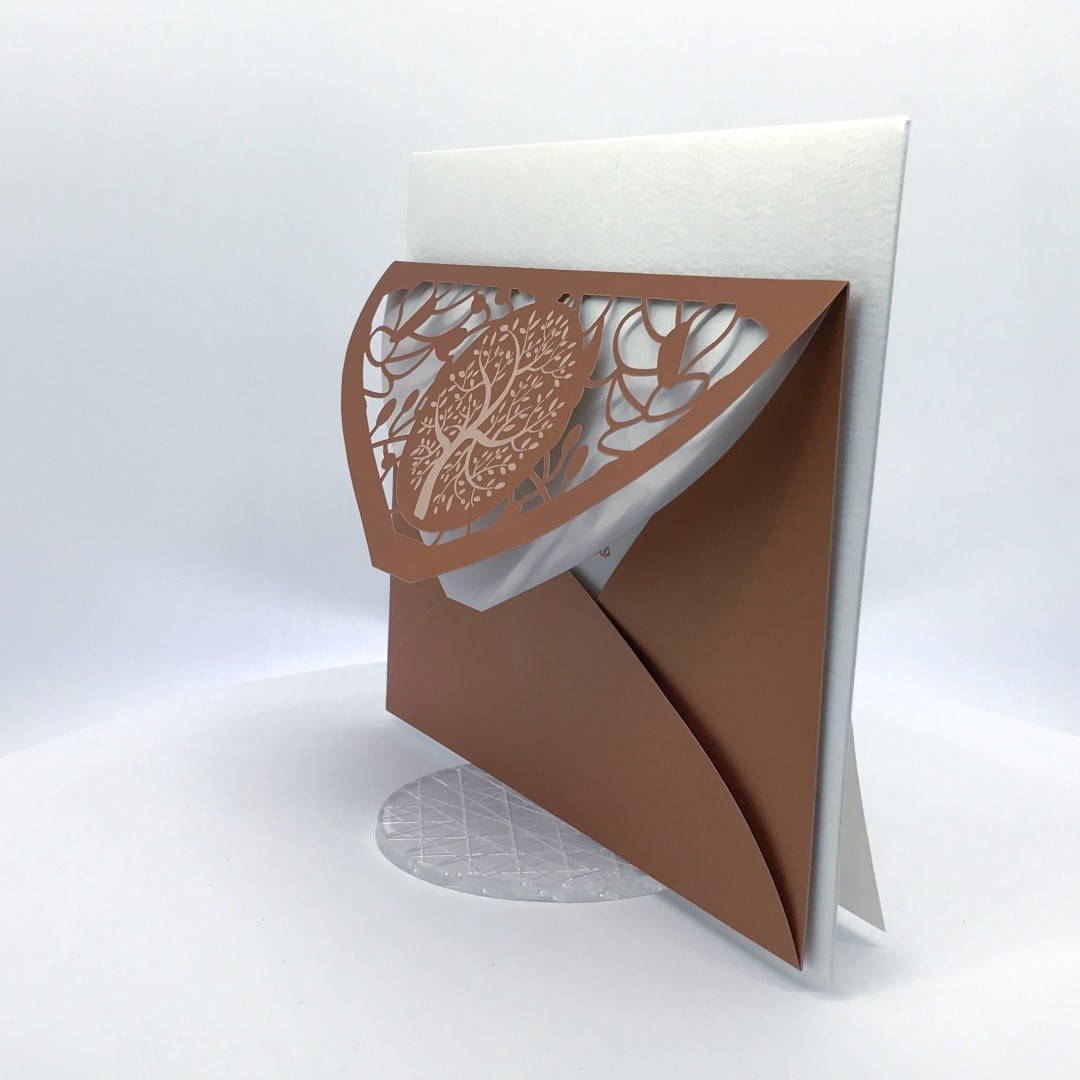 La custodia esterna è realizzata su carta perlata color rame con albero della vita inciso a laser e decori intagliati a laser, interno realizzato su carta martellata panna.