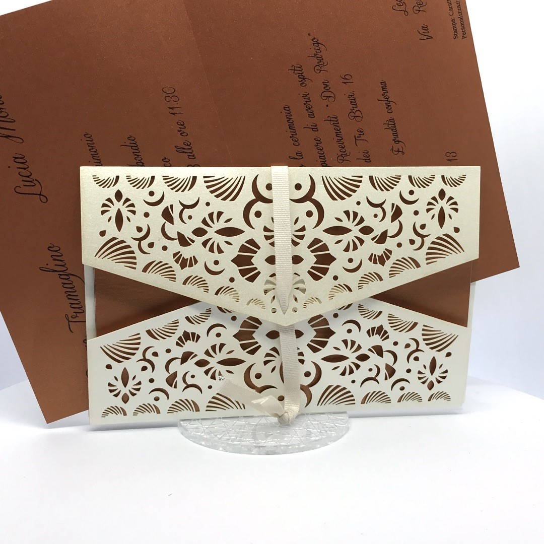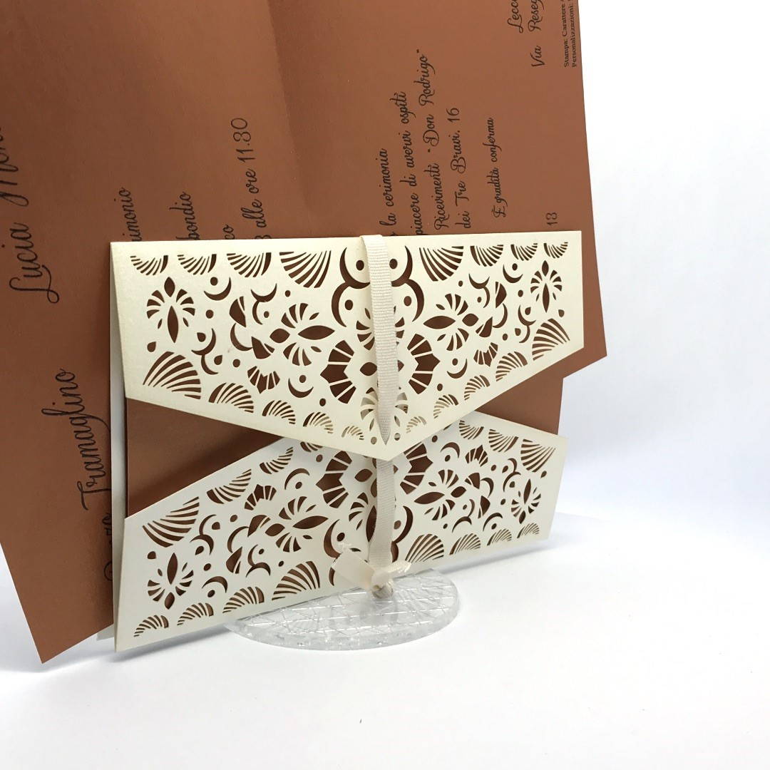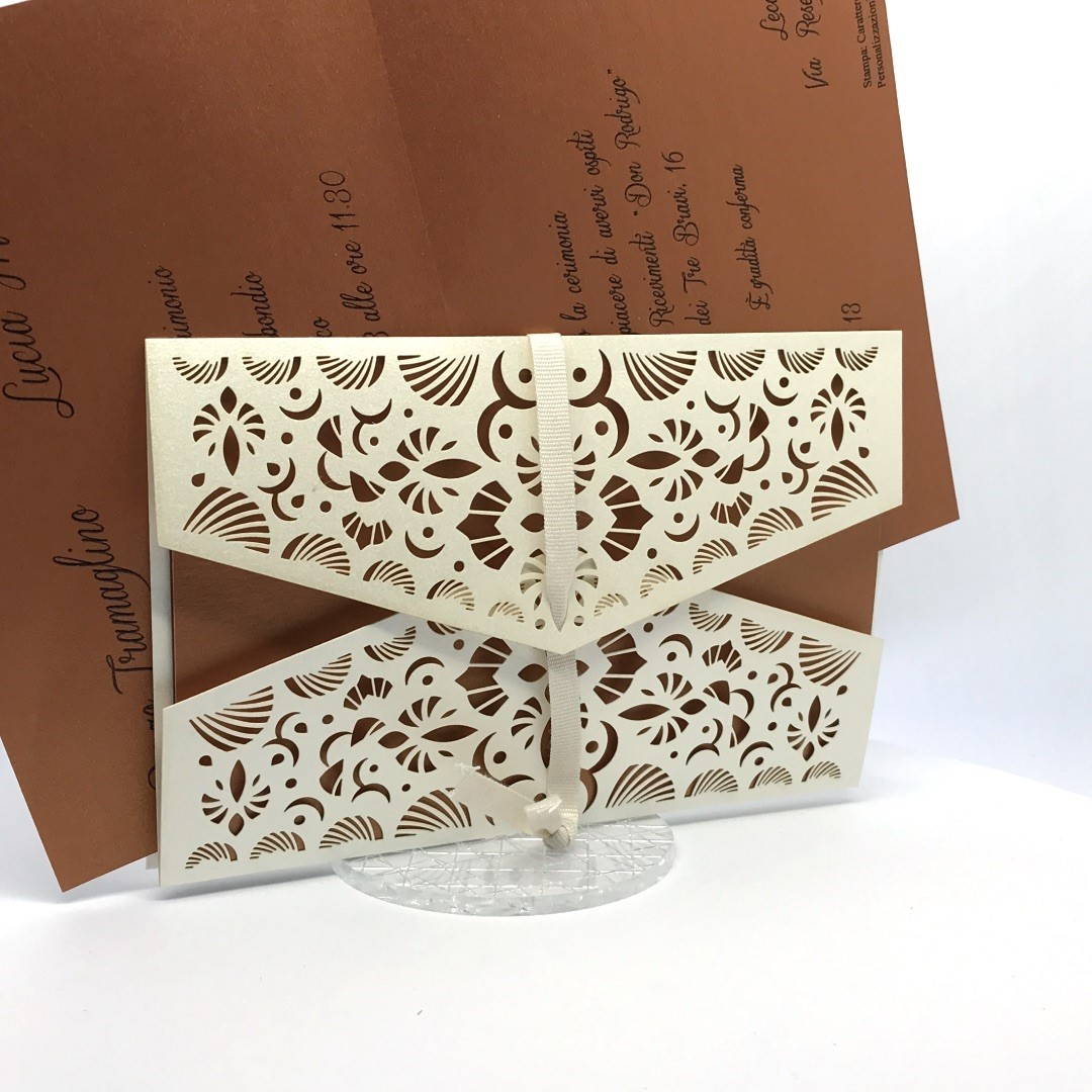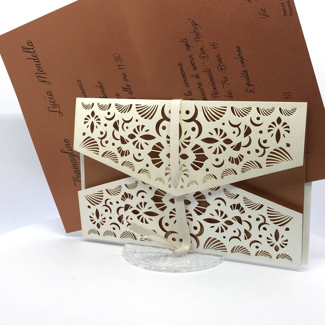 La custodia esterna è realizzata su carta perlata avorio con decori intagliati a laser,interno realizzato su carta perlata color rame, invito incluso nella partecipazione.
