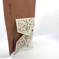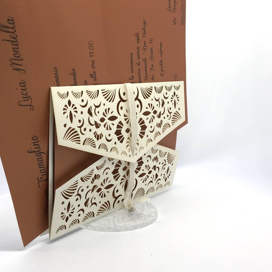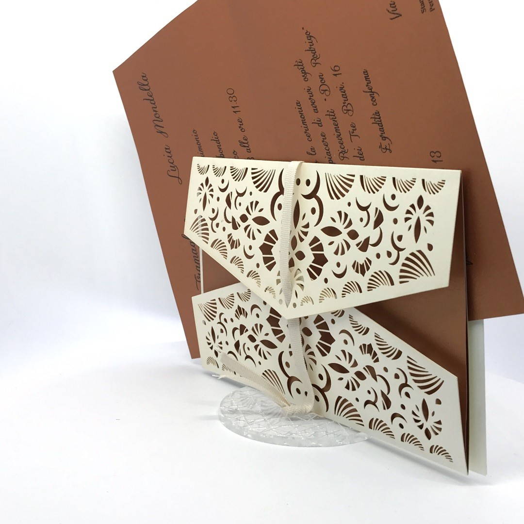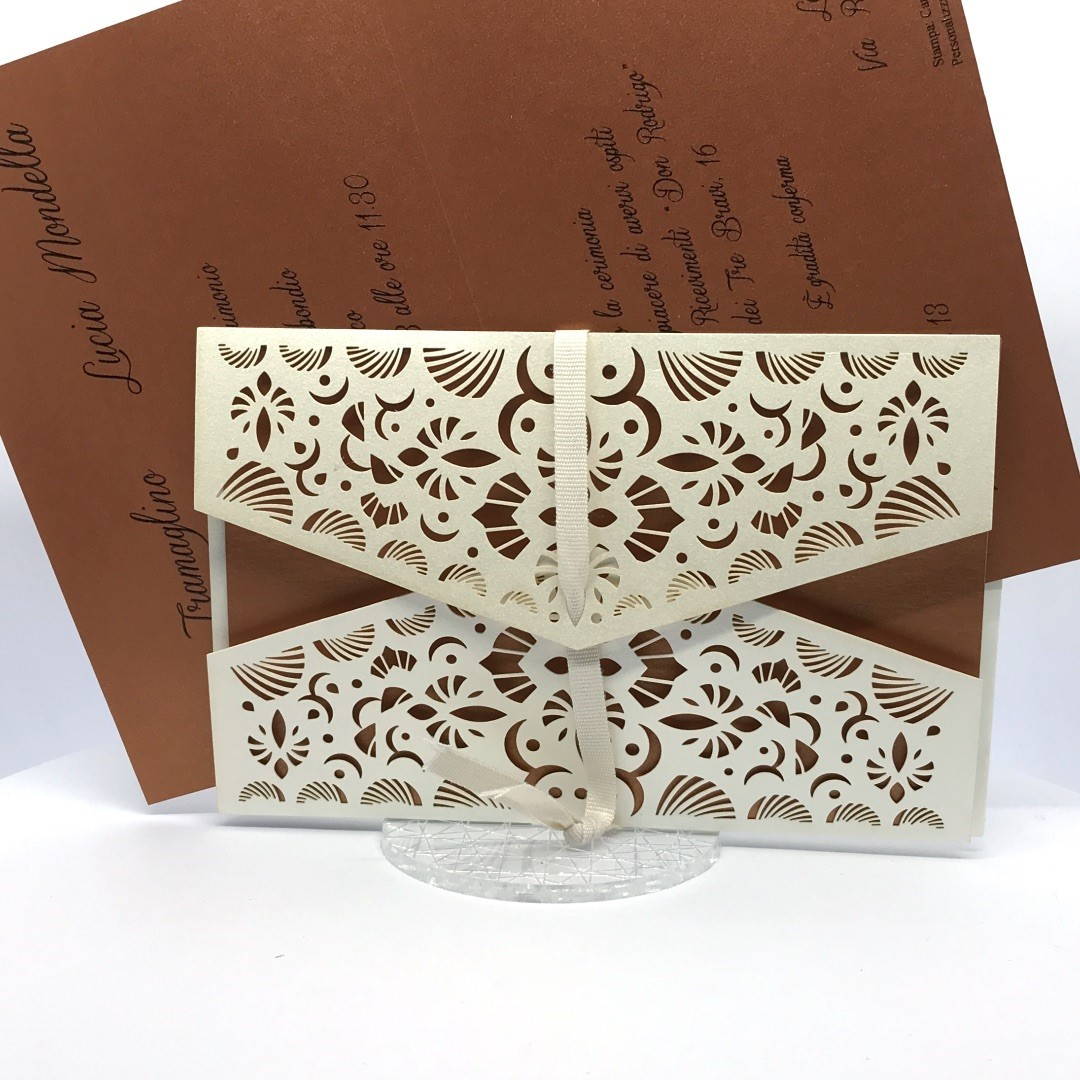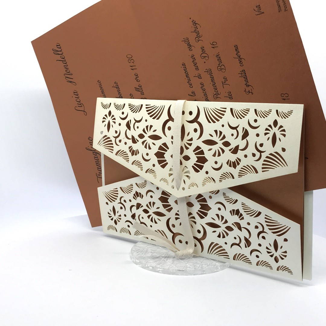 La custodia esterna è realizzata su carta perlata avorio con decori intagliati a laser,interno realizzato su carta perlata color rame, invito incluso nella partecipazione.