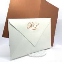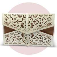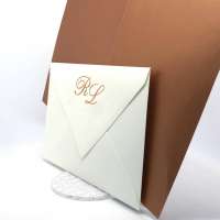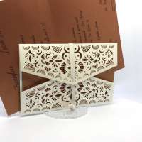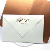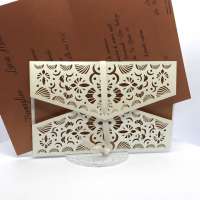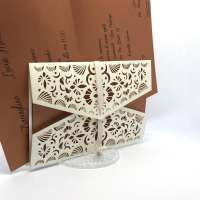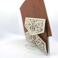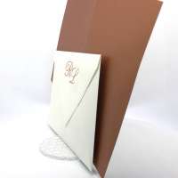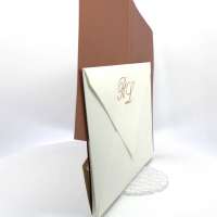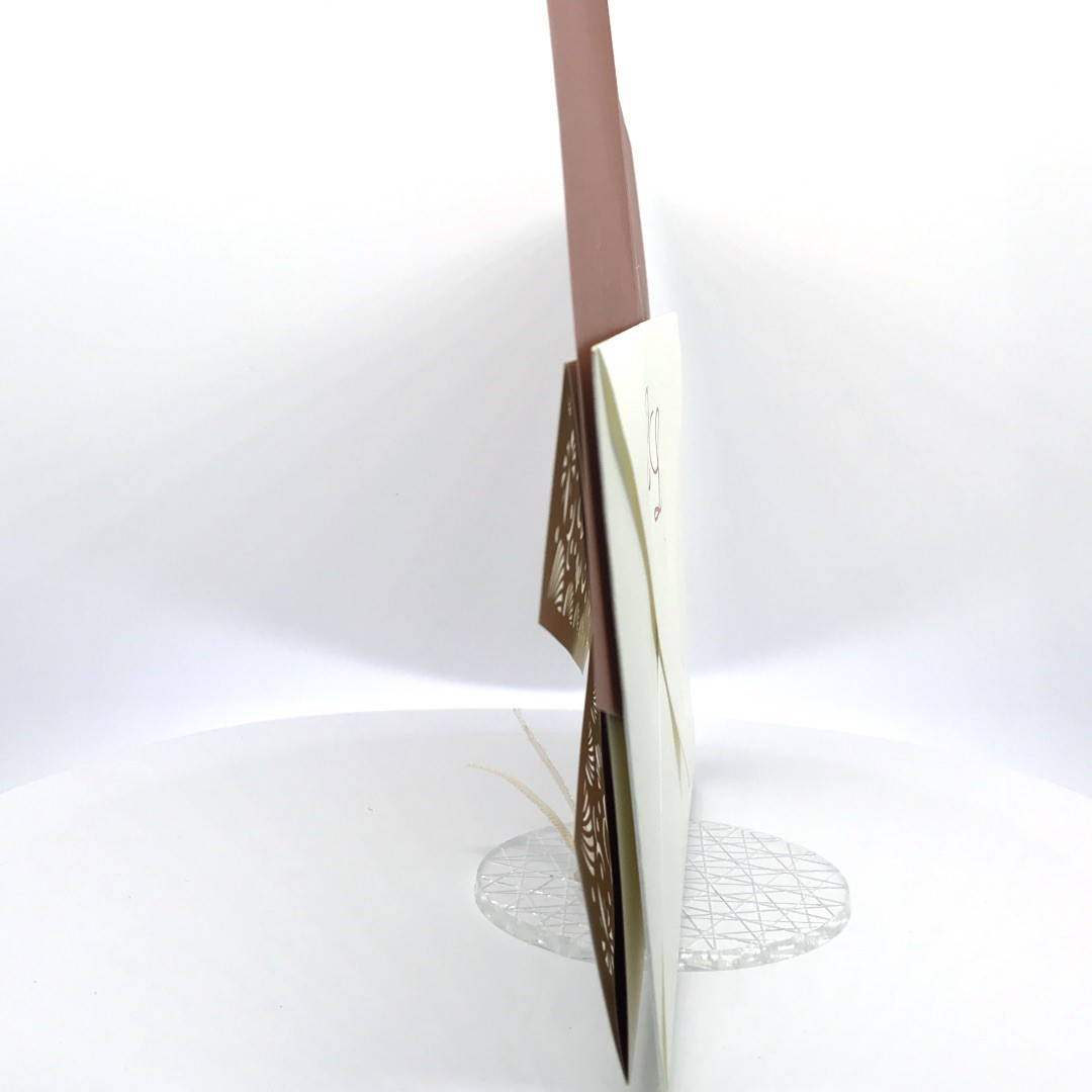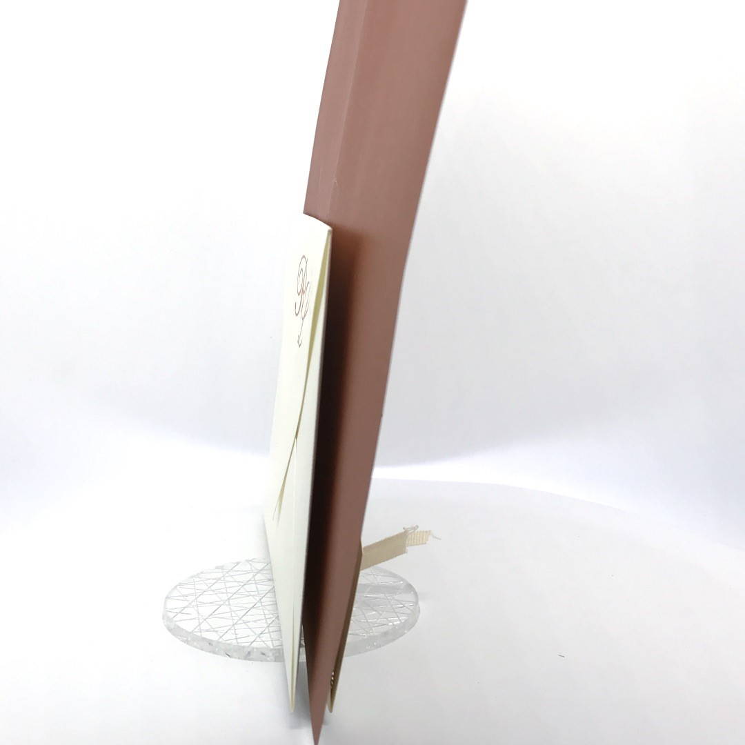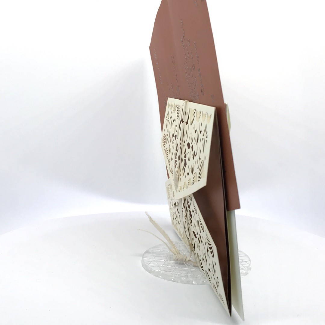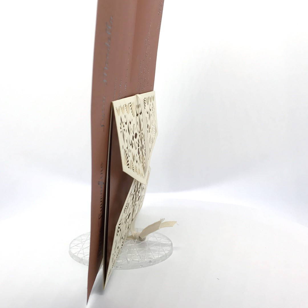 La custodia esterna è realizzata su carta perlata avorio con decori intagliati a laser,interno realizzato su carta perlata color rame, invito incluso nella partecipazione.