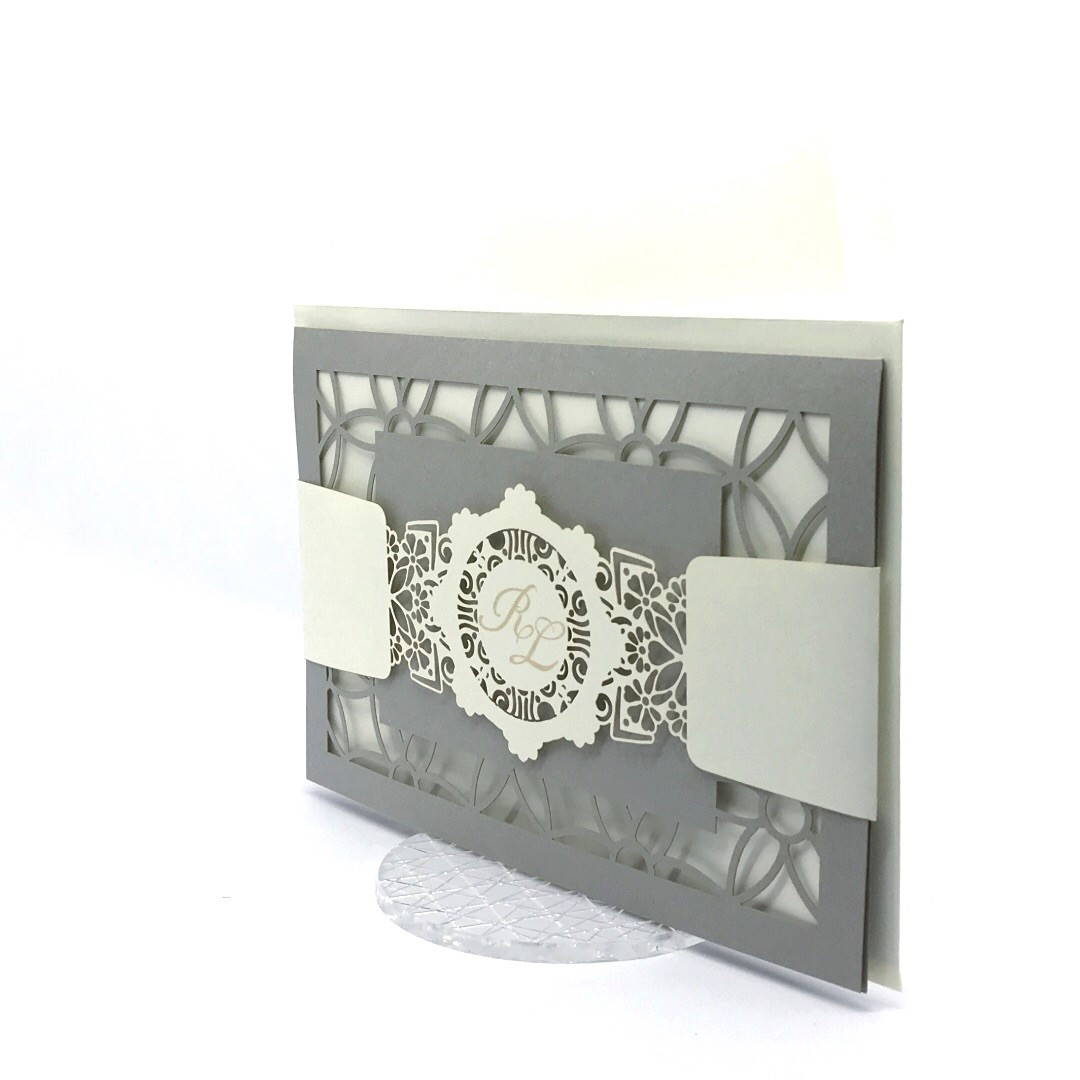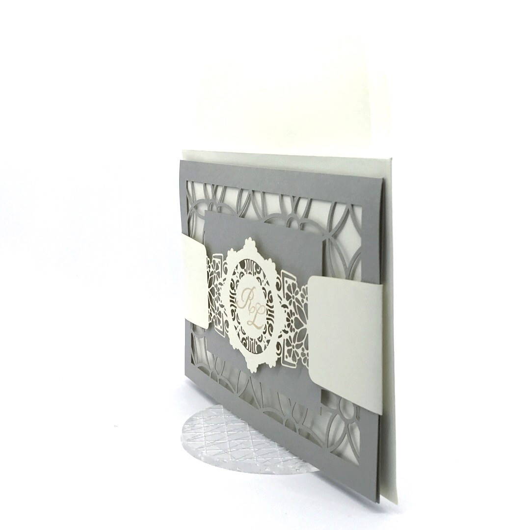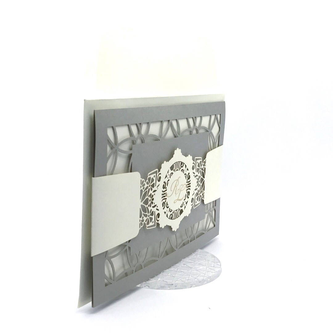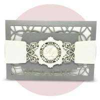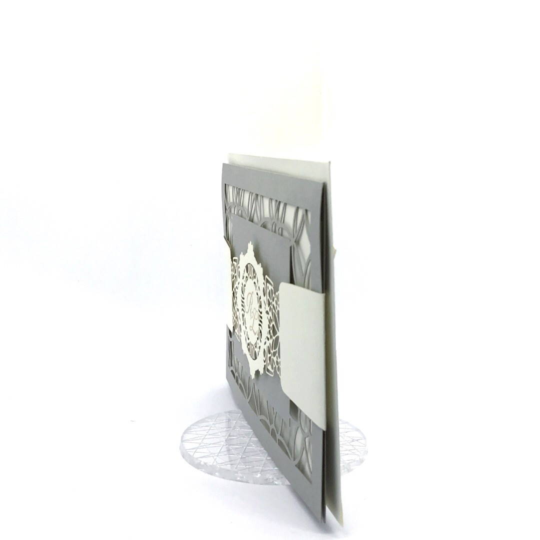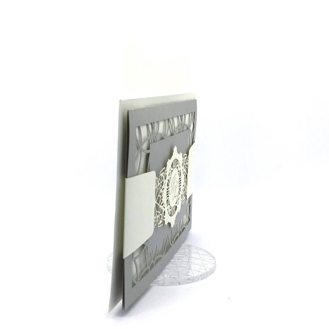 La custodia esterna è realizzata su carta color grigio/tortora con fiori intagliati a laser, l'interno è realizzato su carta avorio, chiude la partecipazione una fascetta intagliata a laser e con le iniziali defli sposi incise a laser realizzata anch'essa su carta avorio.