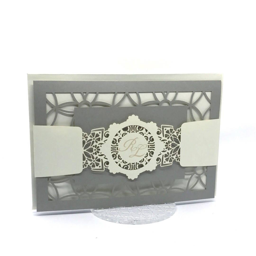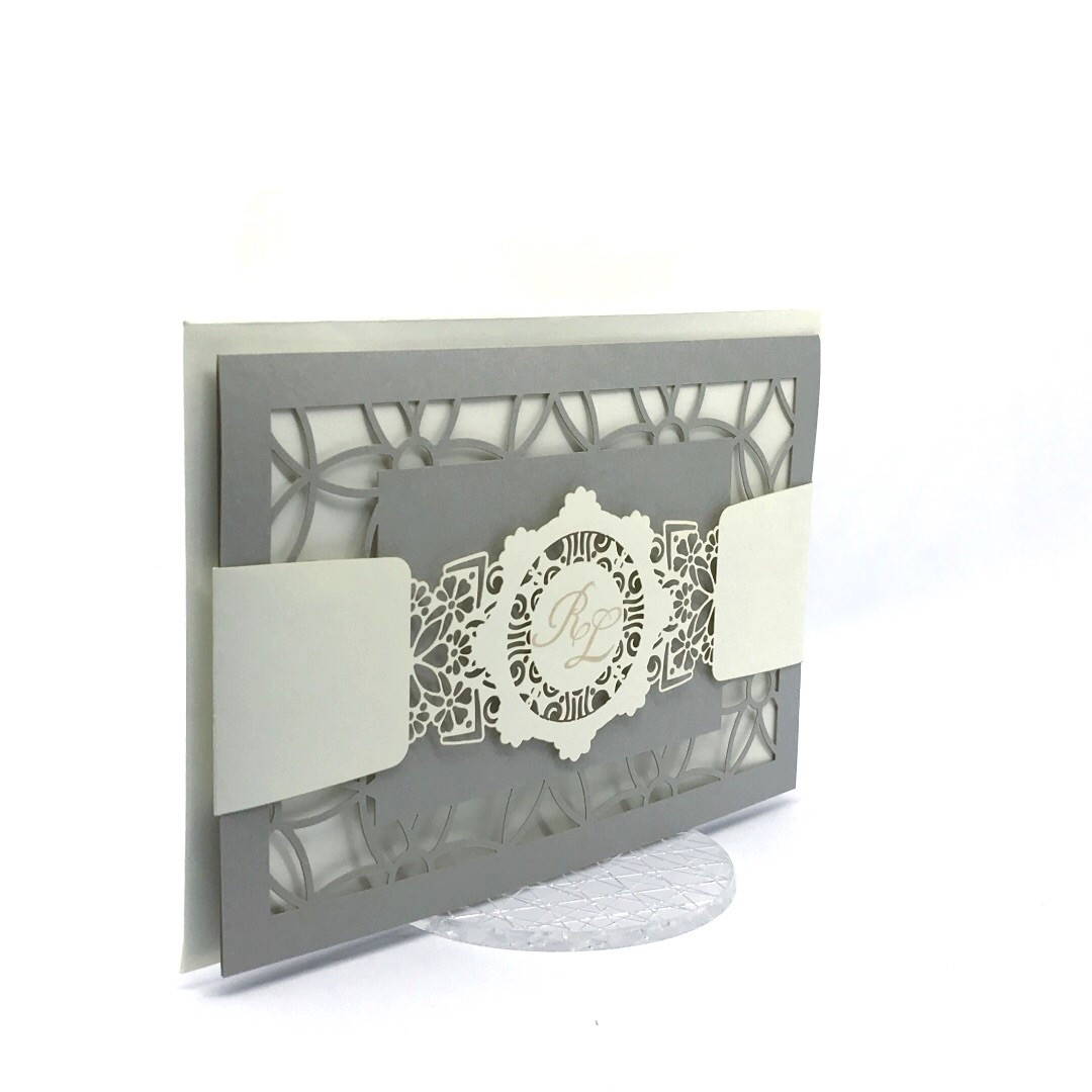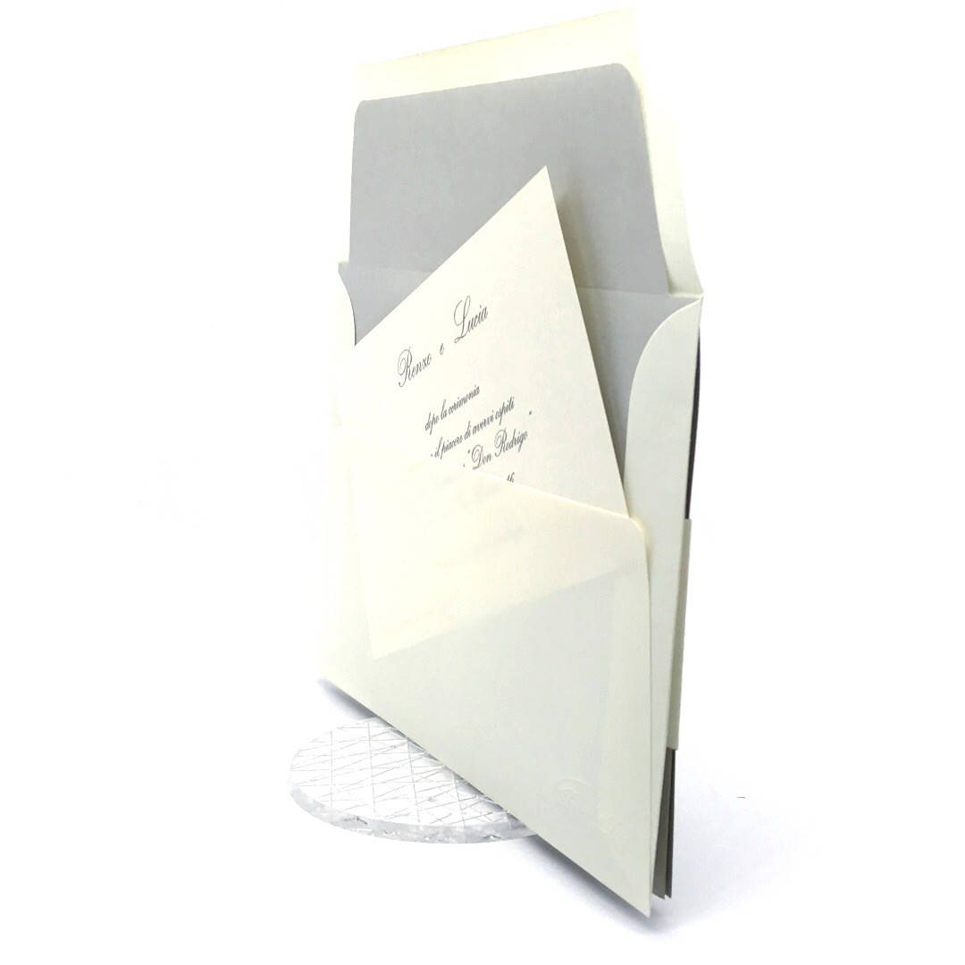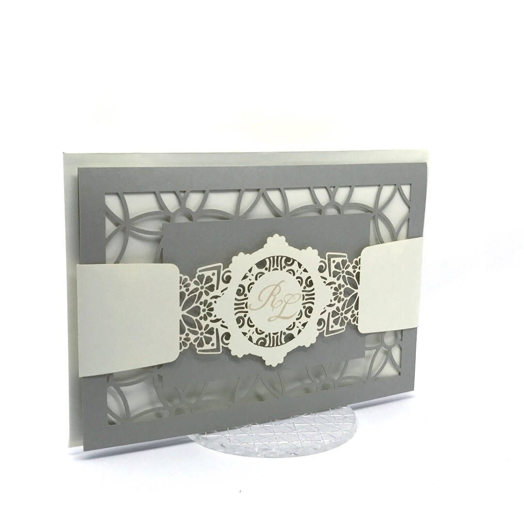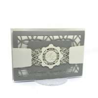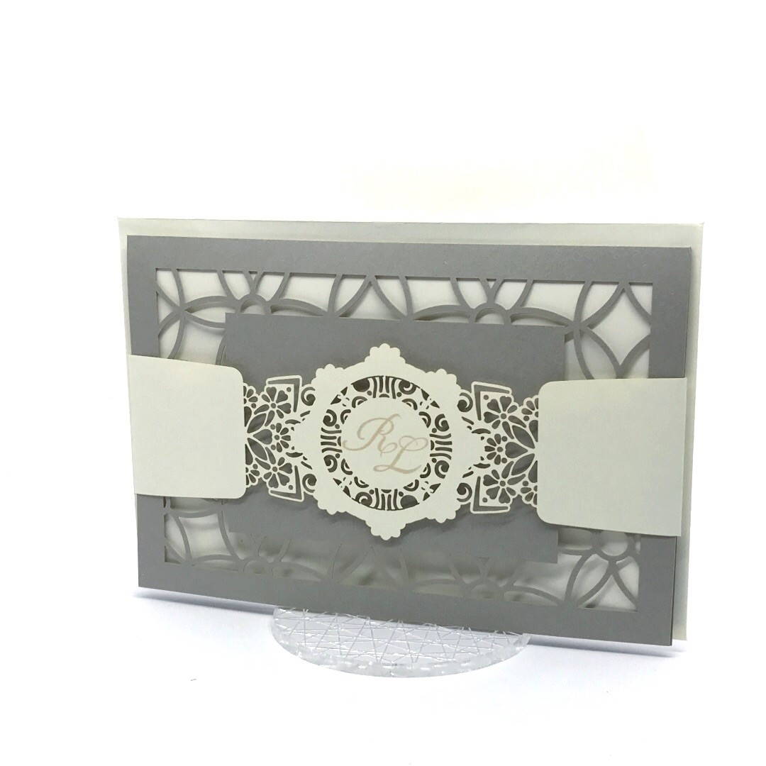 La custodia esterna è realizzata su carta color grigio/tortora con fiori intagliati a laser, l'interno è realizzato su carta avorio, chiude la partecipazione una fascetta intagliata a laser e con le iniziali defli sposi incise a laser realizzata anch'essa su carta avorio.