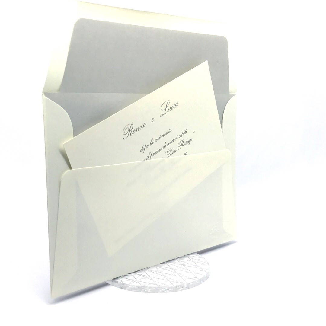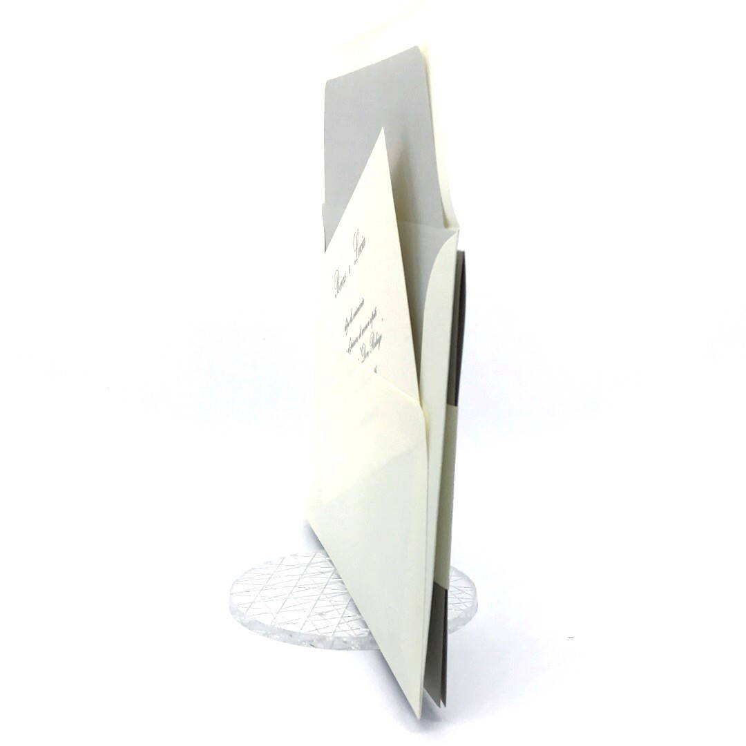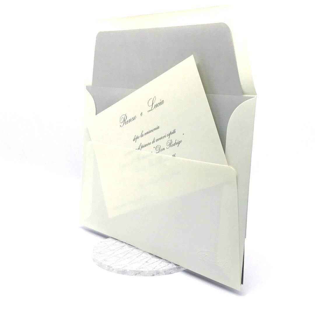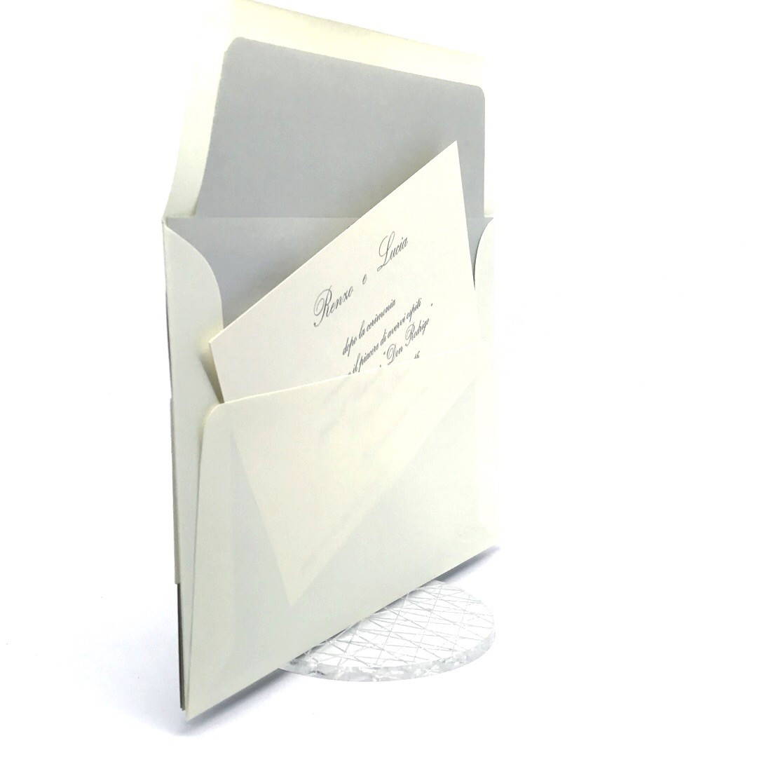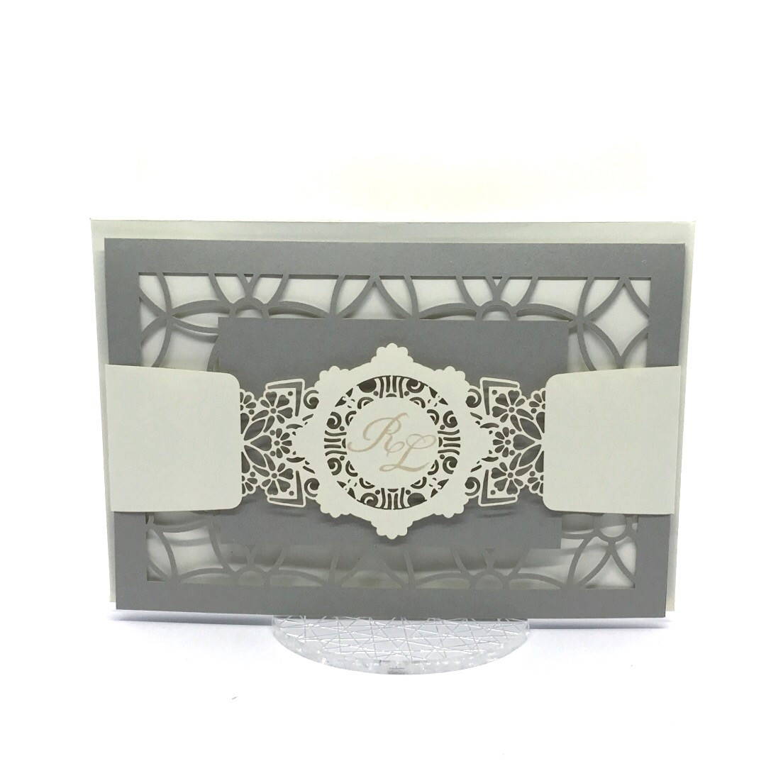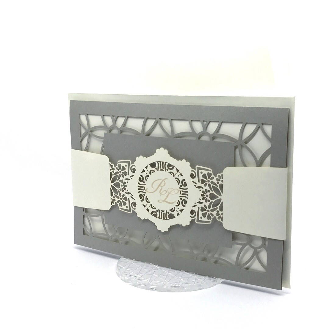 La custodia esterna è realizzata su carta color grigio/tortora con fiori intagliati a laser, l'interno è realizzato su carta avorio, chiude la partecipazione una fascetta intagliata a laser e con le iniziali defli sposi incise a laser realizzata anch'essa su carta avorio.