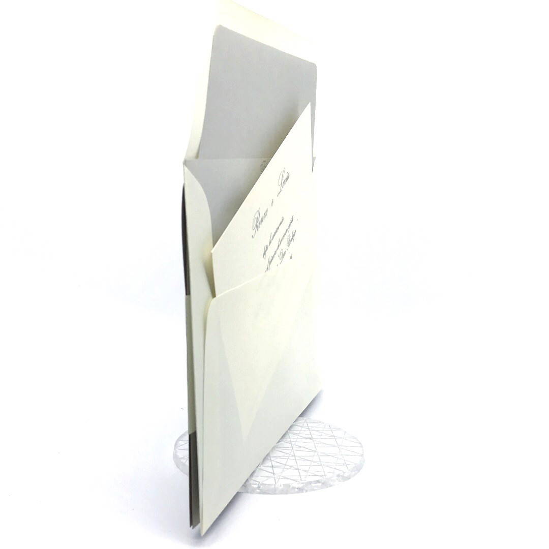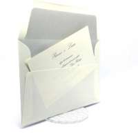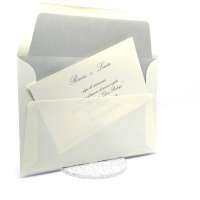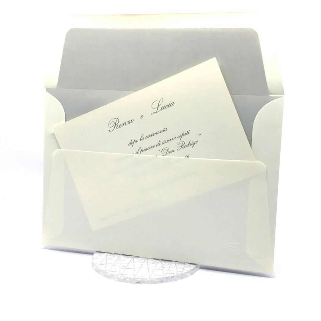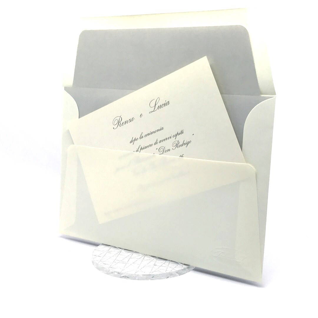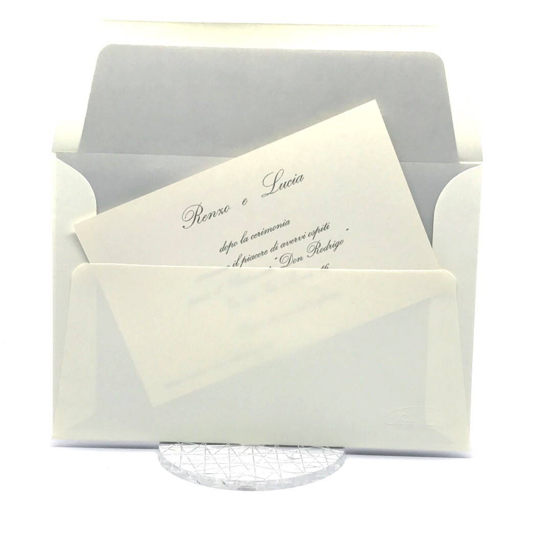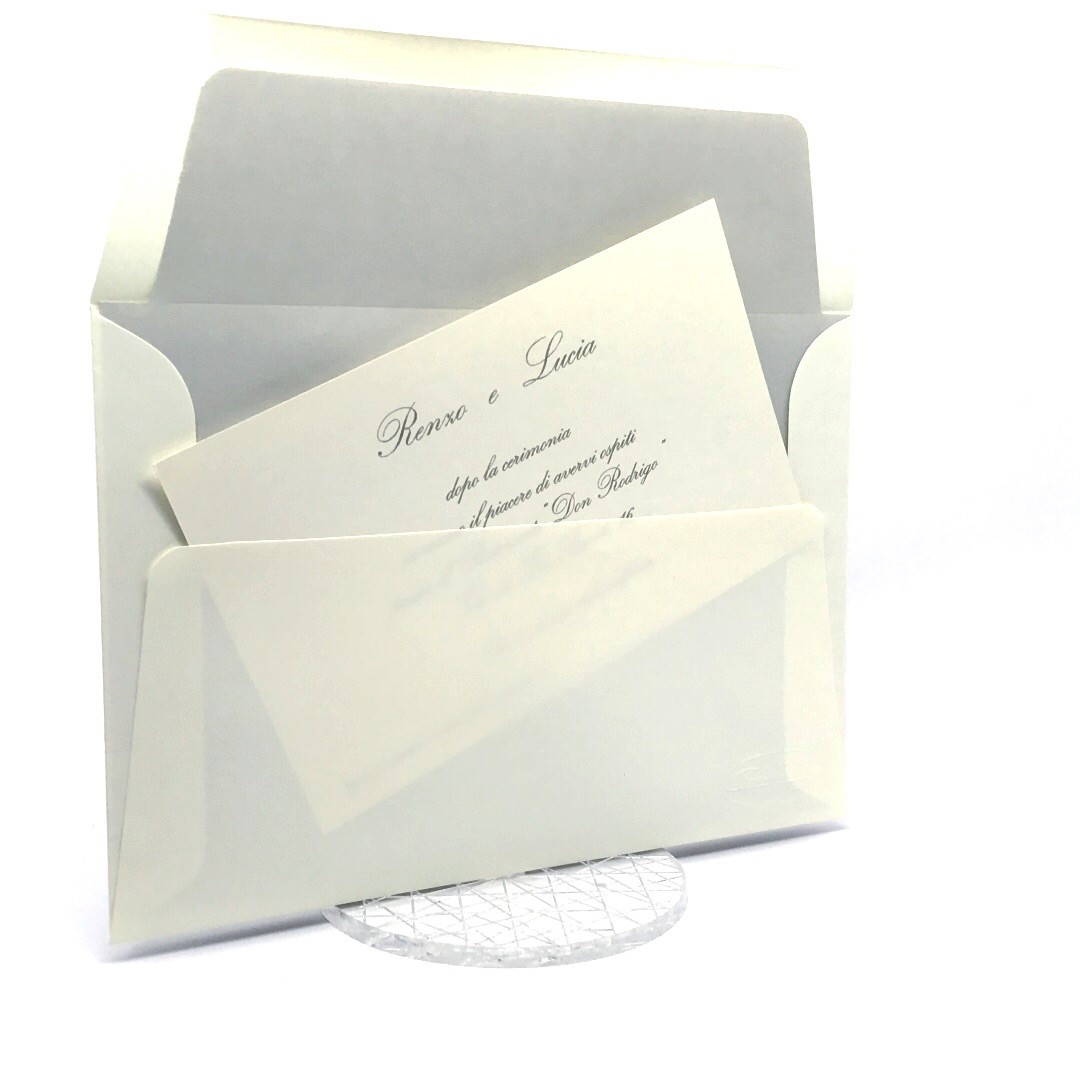 La custodia esterna è realizzata su carta color grigio/tortora con fiori intagliati a laser, l'interno è realizzato su carta avorio, chiude la partecipazione una fascetta intagliata a laser e con le iniziali defli sposi incise a laser realizzata anch'essa su carta avorio.
