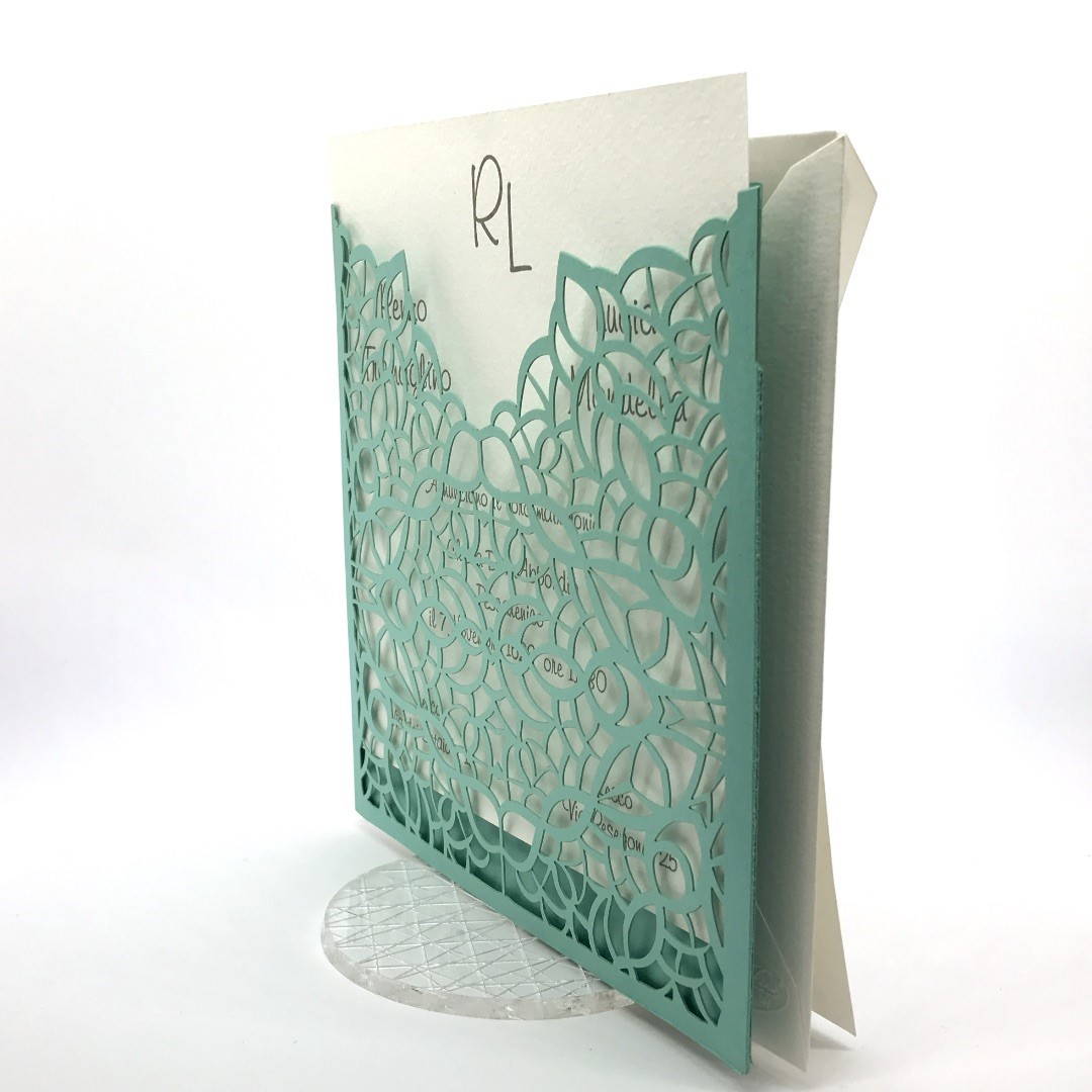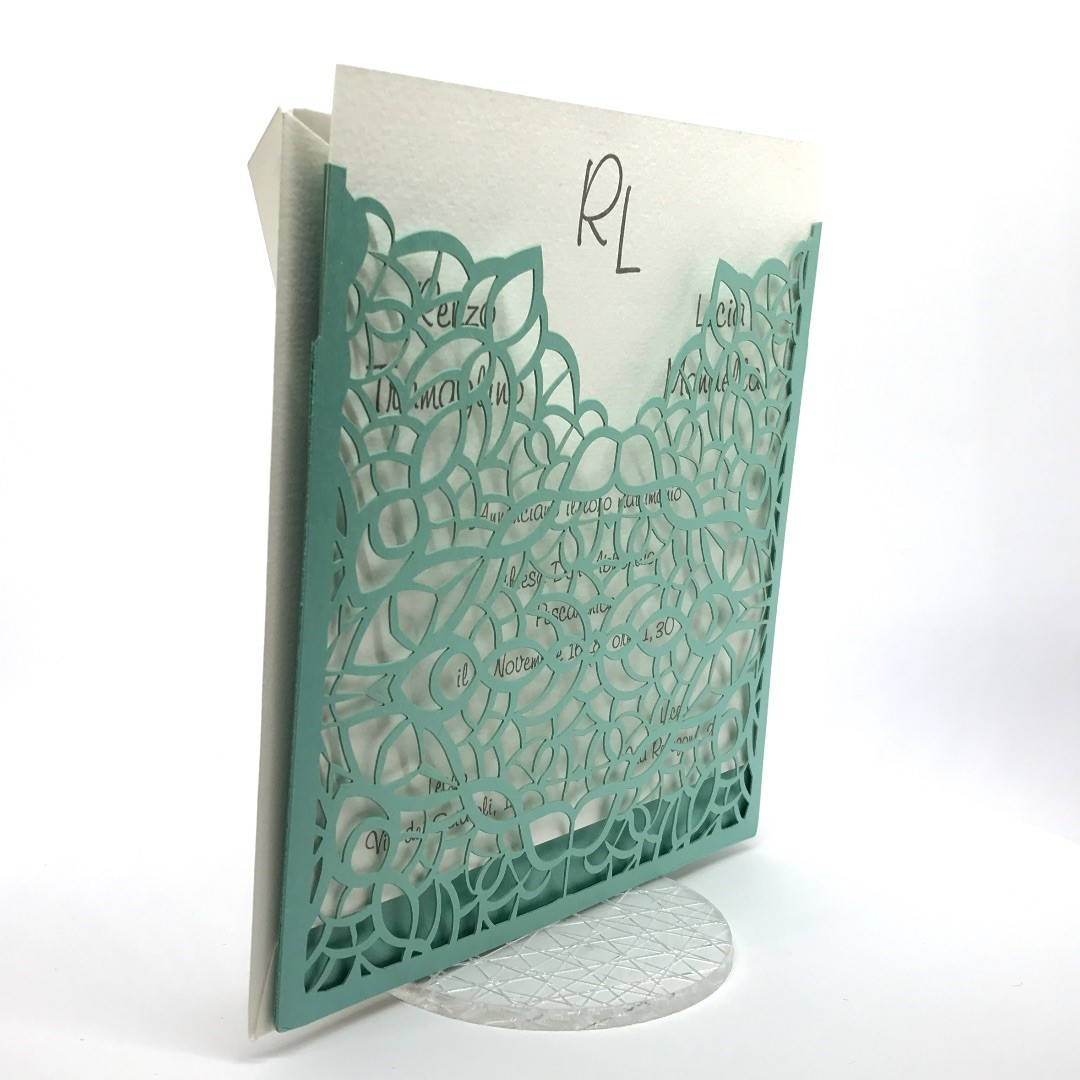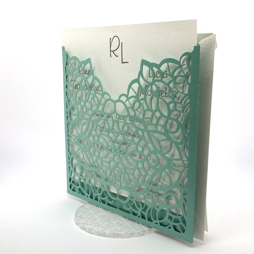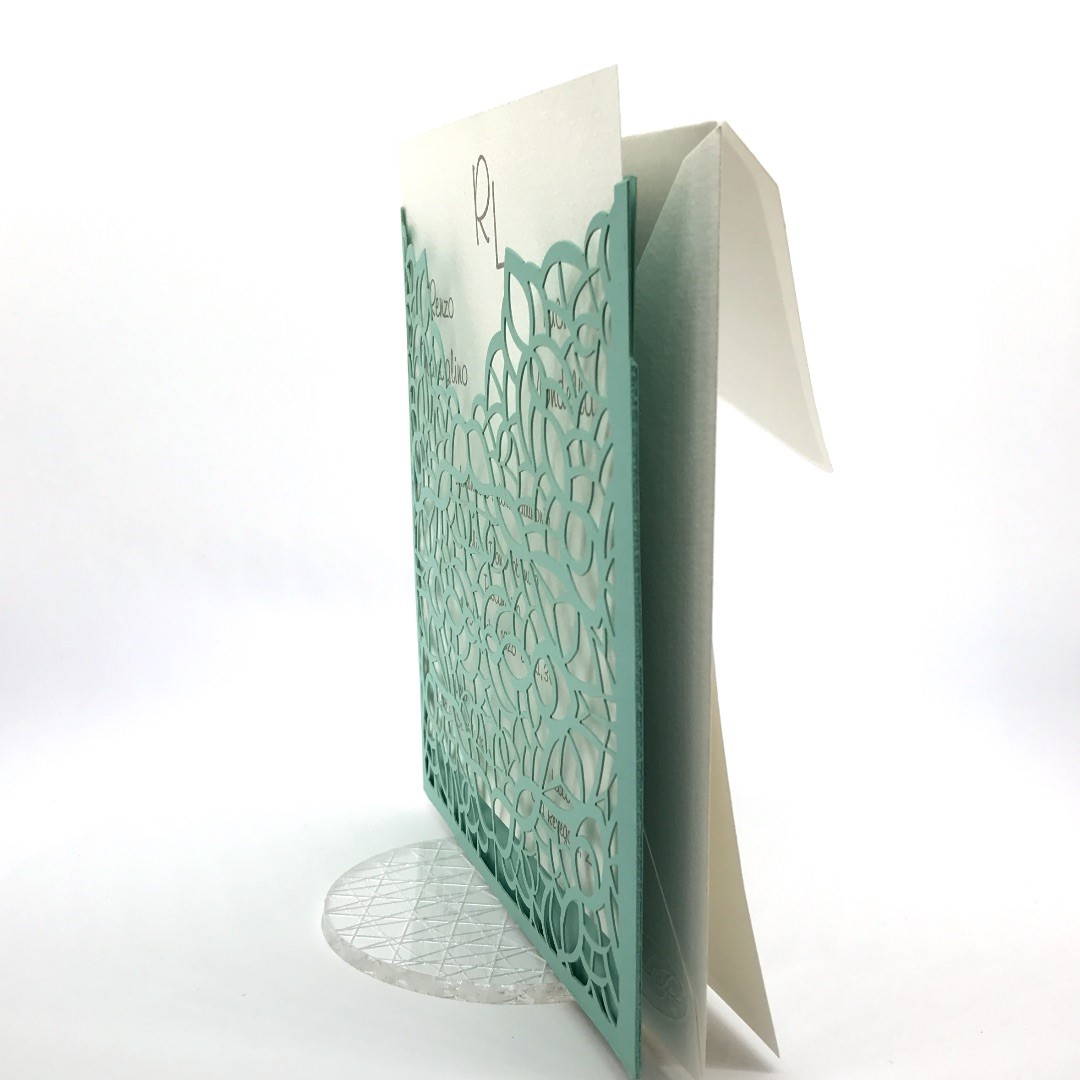 L'esterno è realizzato in carta perlata verde tiffany con decori intagliati a laser, interno in carta martellata panna.
