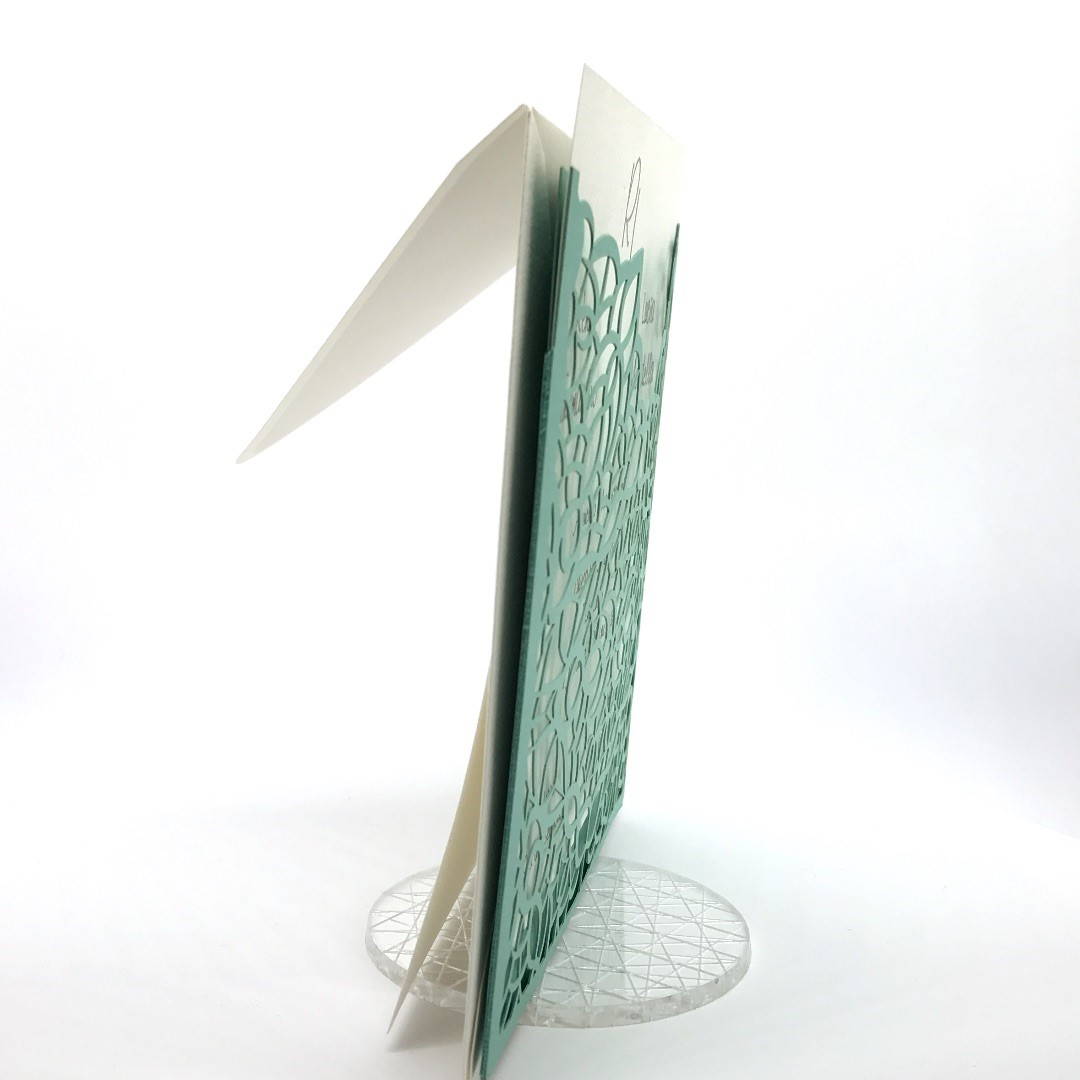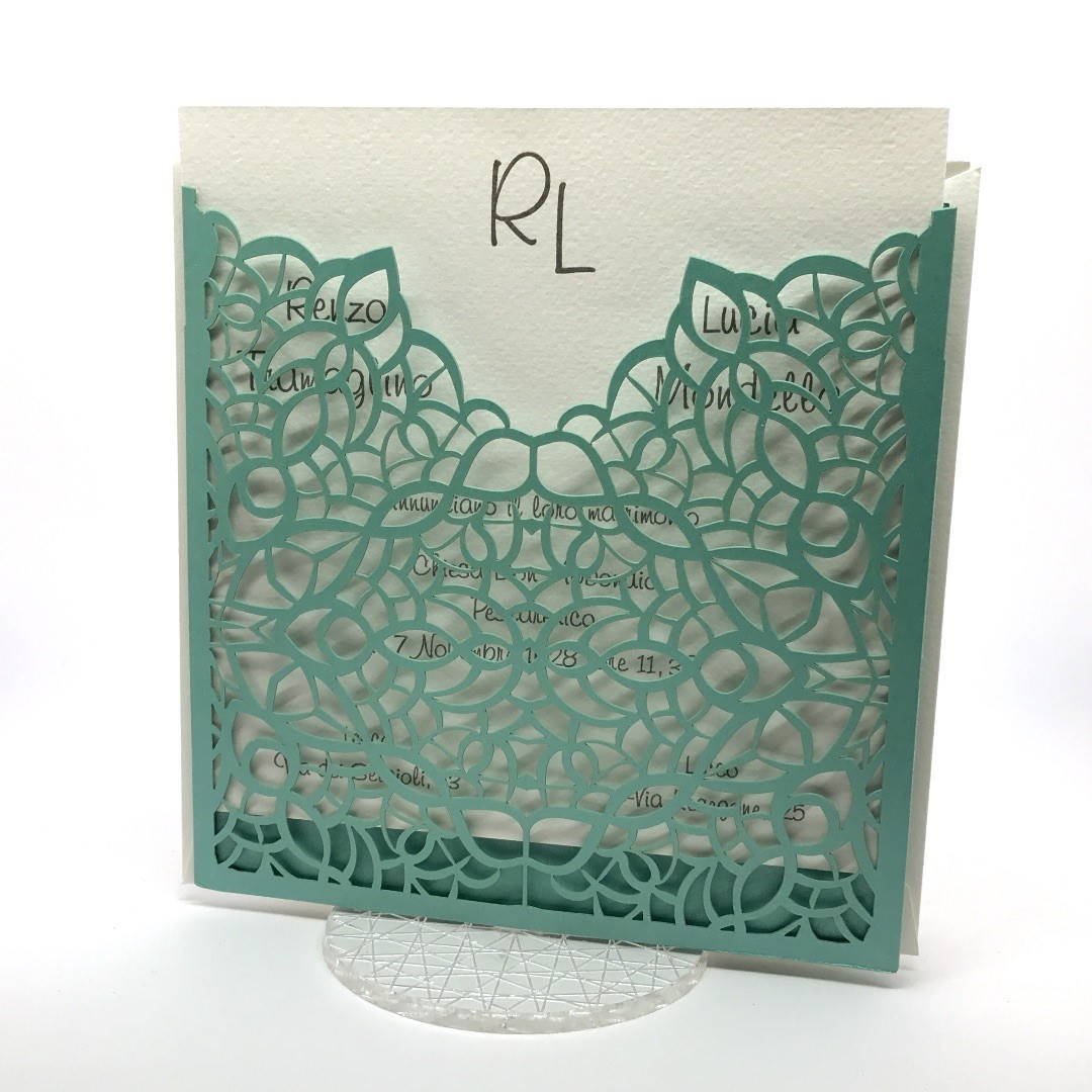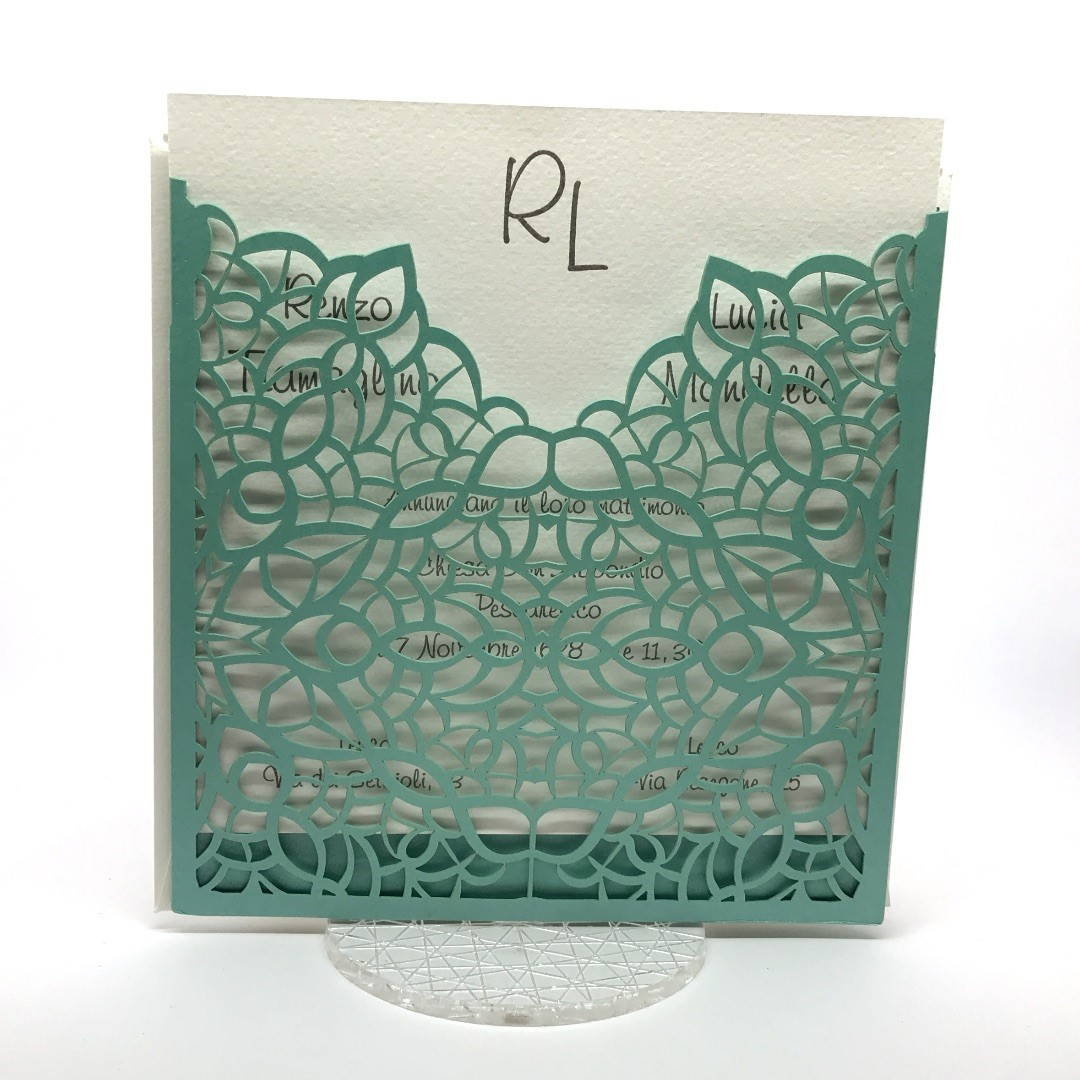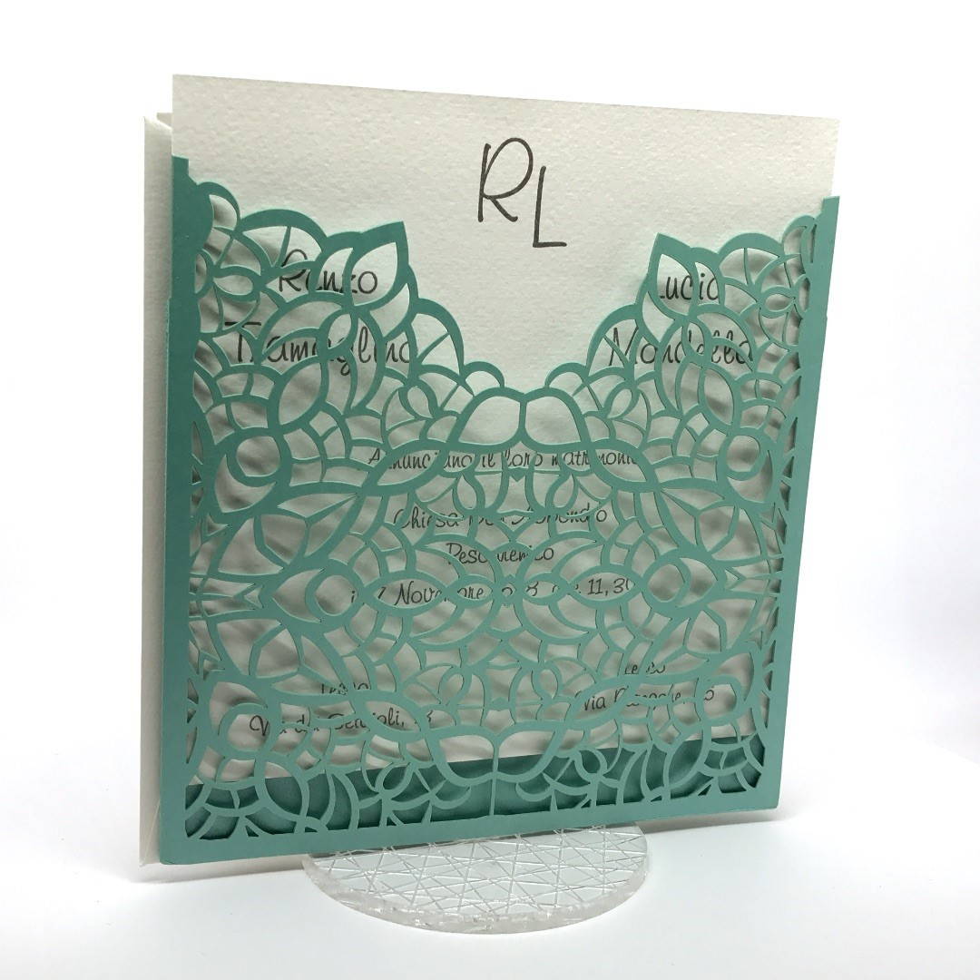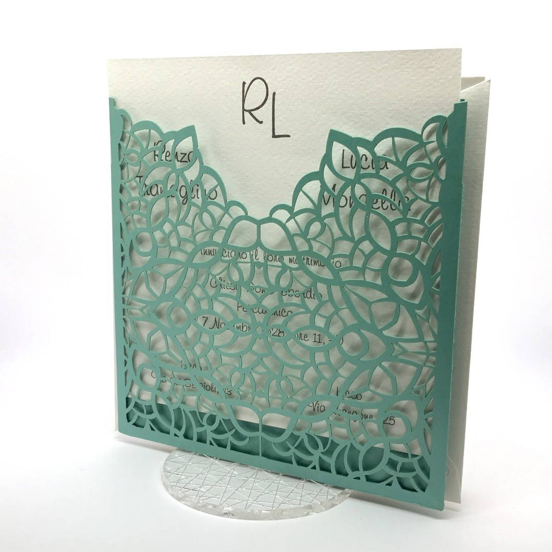 L'esterno è realizzato in carta perlata verde tiffany con decori intagliati a laser, interno in carta martellata panna.