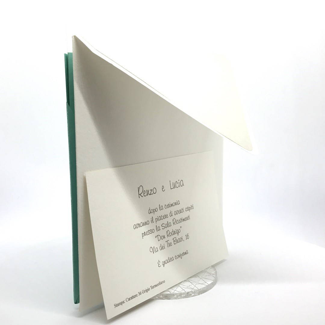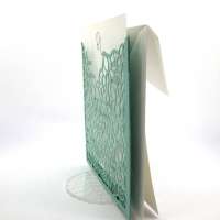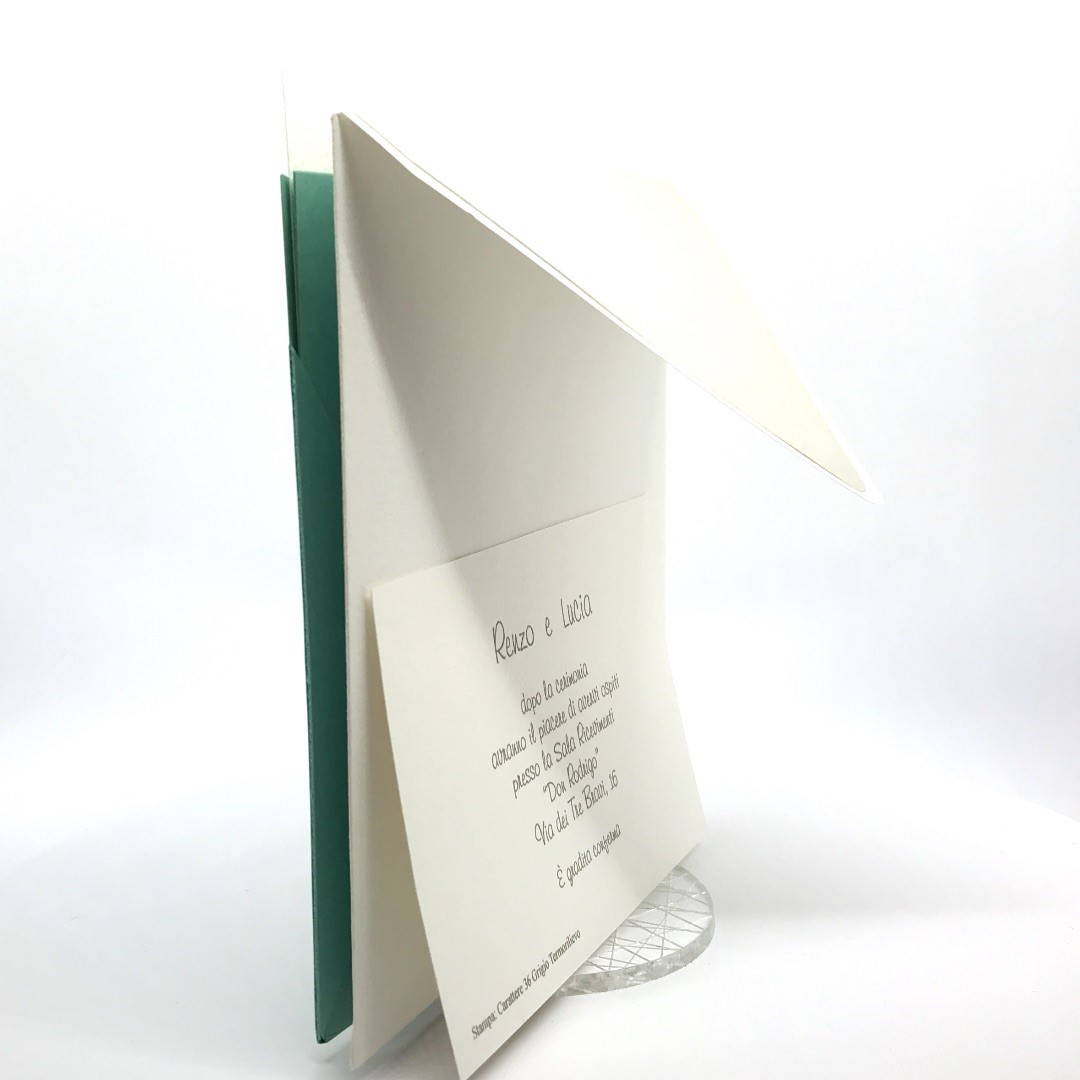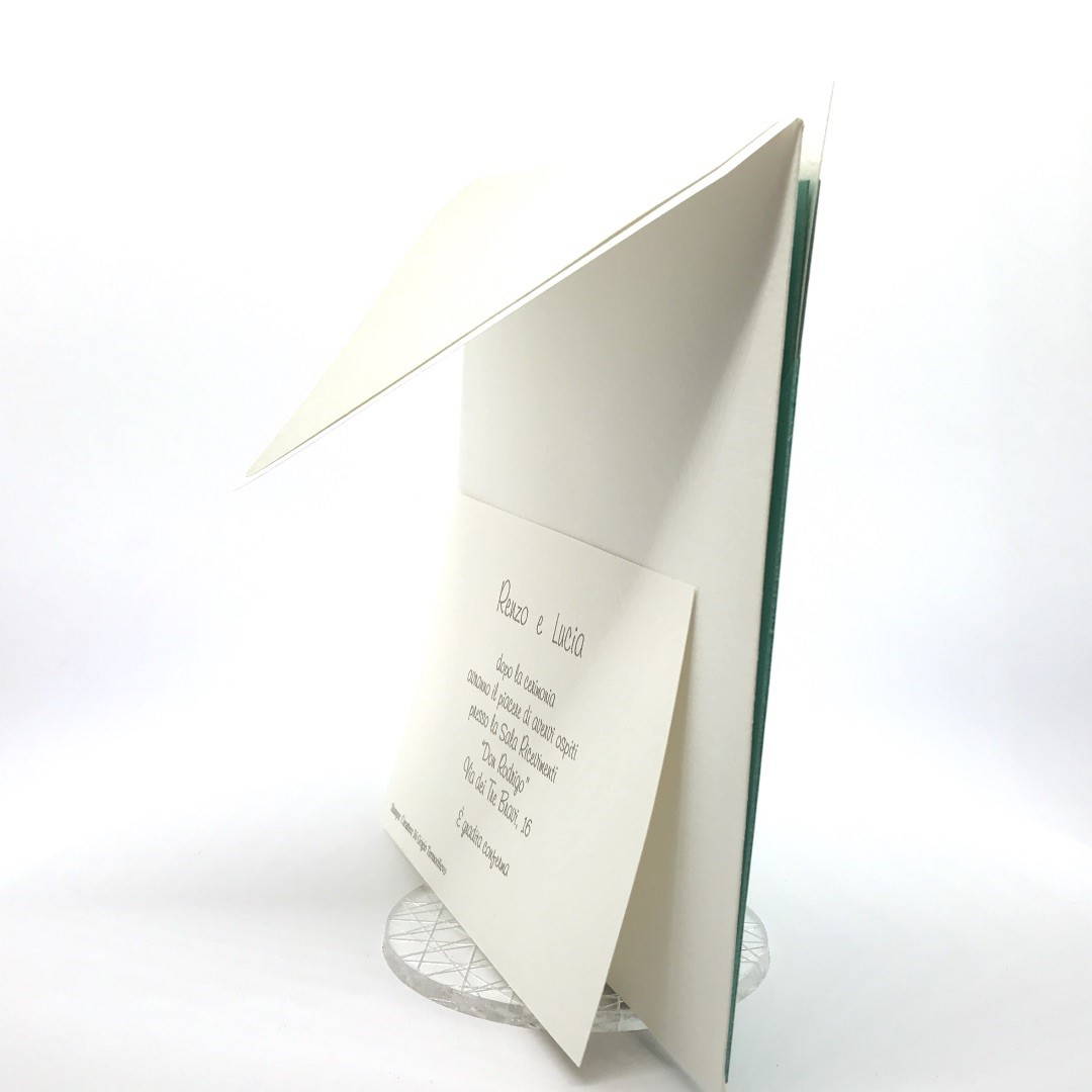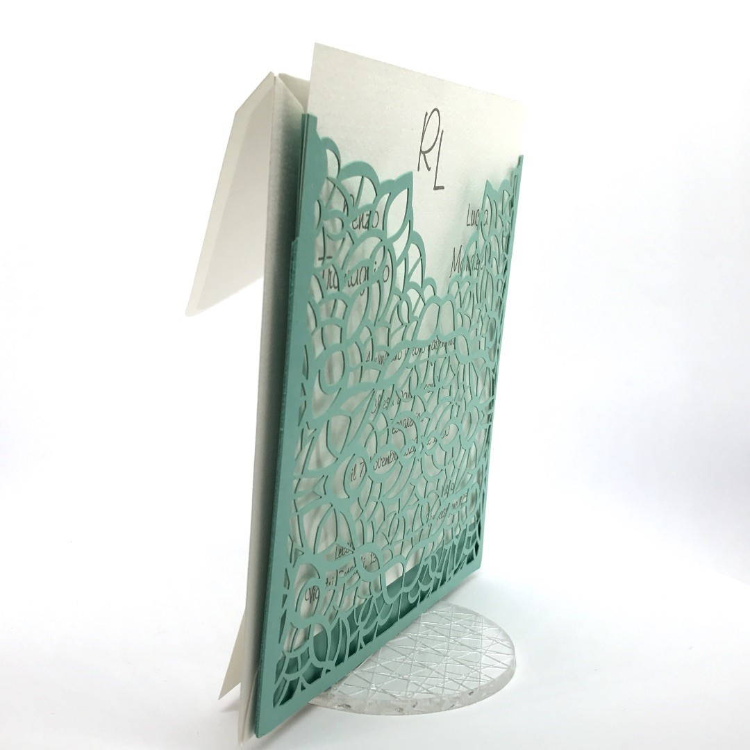 L'esterno è realizzato in carta perlata verde tiffany con decori intagliati a laser, interno in carta martellata panna.