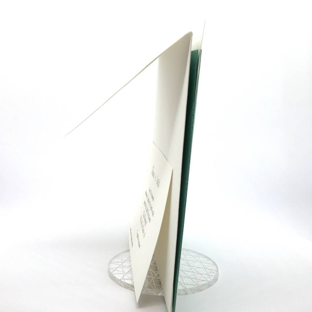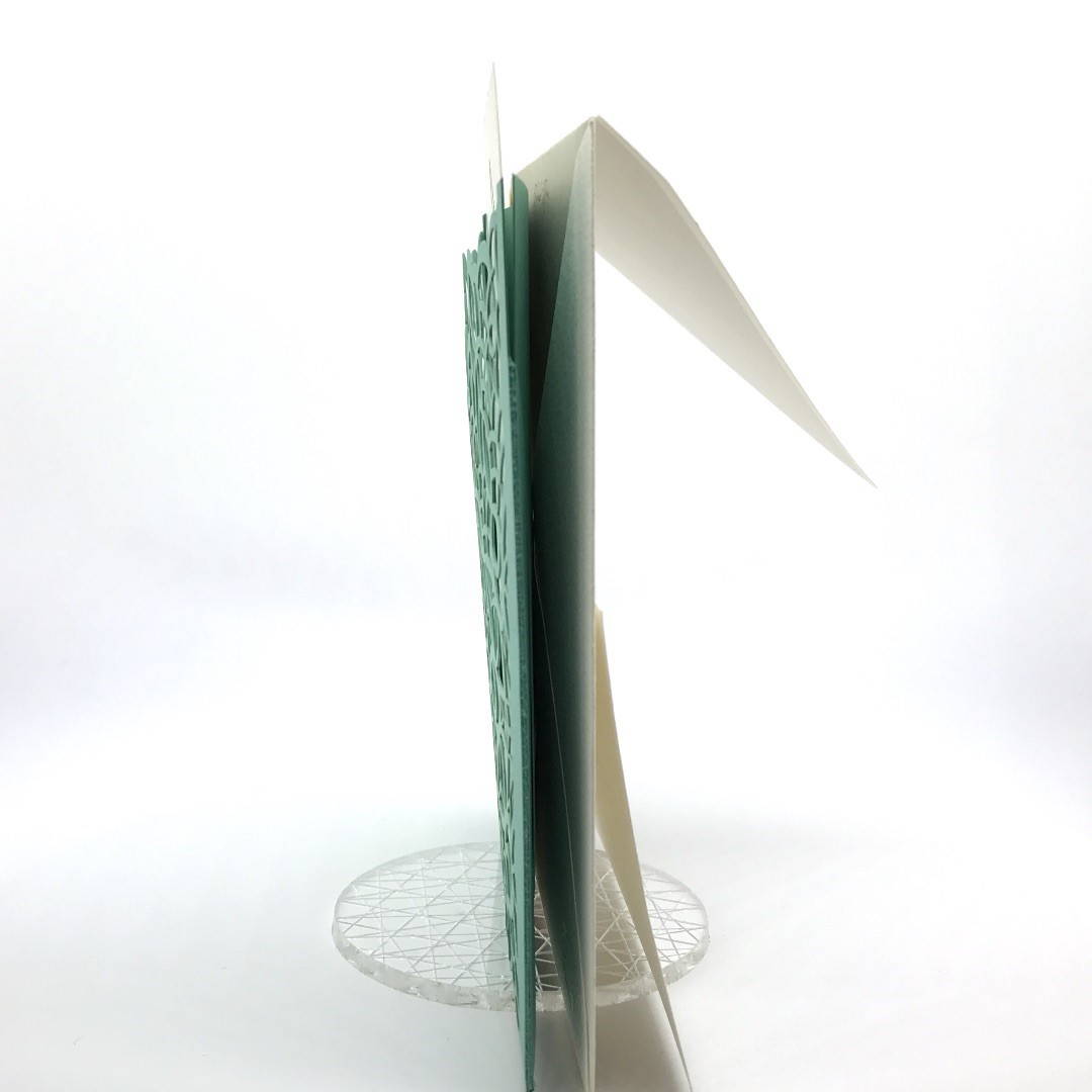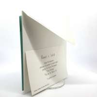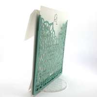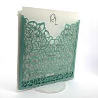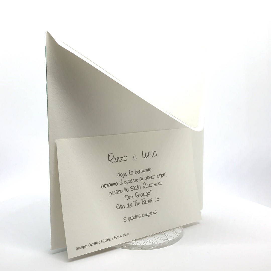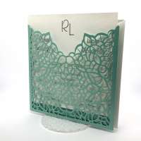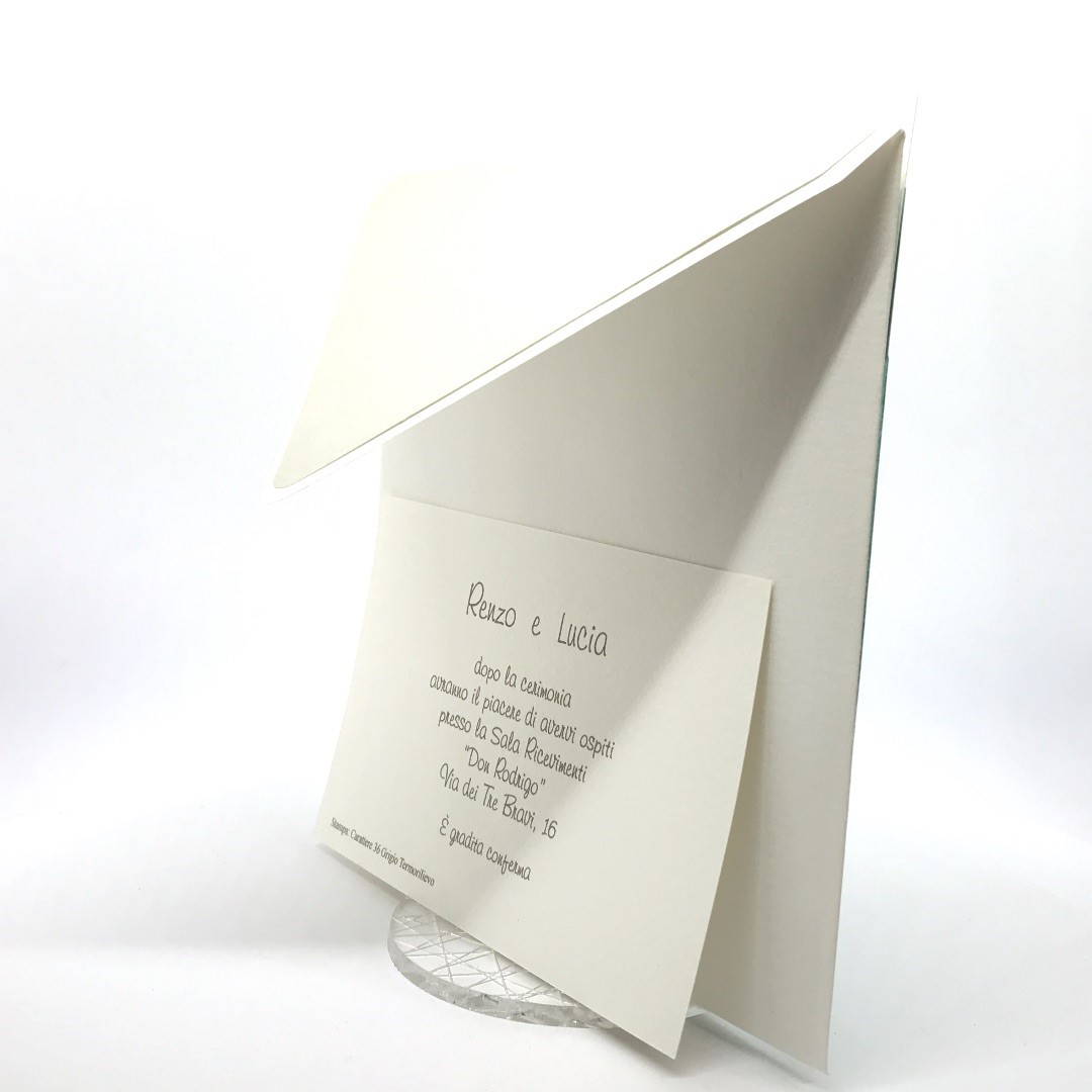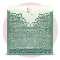 L'esterno è realizzato in carta perlata verde tiffany con decori intagliati a laser, interno in carta martellata panna.