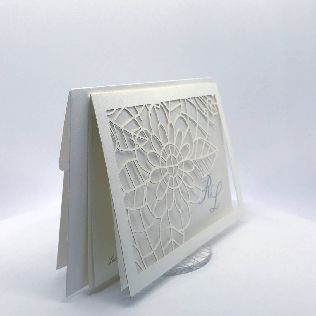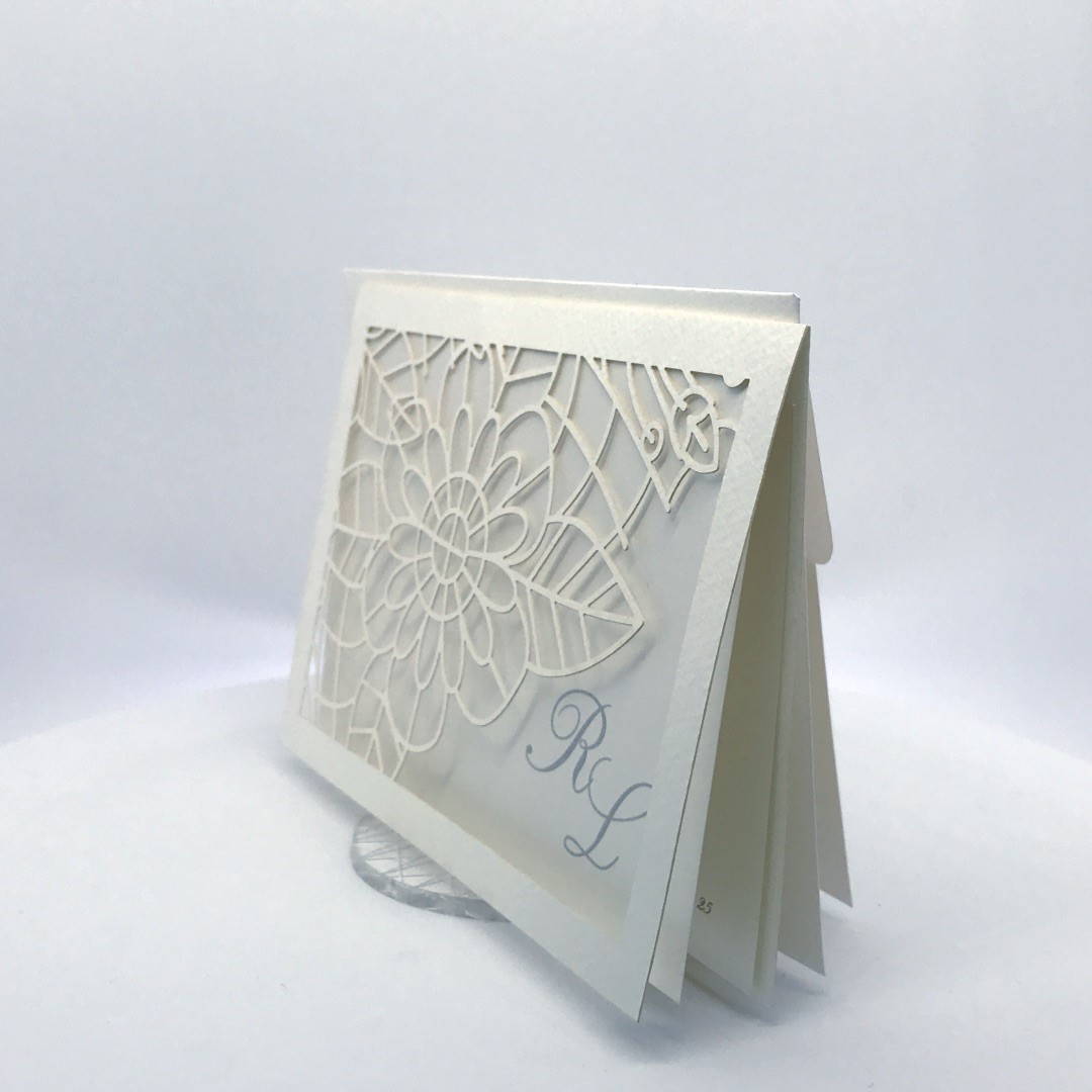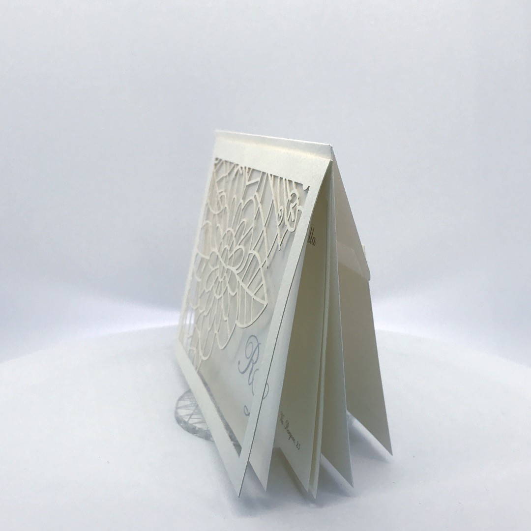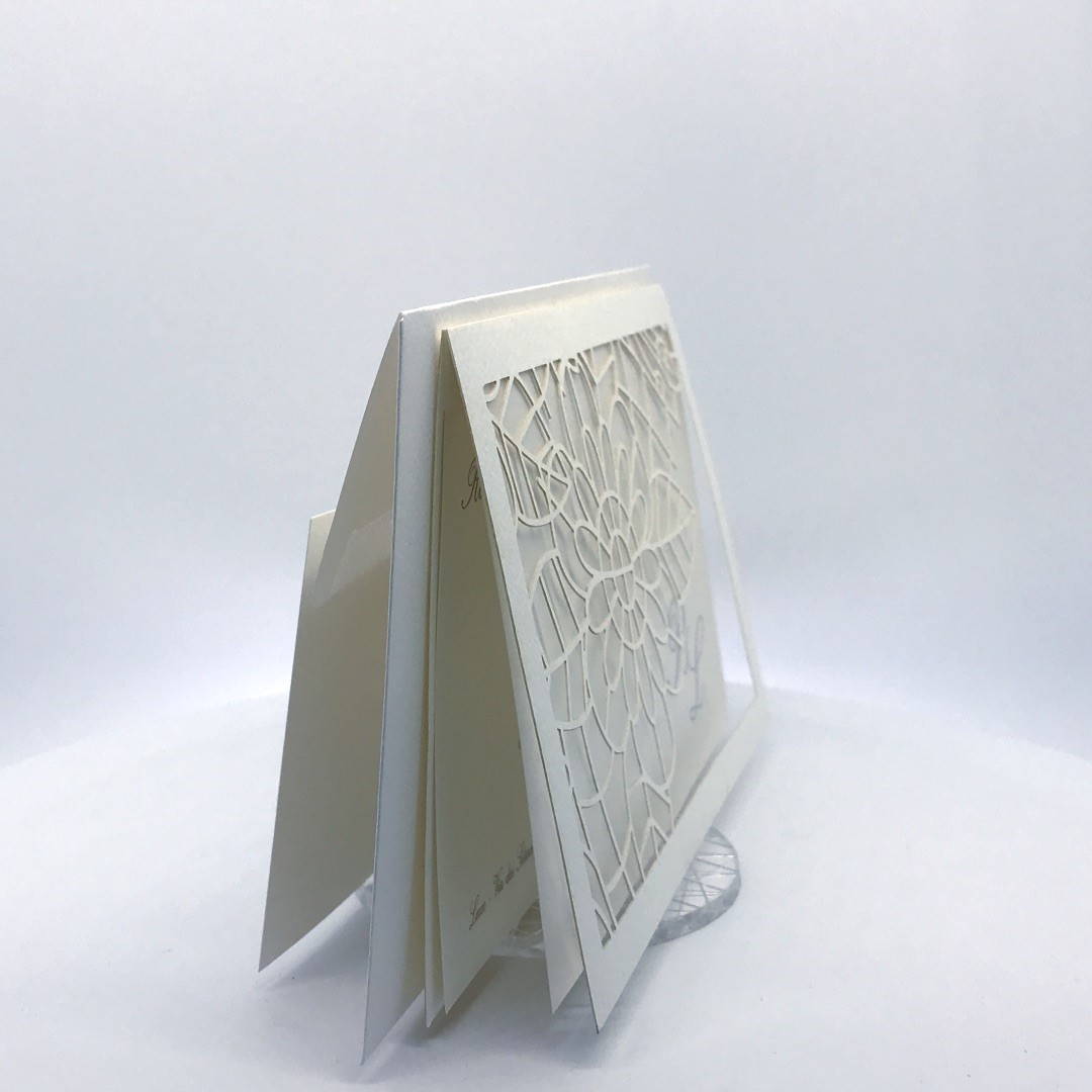 L'esterno è realizzato su carta martellata panna e decori intagliati a laser, interno realizzato su carta perlata.
