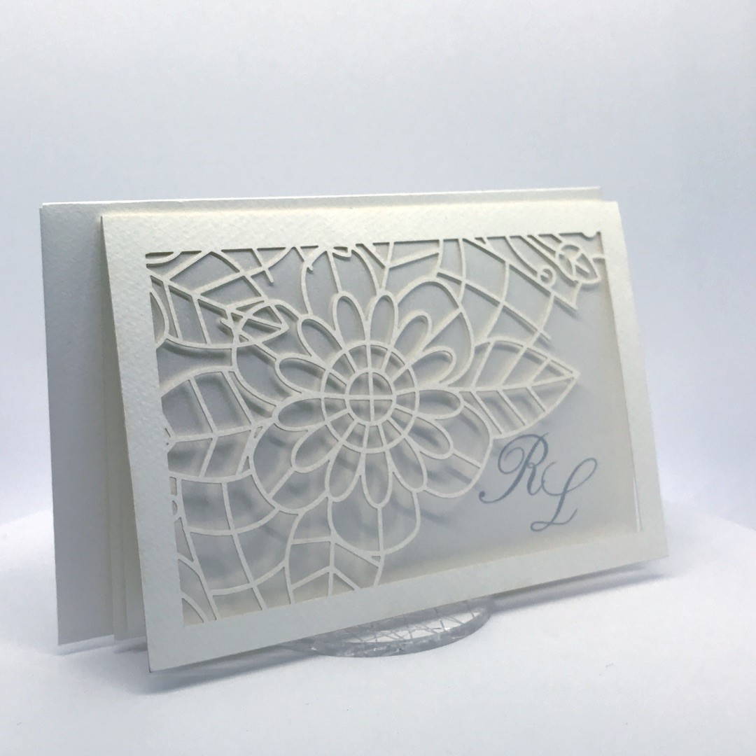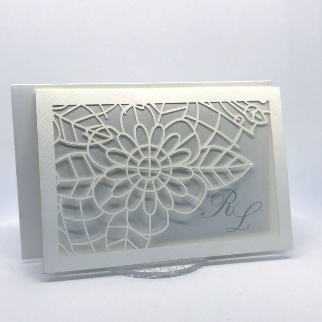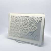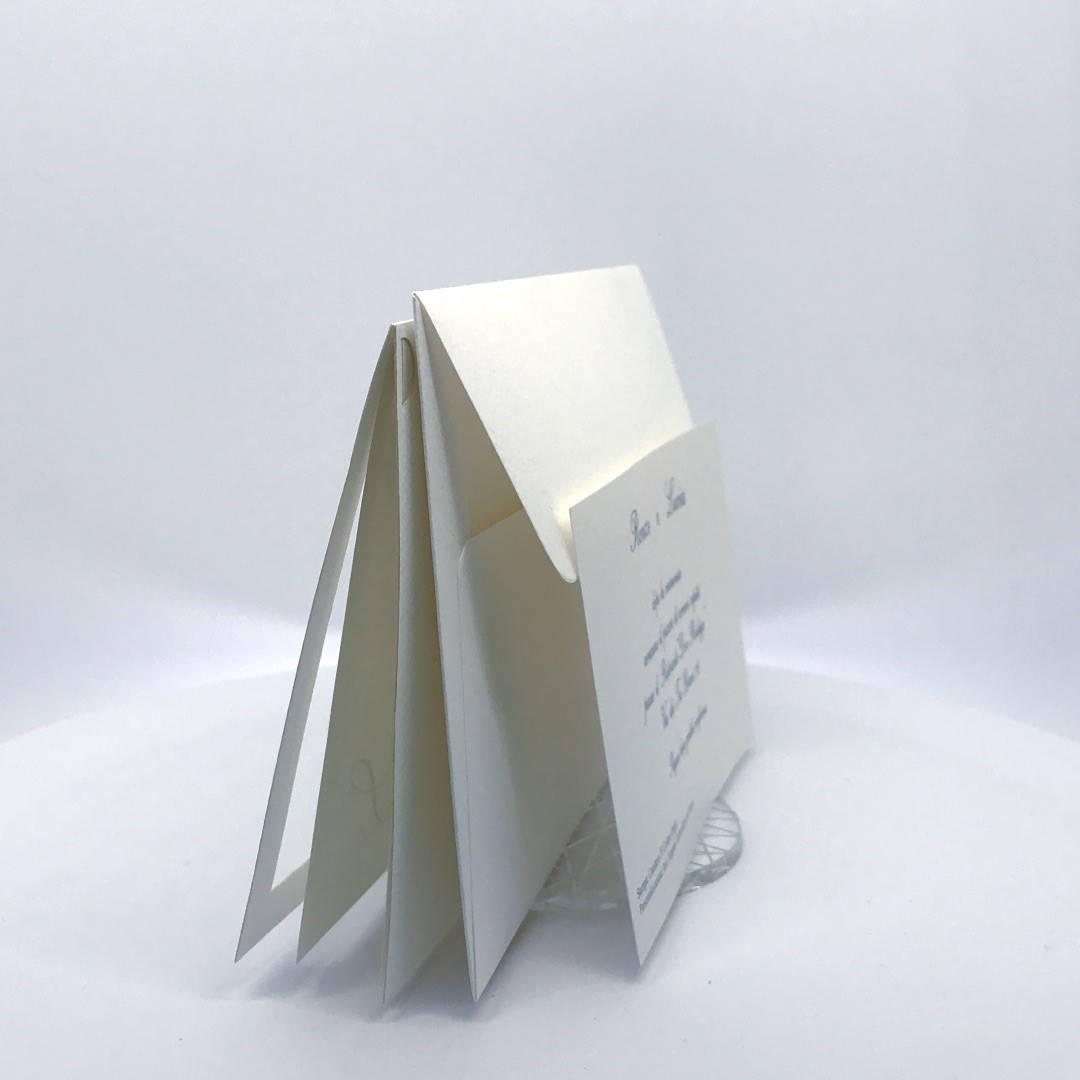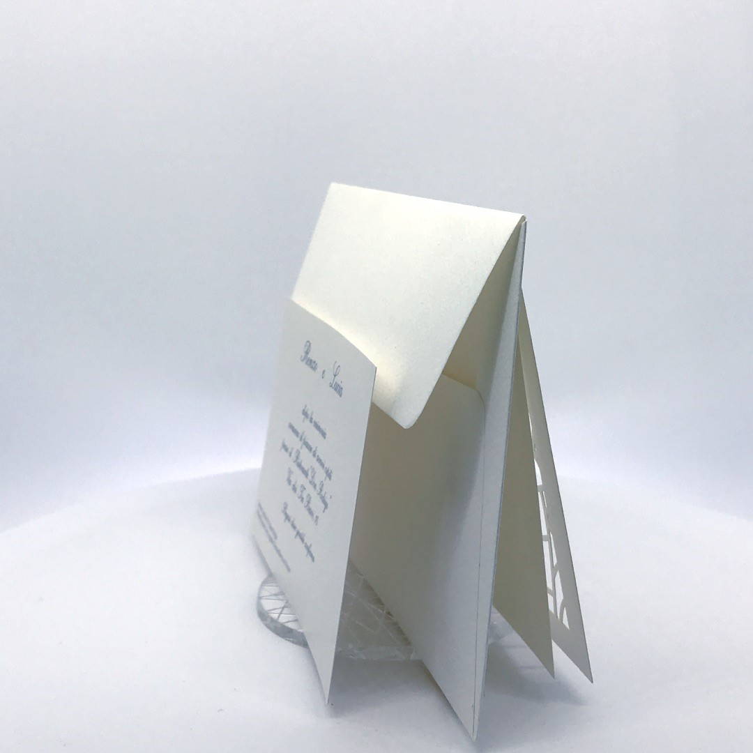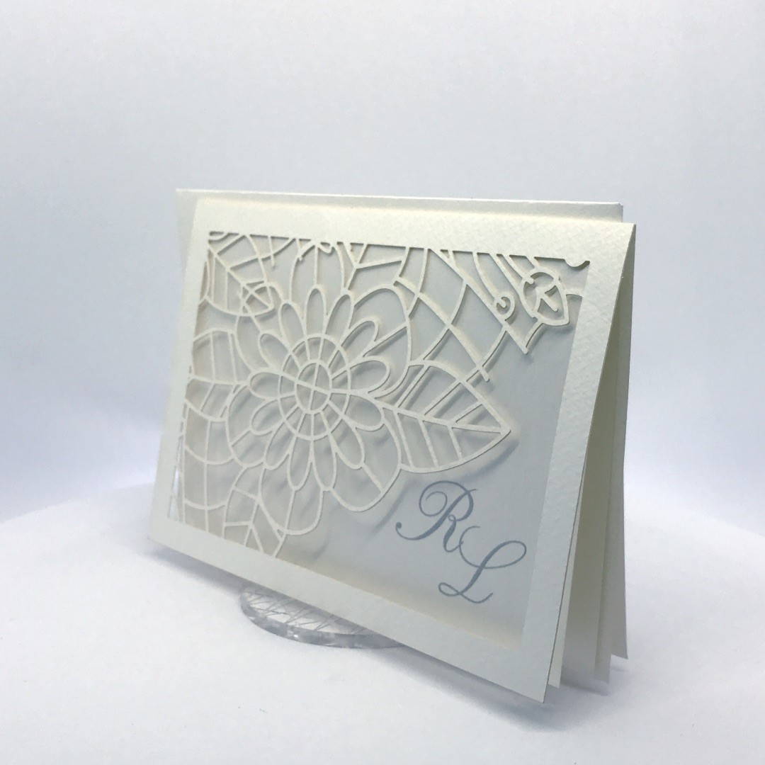 L'esterno è realizzato su carta martellata panna e decori intagliati a laser, interno realizzato su carta perlata.