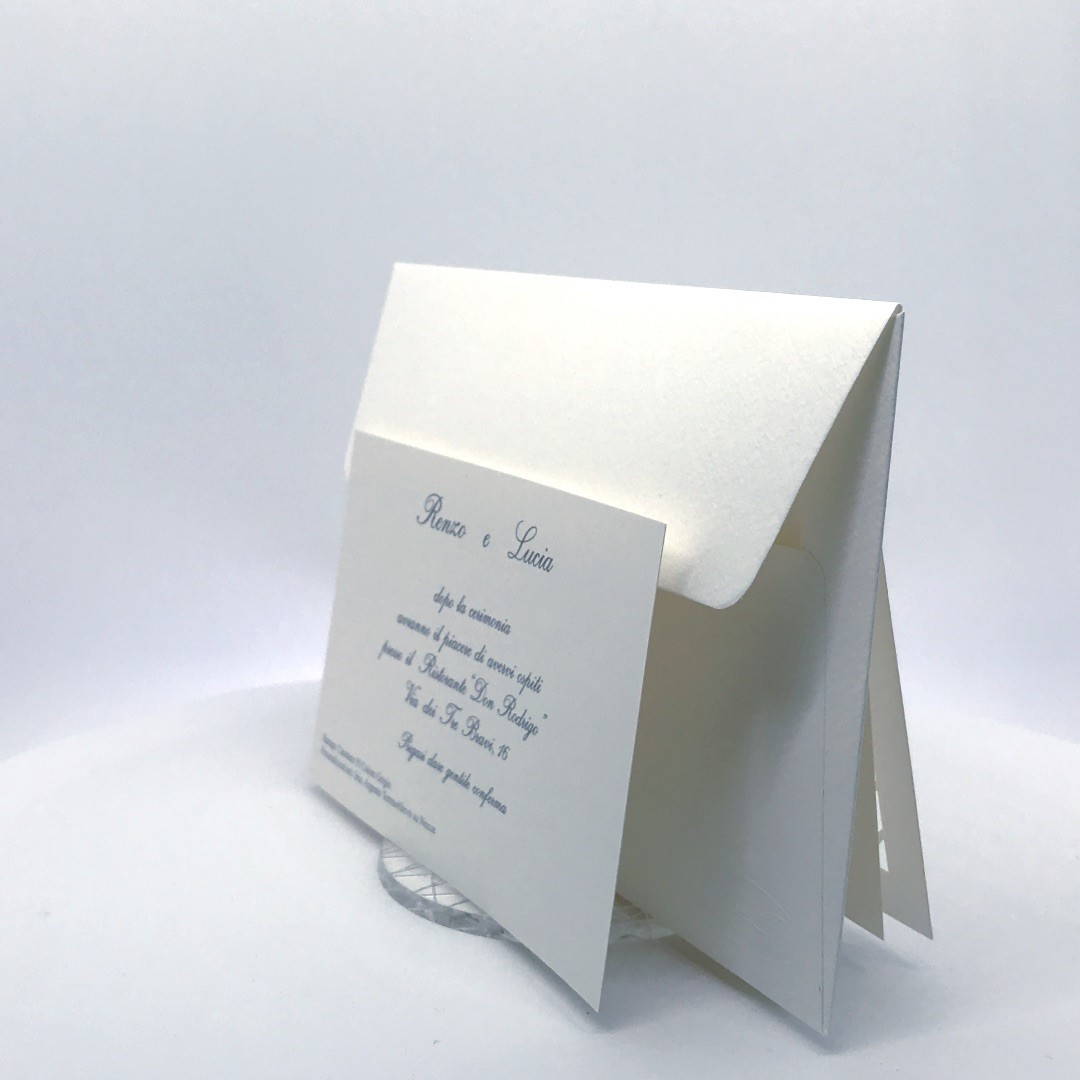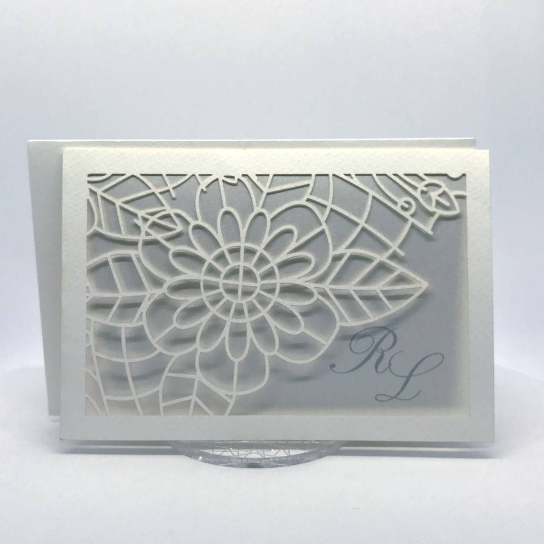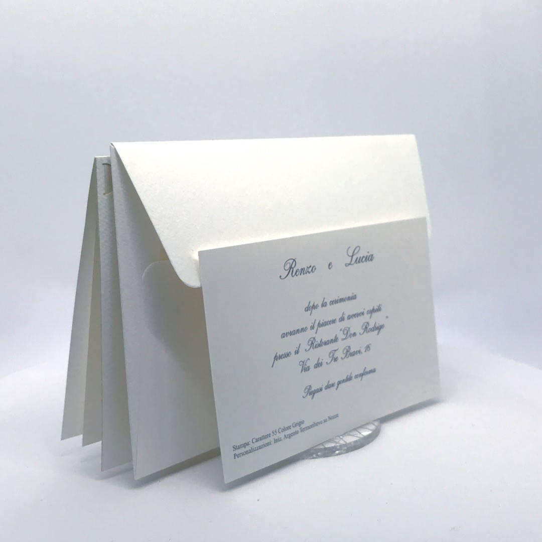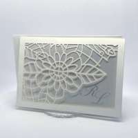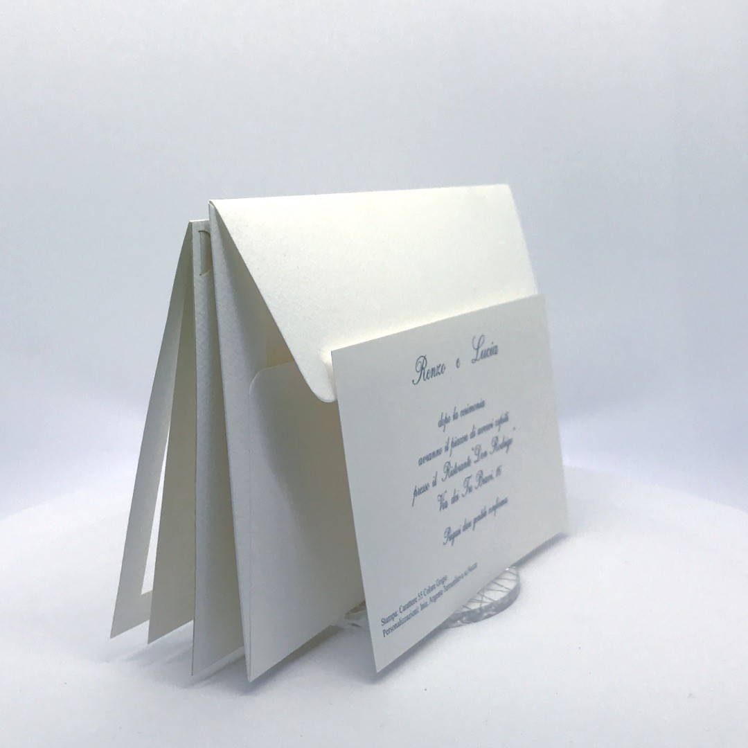 L'esterno è realizzato su carta martellata panna e decori intagliati a laser, interno realizzato su carta perlata.