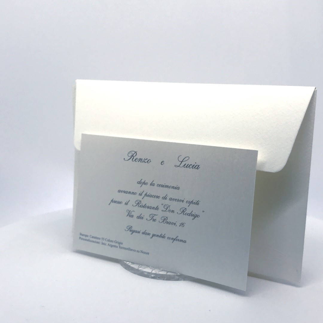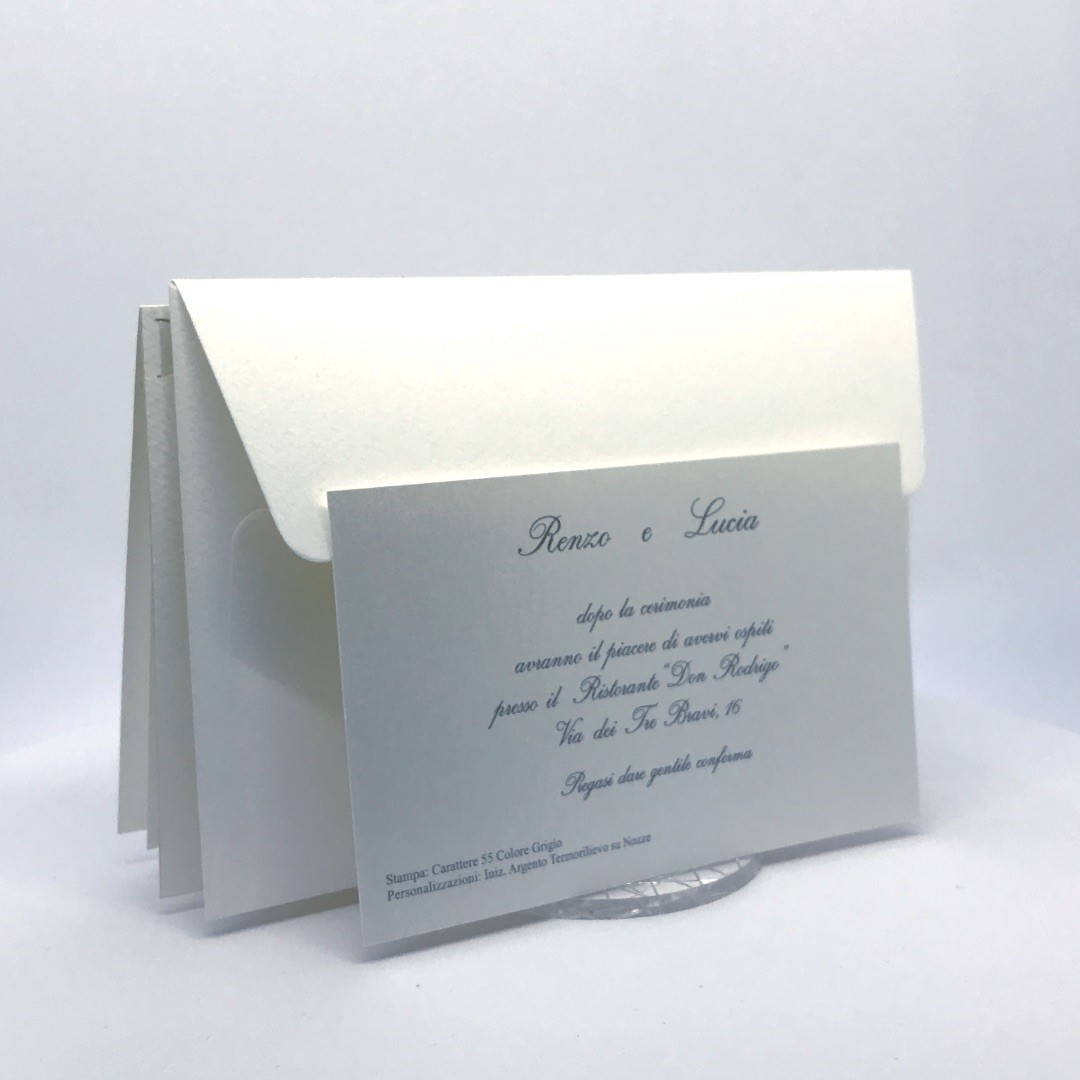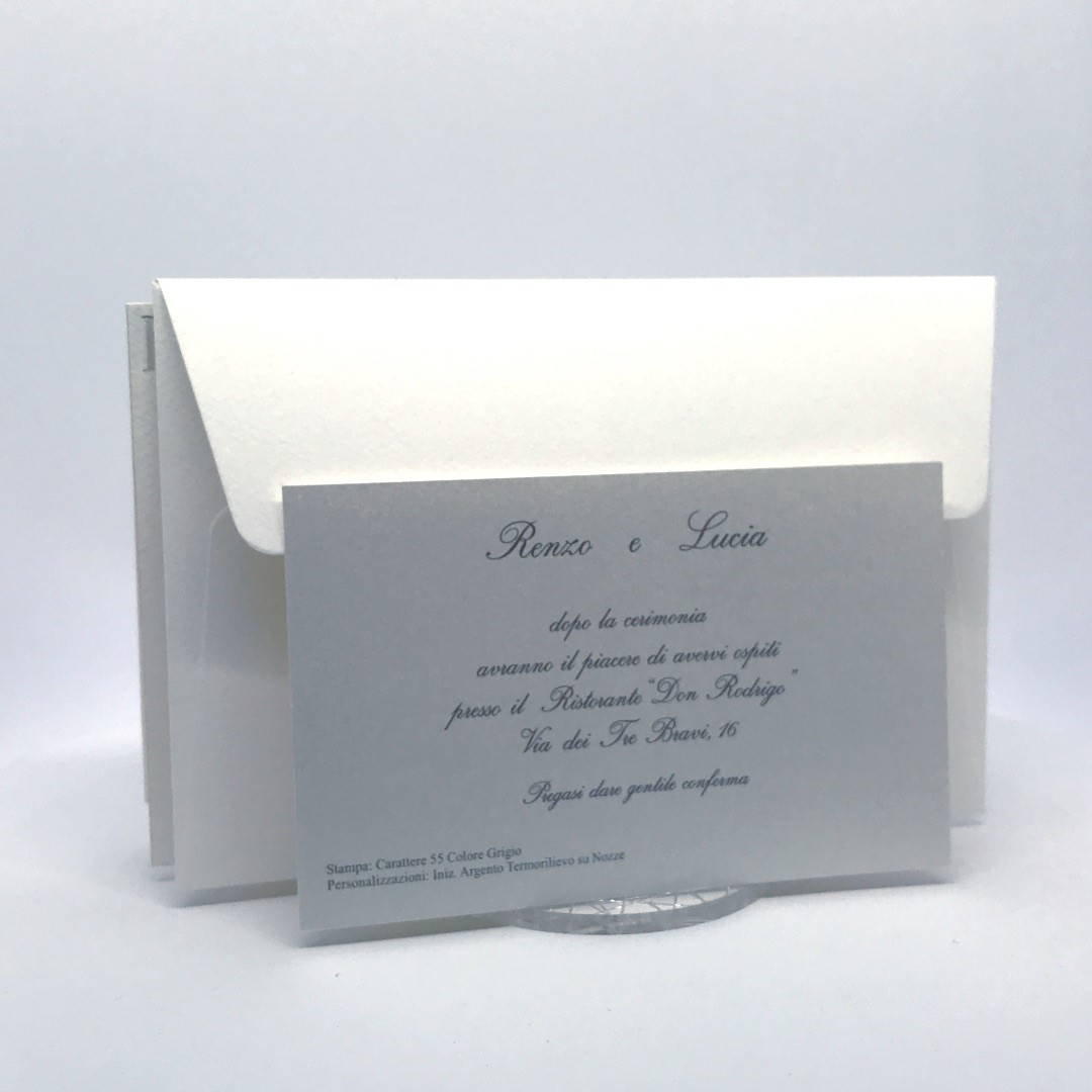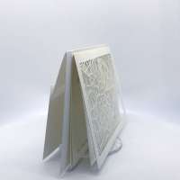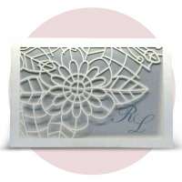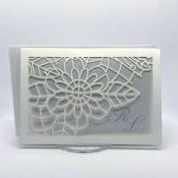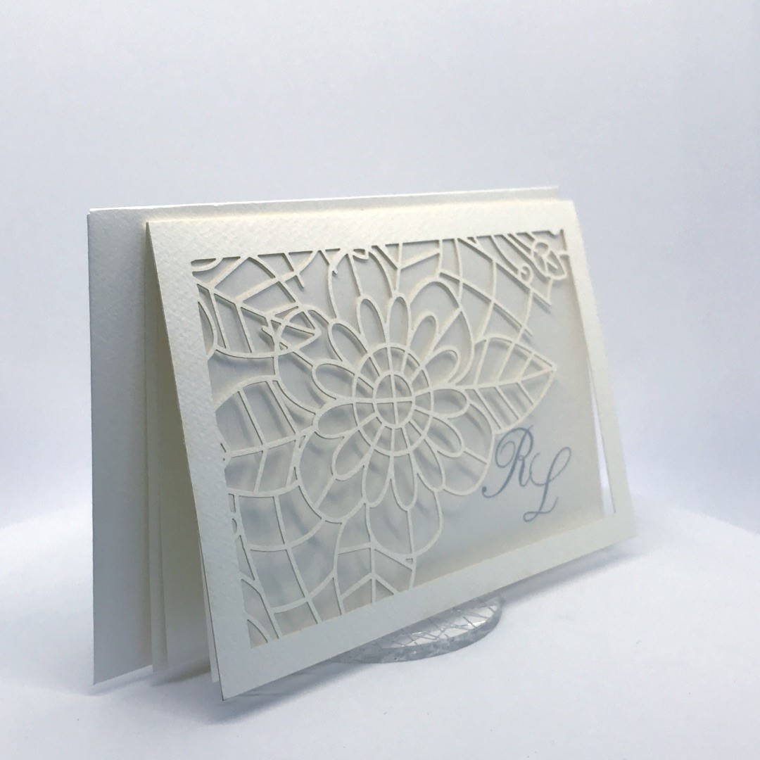 L'esterno è realizzato su carta martellata panna e decori intagliati a laser, interno realizzato su carta perlata.