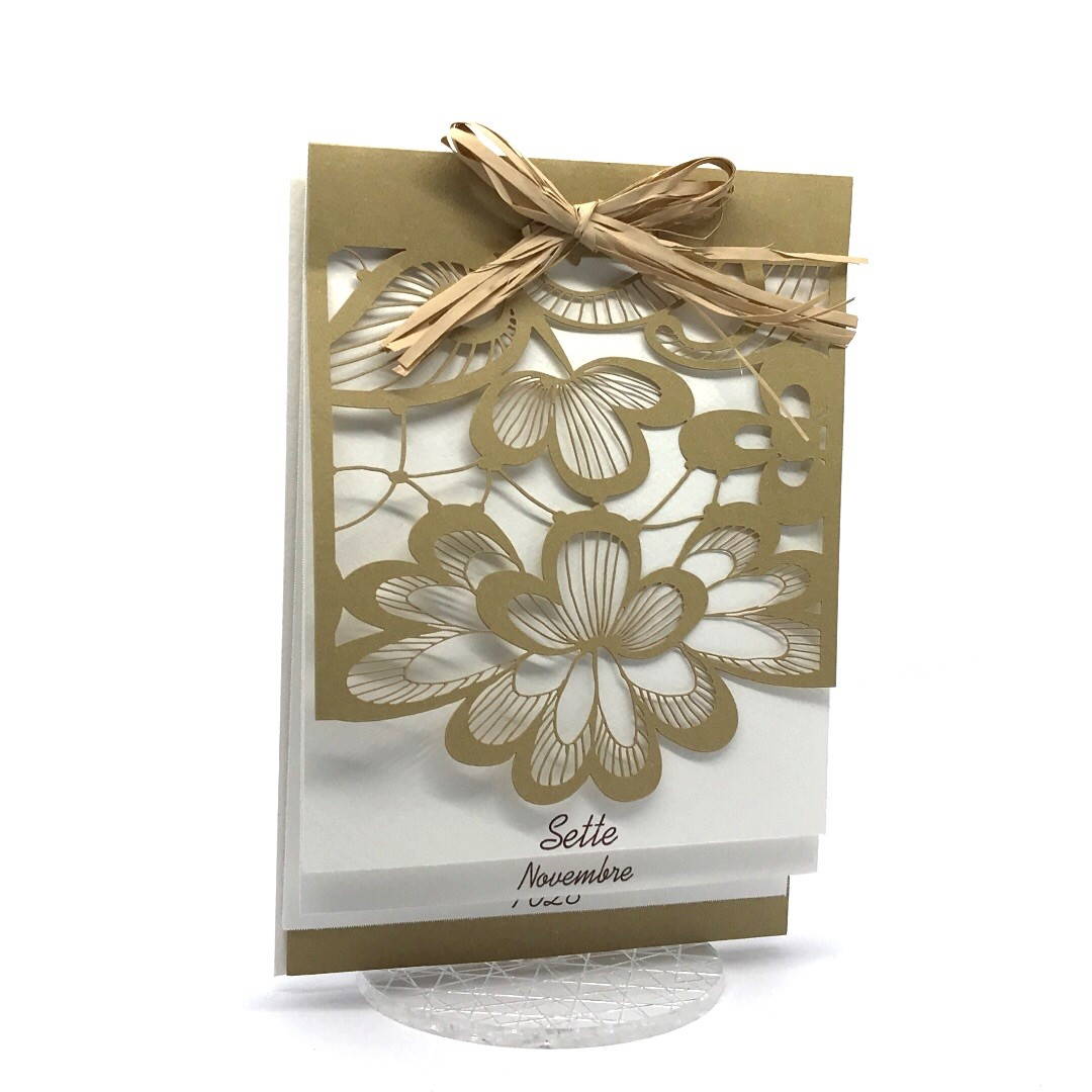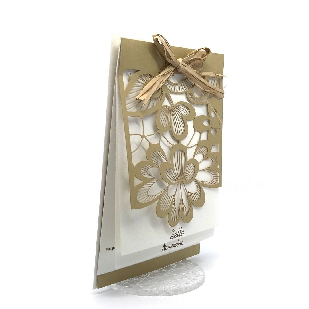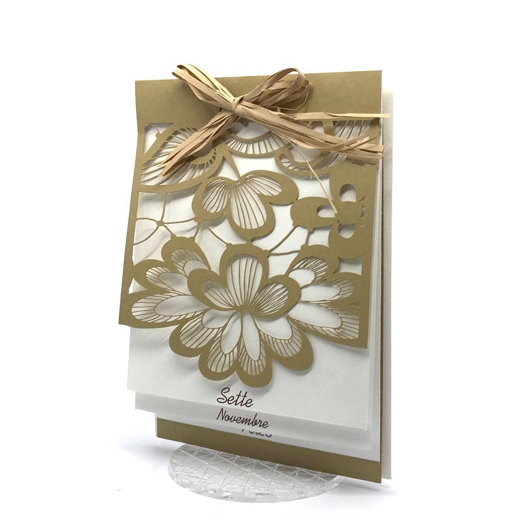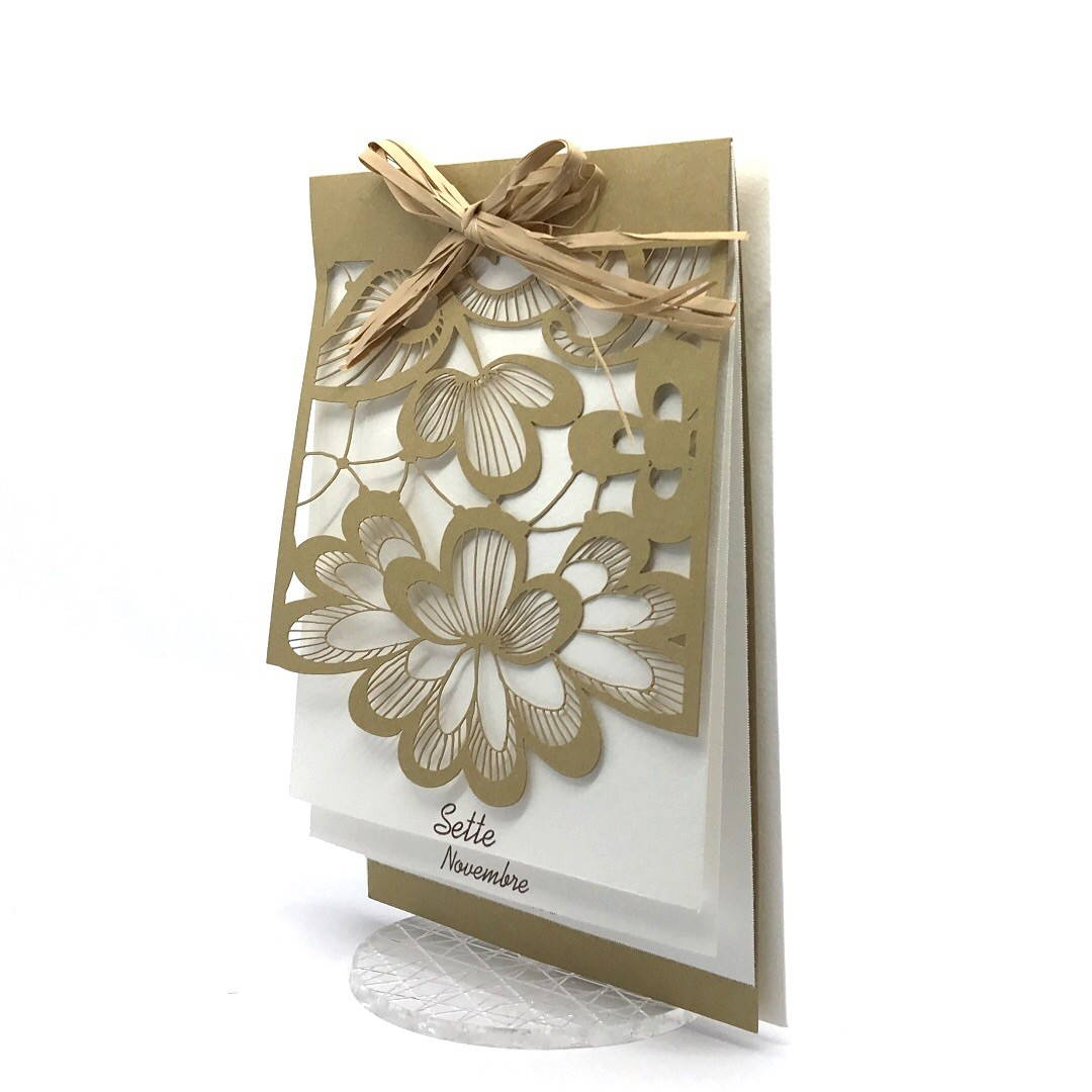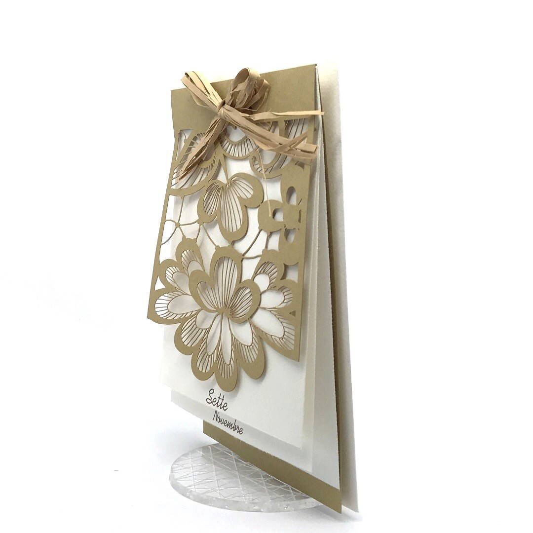 Esterno realizzato su carta materica con decori floreali intagliati a laser, interno realizzato su carta martellata panna con foro per poter inserire un nastro in raffia e legare i cartoncini.