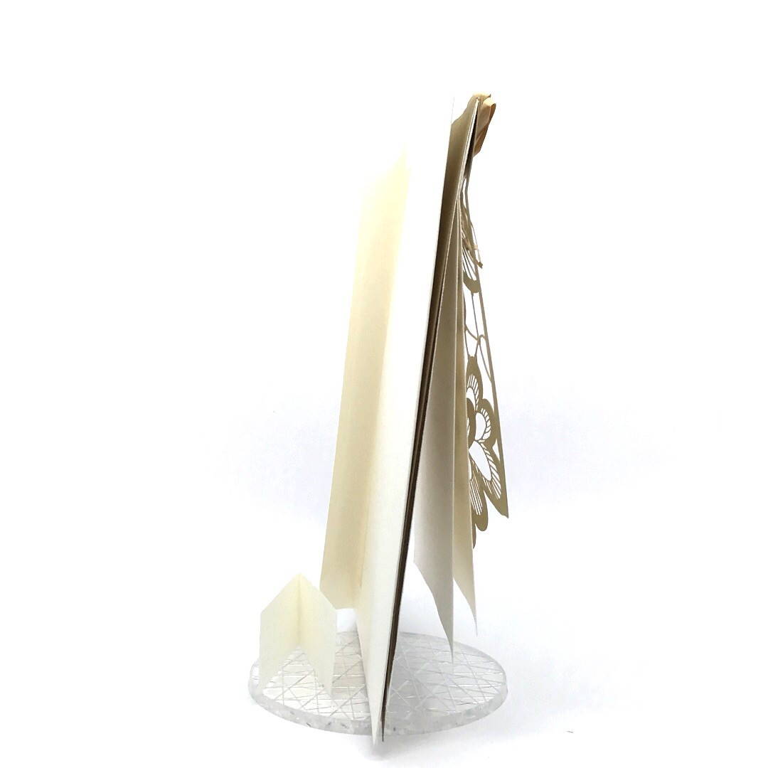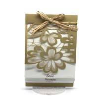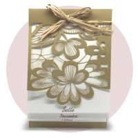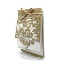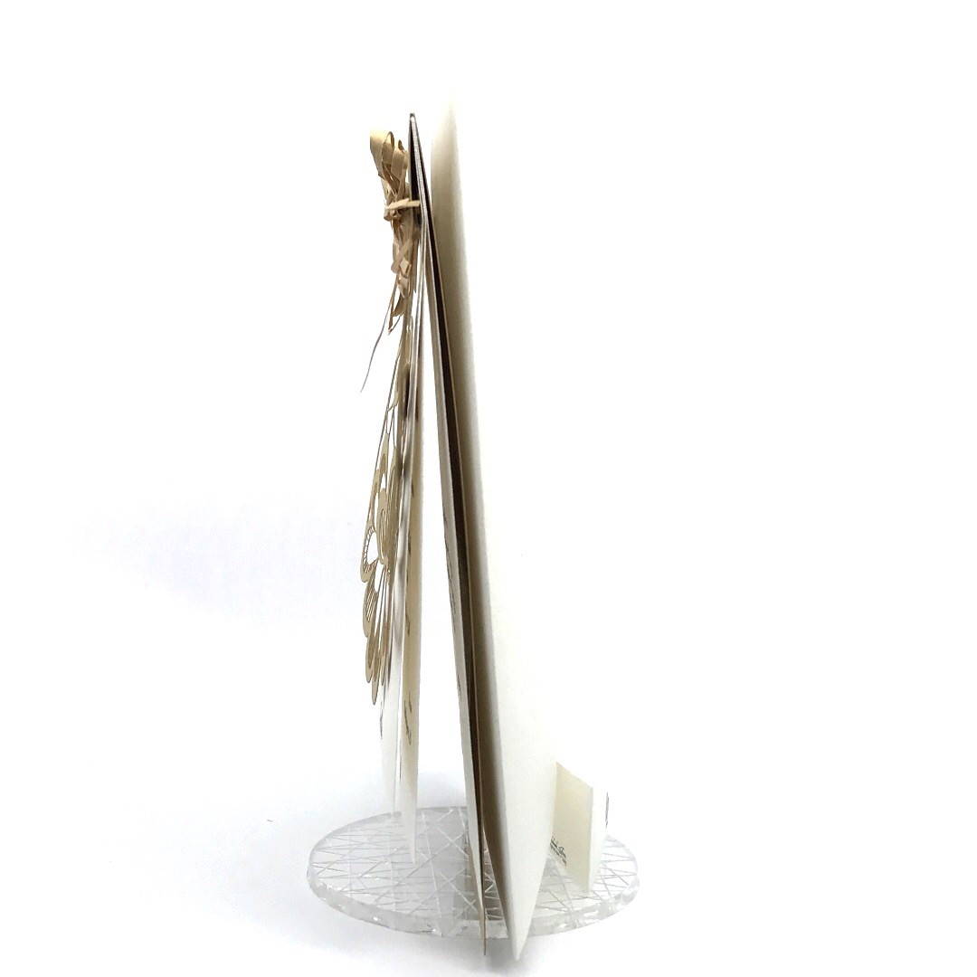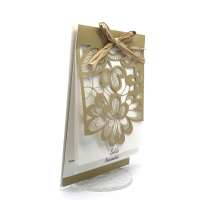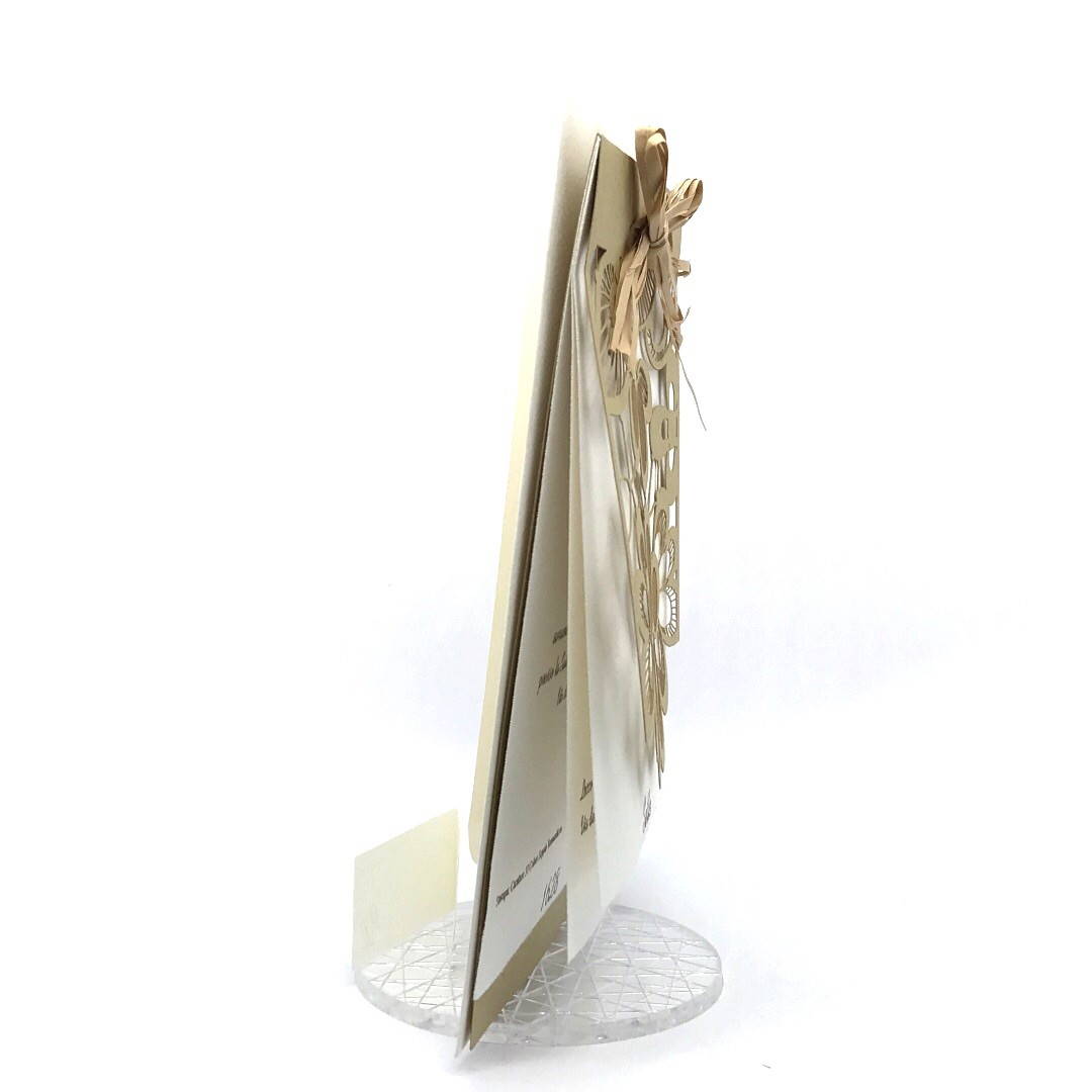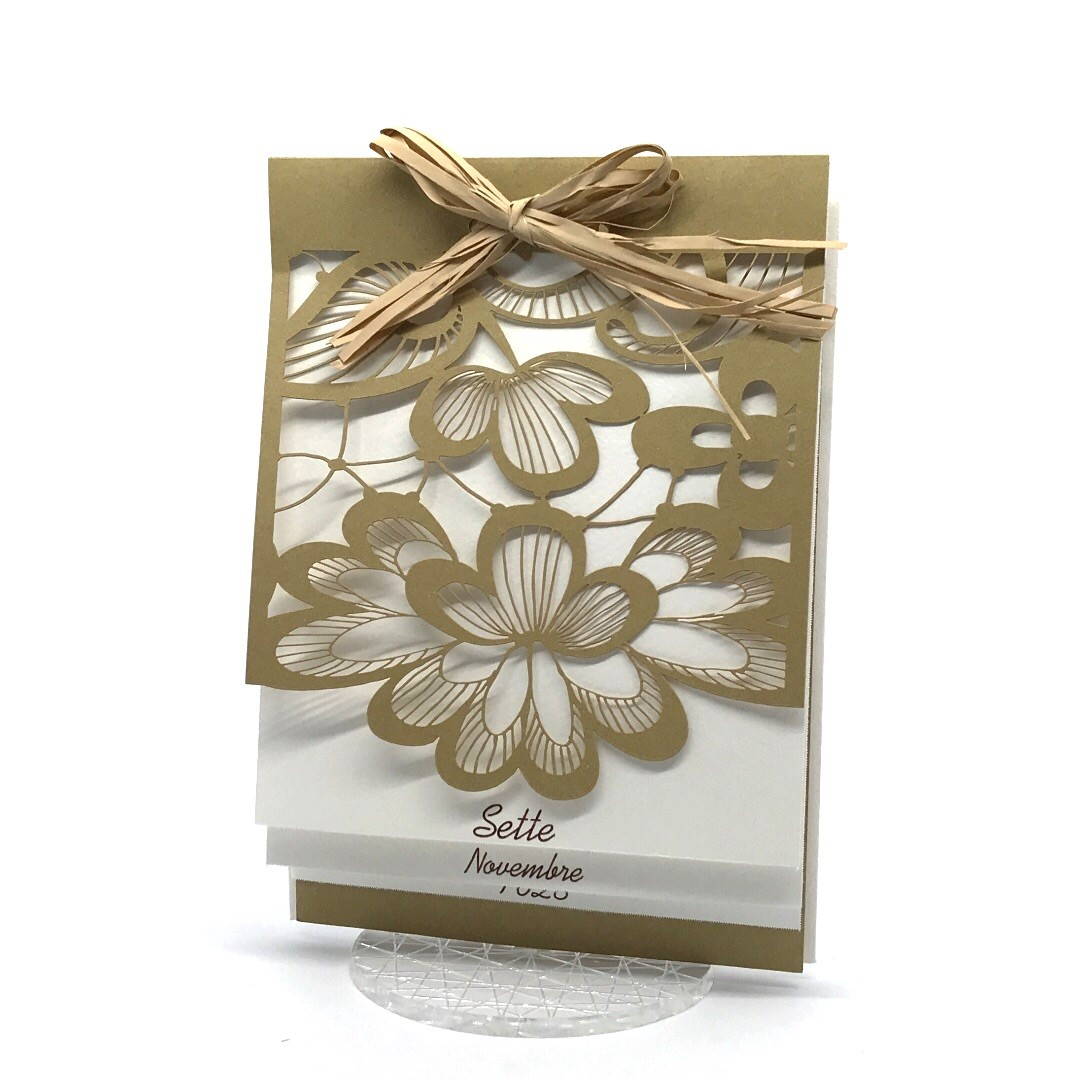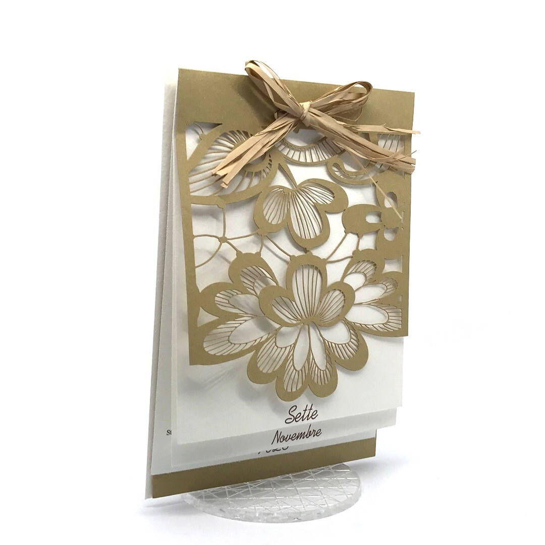 Esterno realizzato su carta materica con decori floreali intagliati a laser, interno realizzato su carta martellata panna con foro per poter inserire un nastro in raffia e legare i cartoncini.