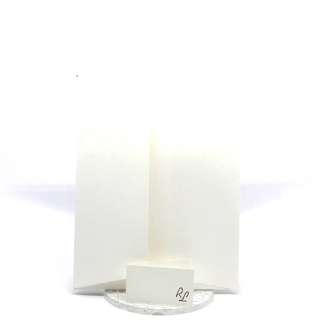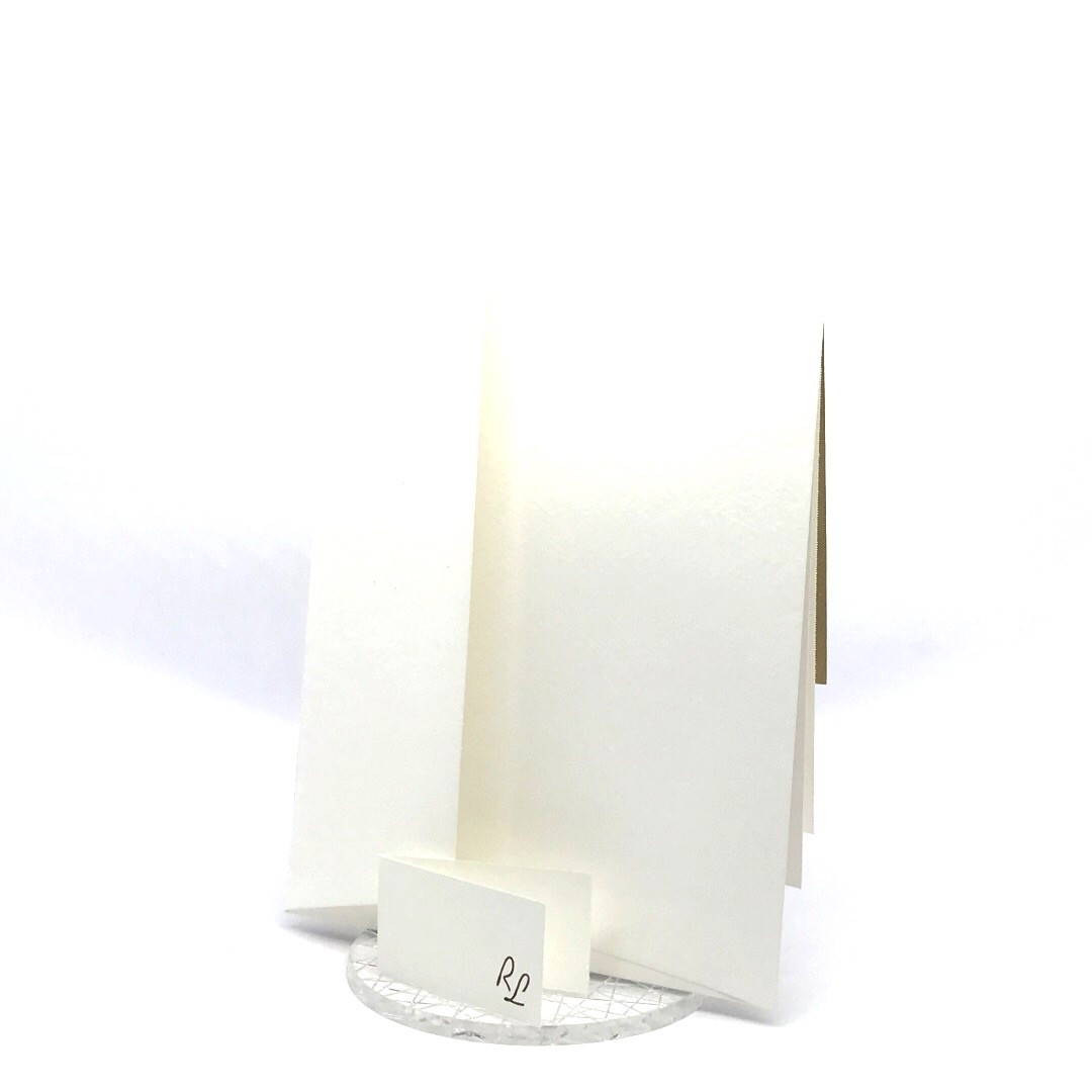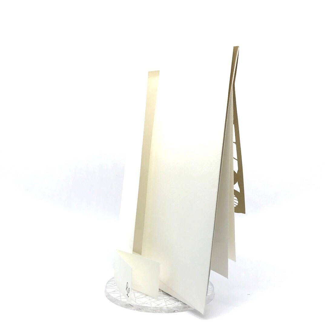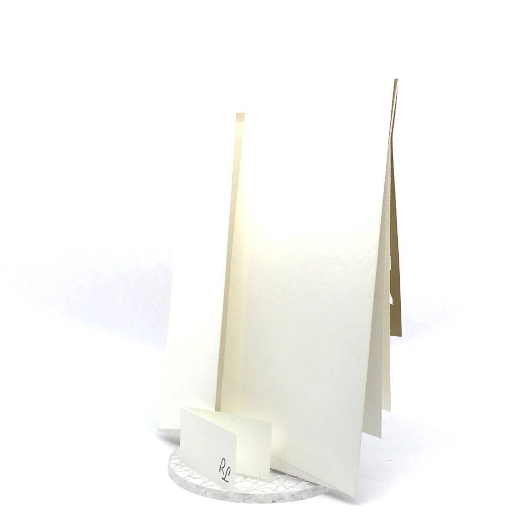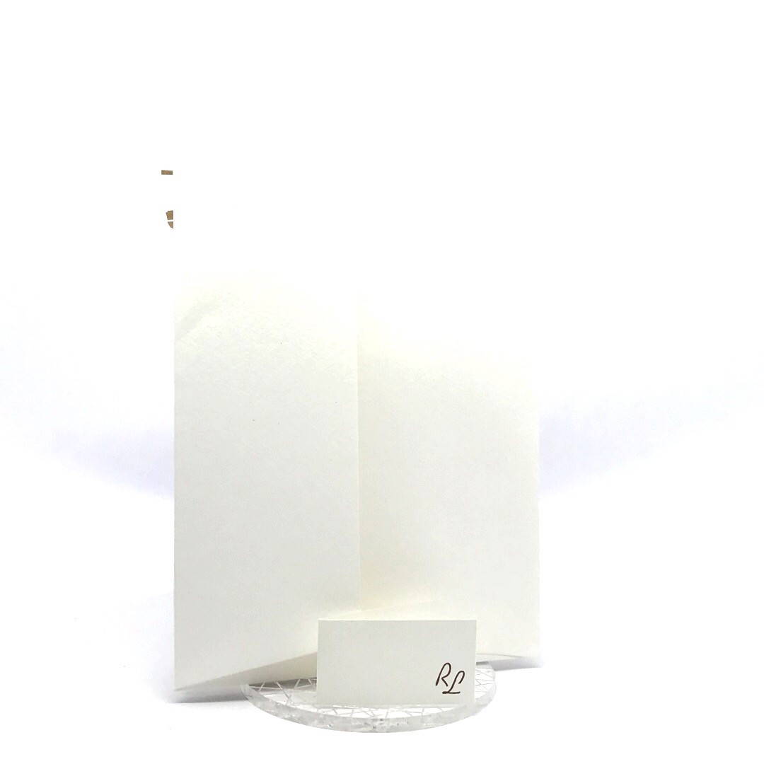 Esterno realizzato su carta materica con decori floreali intagliati a laser, interno realizzato su carta martellata panna con foro per poter inserire un nastro in raffia e legare i cartoncini.