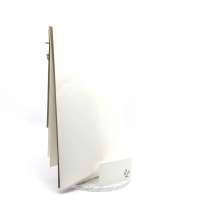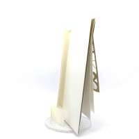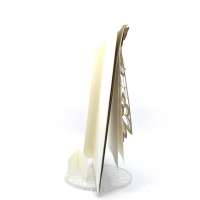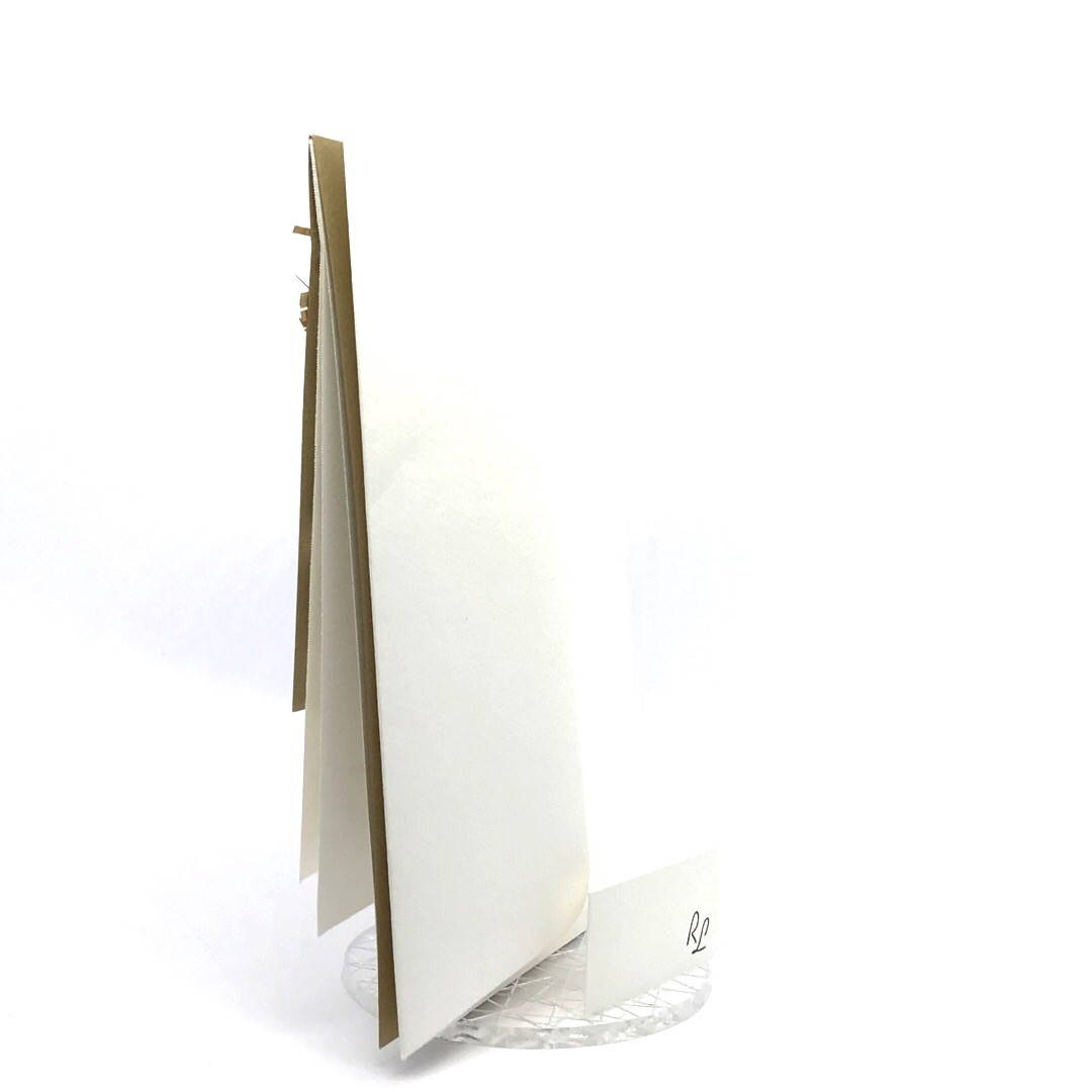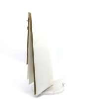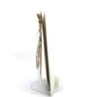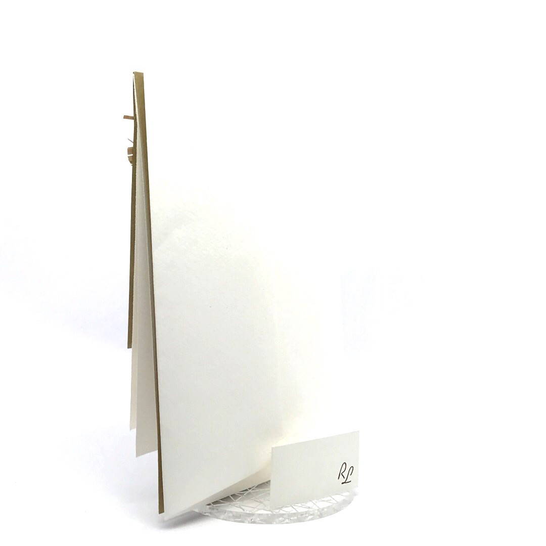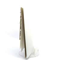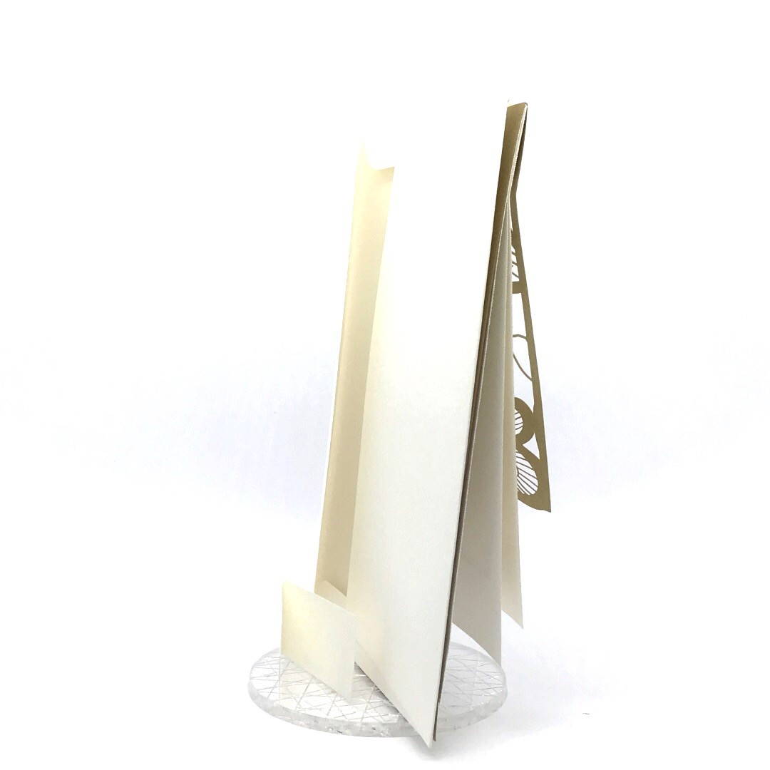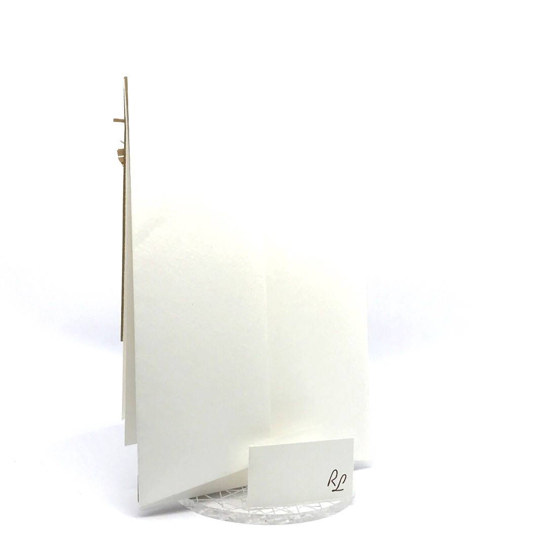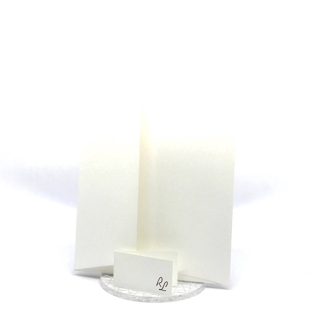 Esterno realizzato su carta materica con decori floreali intagliati a laser, interno realizzato su carta martellata panna con foro per poter inserire un nastro in raffia e legare i cartoncini.