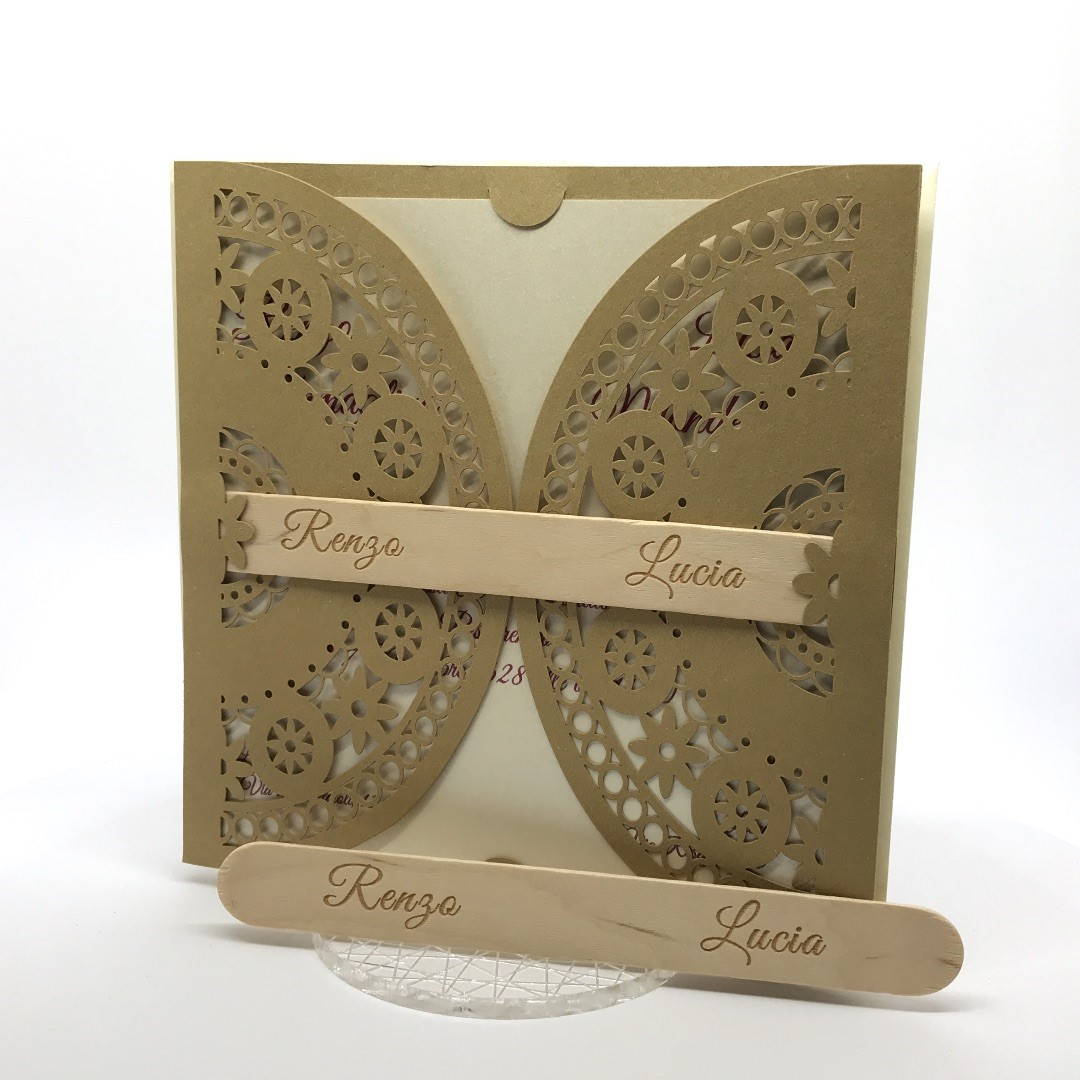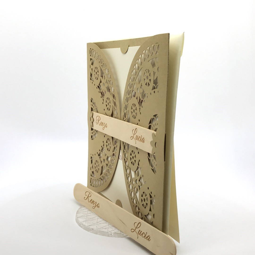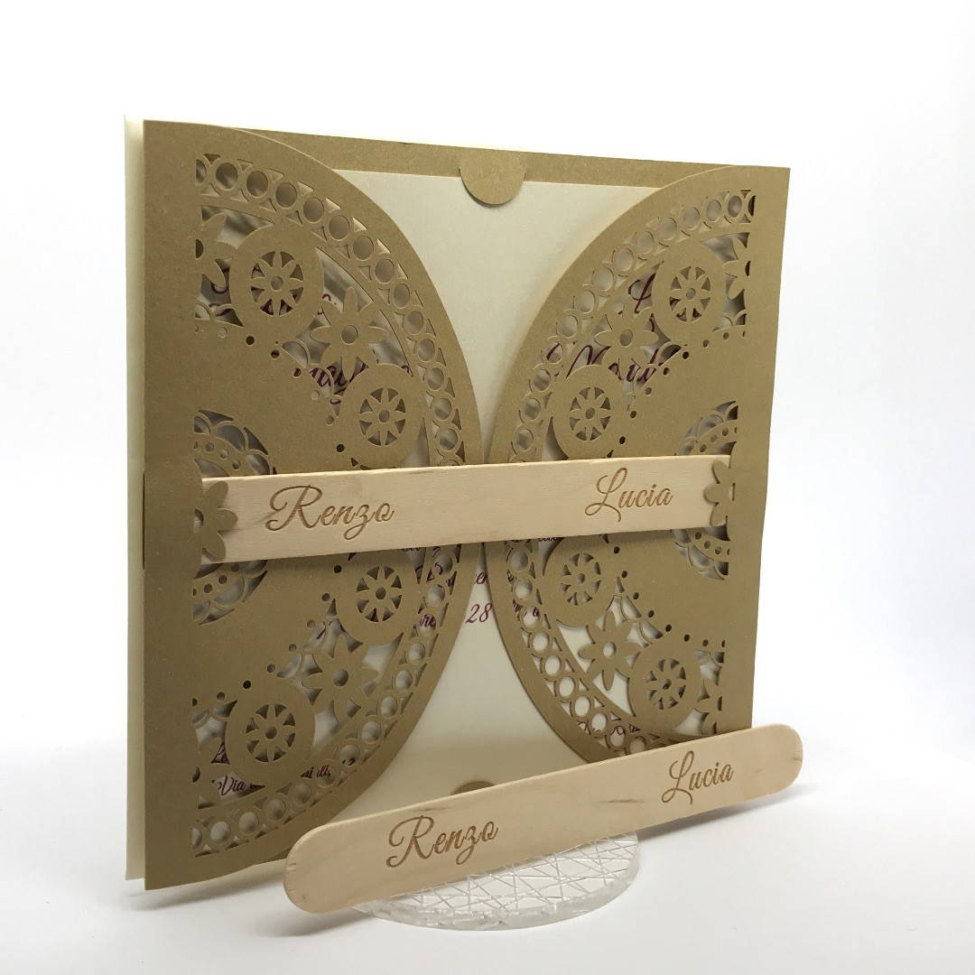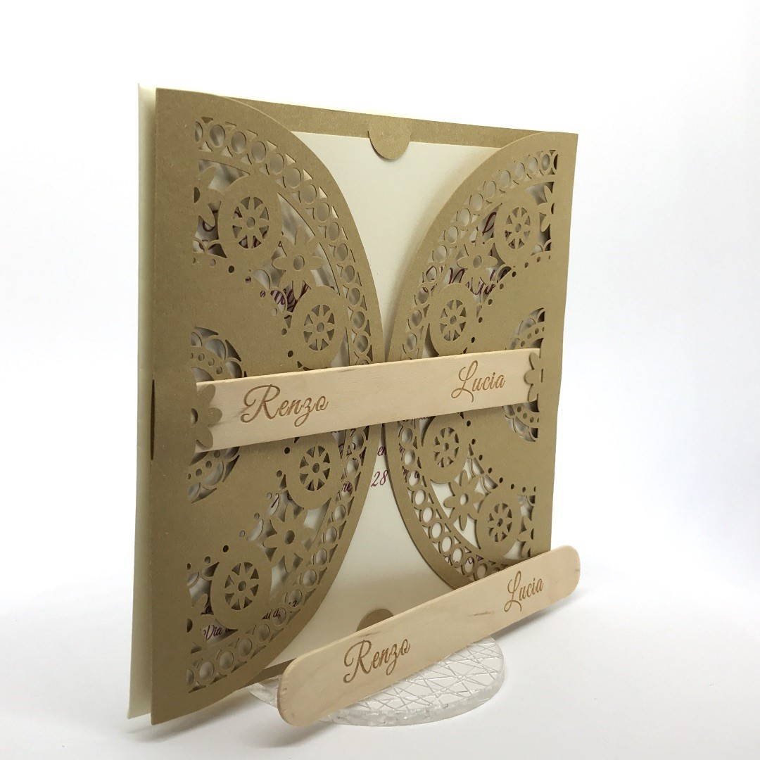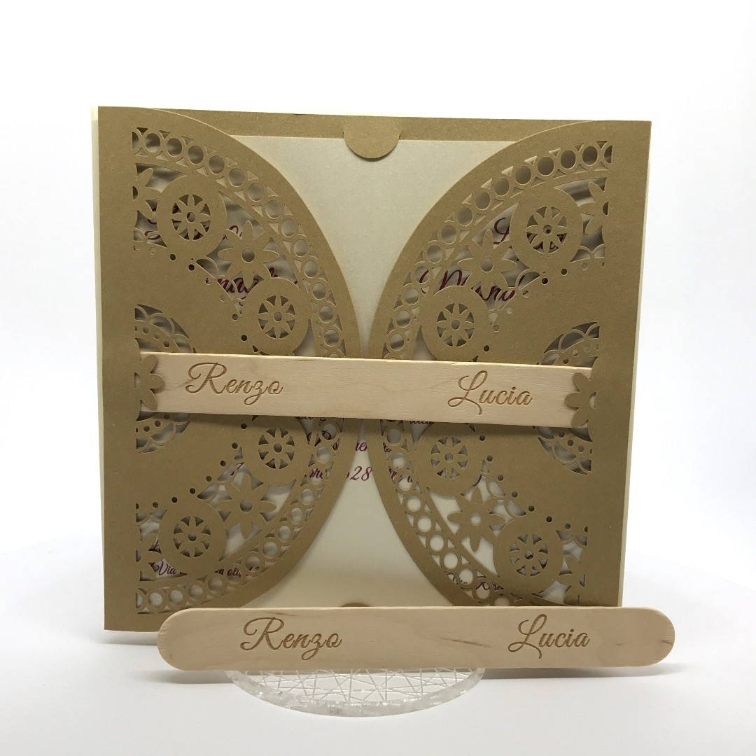 Esterno in carta materica con ghirigori intagliati a laser con alette in cui inserire un interno realizzato su carta perlata avorio, la partecipazione è chiusa da una stecchetta in legno con incisione laser dei nomi degli sposi.