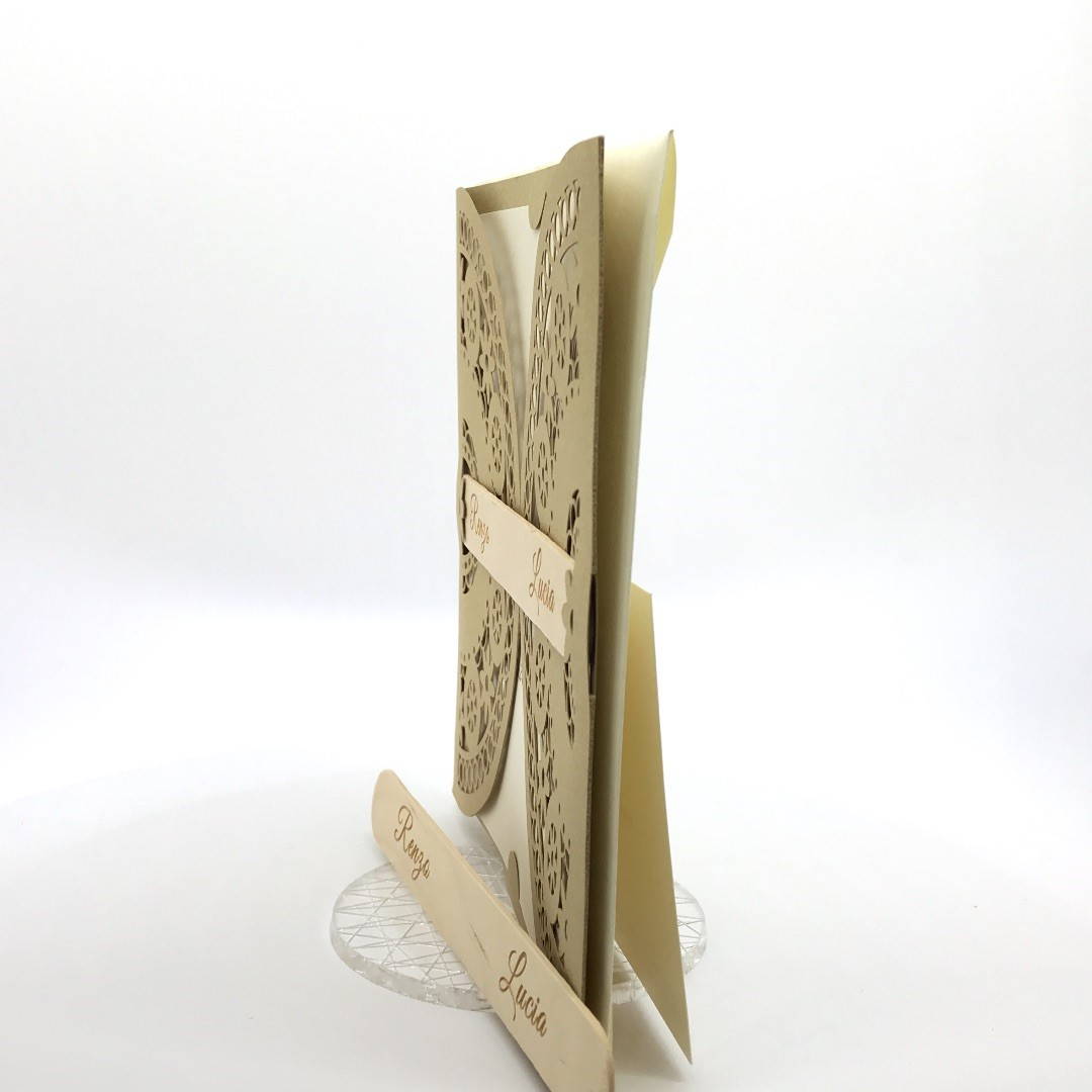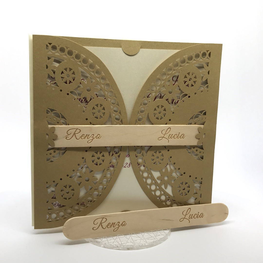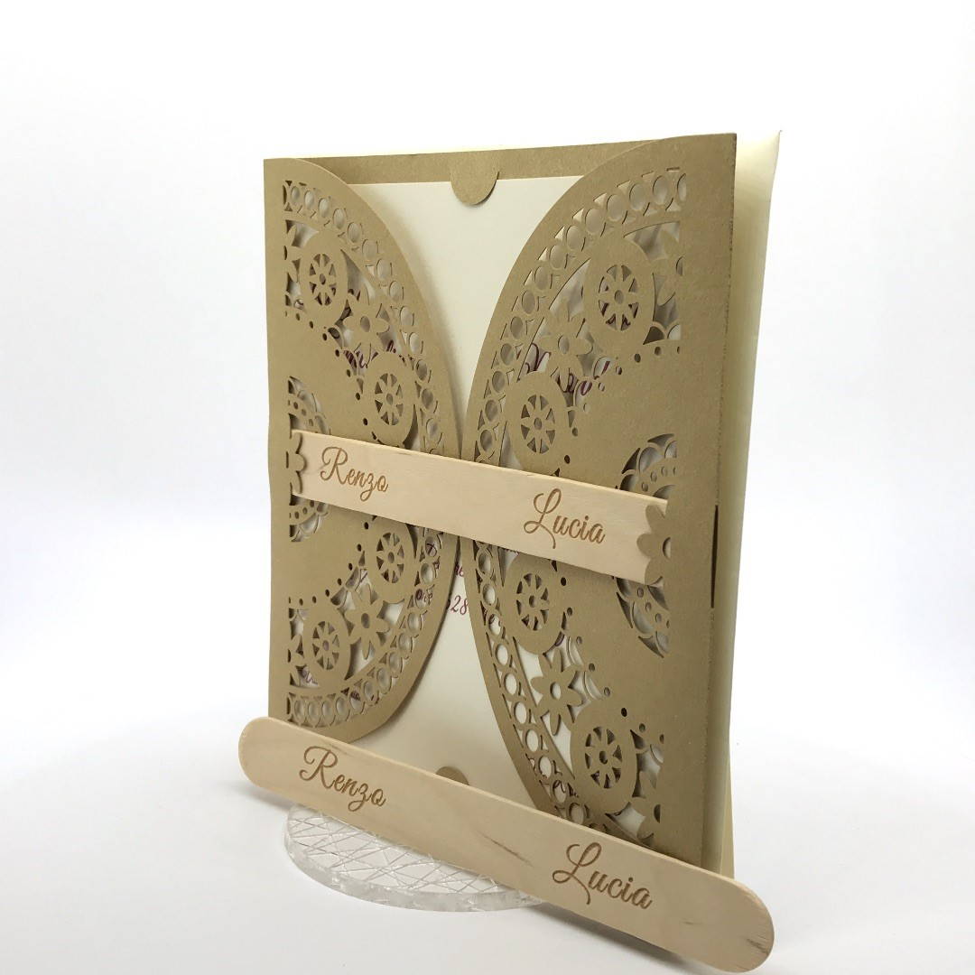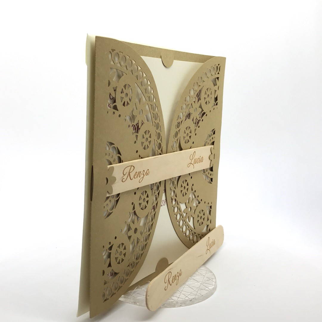 Esterno in carta materica con ghirigori intagliati a laser con alette in cui inserire un interno realizzato su carta perlata avorio, la partecipazione è chiusa da una stecchetta in legno con incisione laser dei nomi degli sposi.