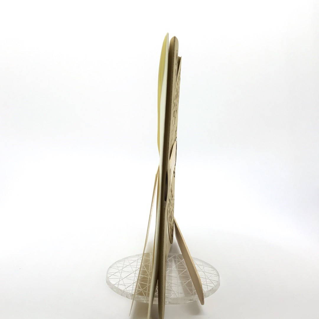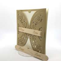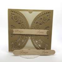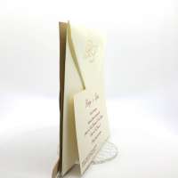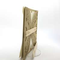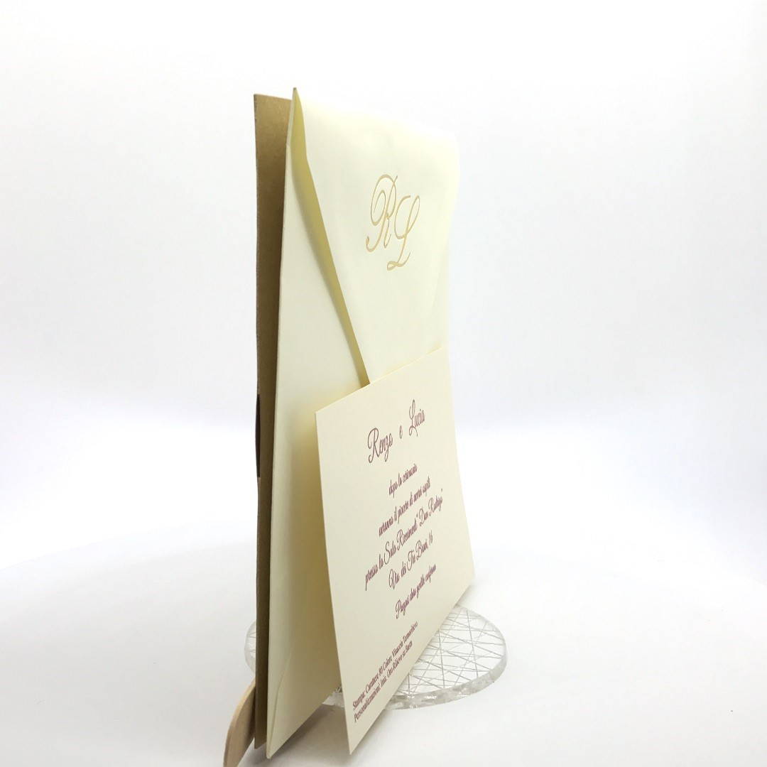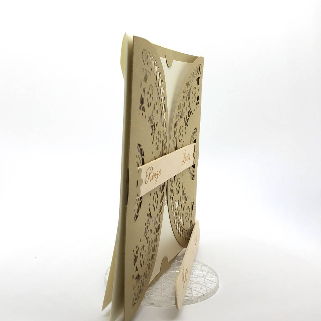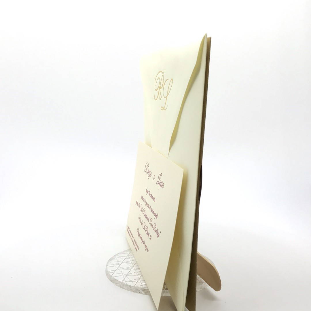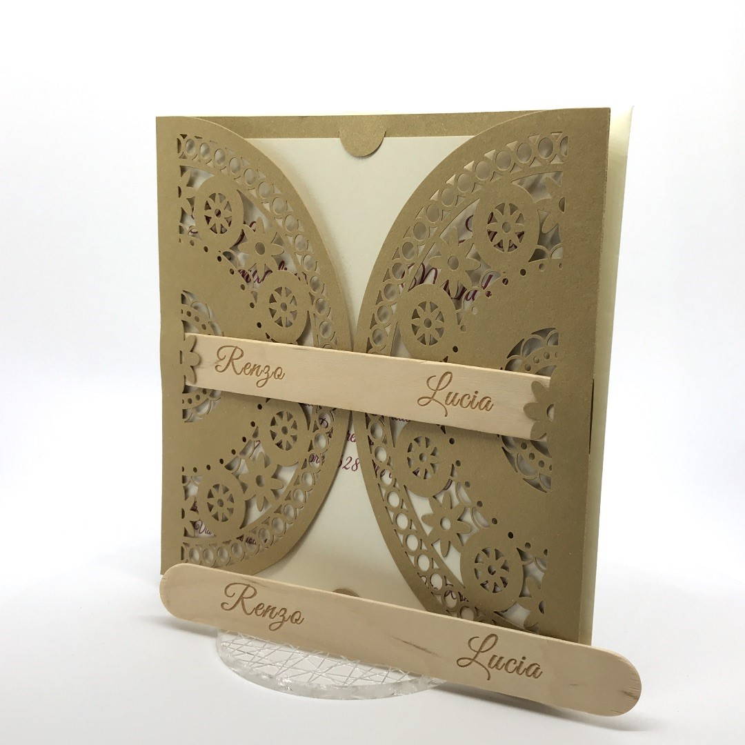 Esterno in carta materica con ghirigori intagliati a laser con alette in cui inserire un interno realizzato su carta perlata avorio, la partecipazione è chiusa da una stecchetta in legno con incisione laser dei nomi degli sposi.