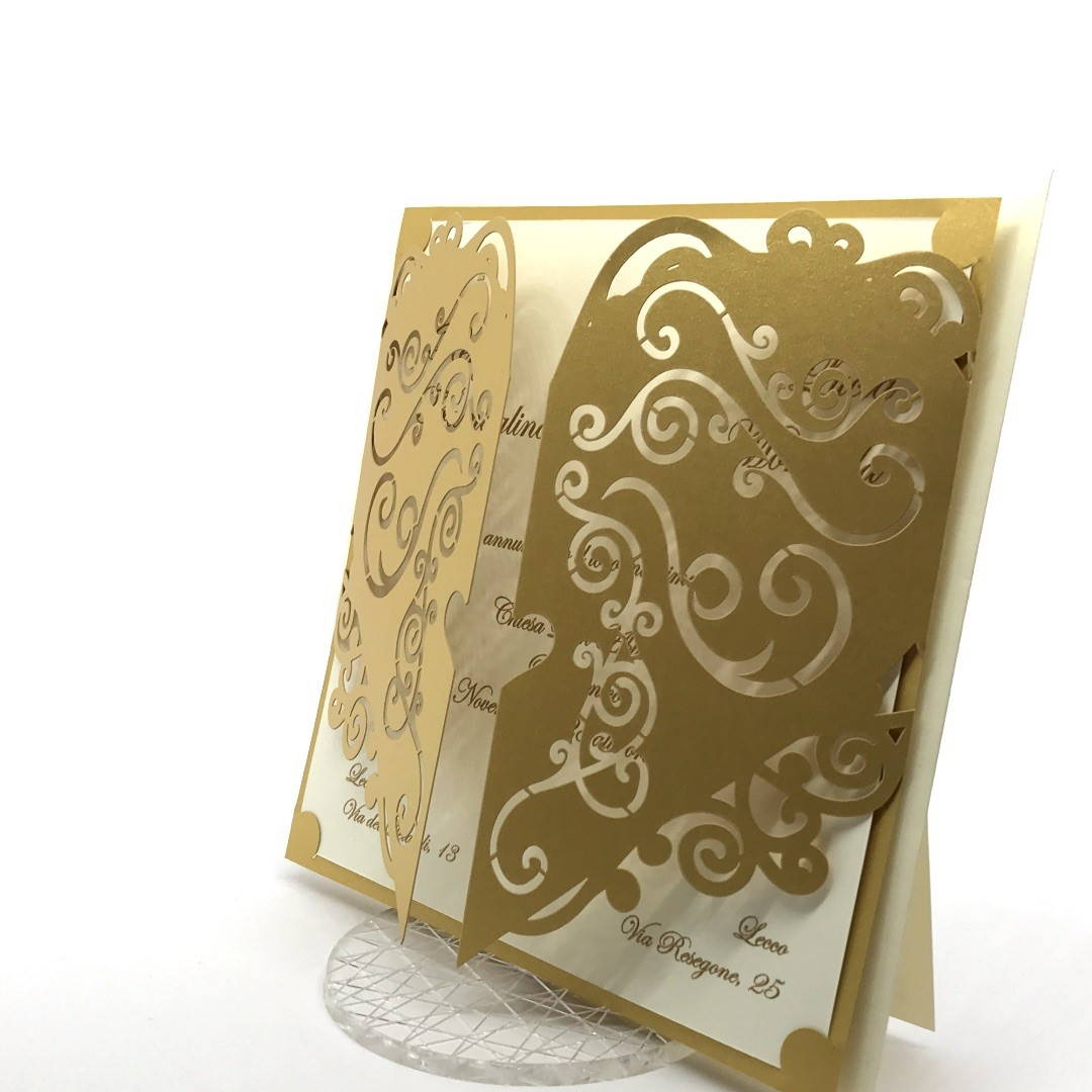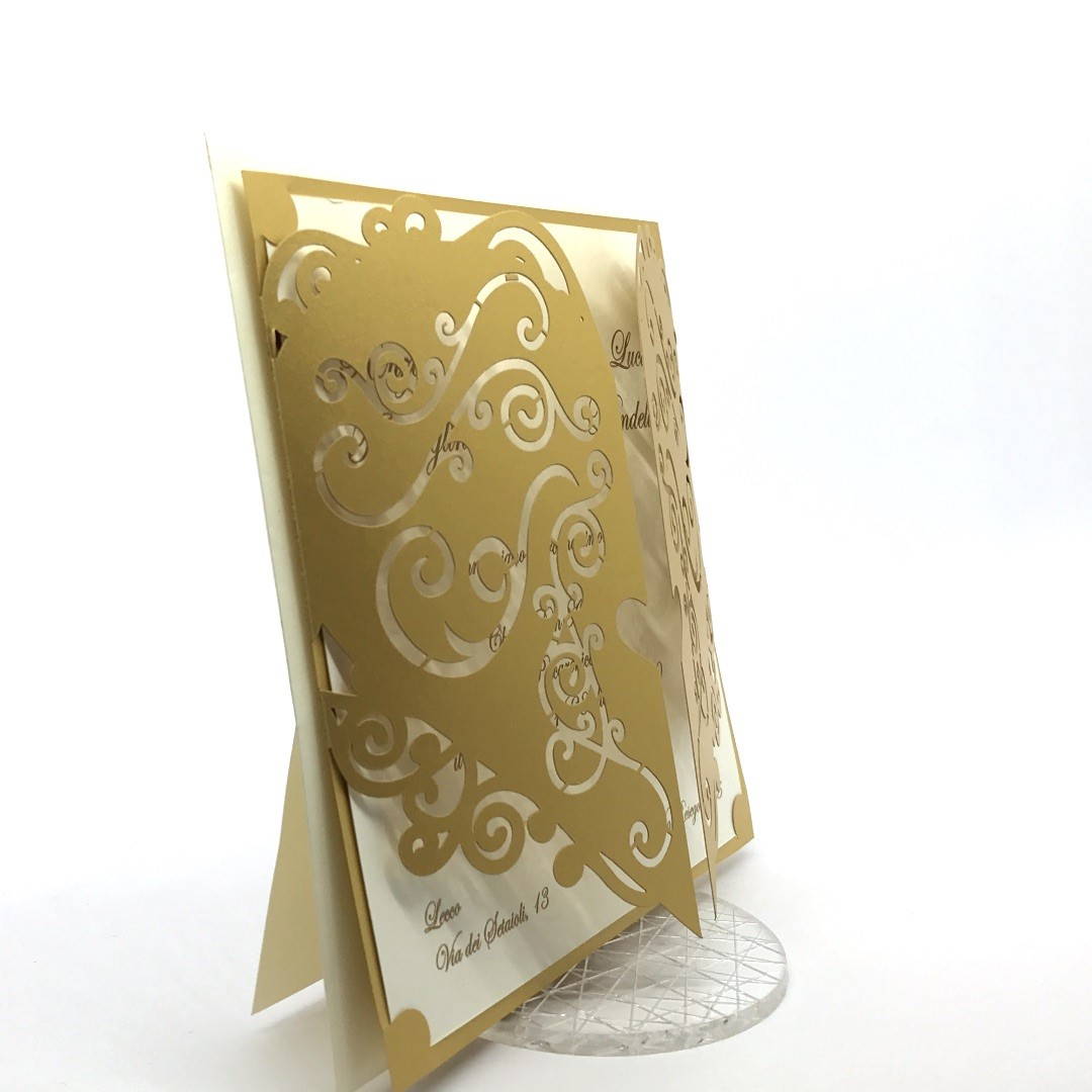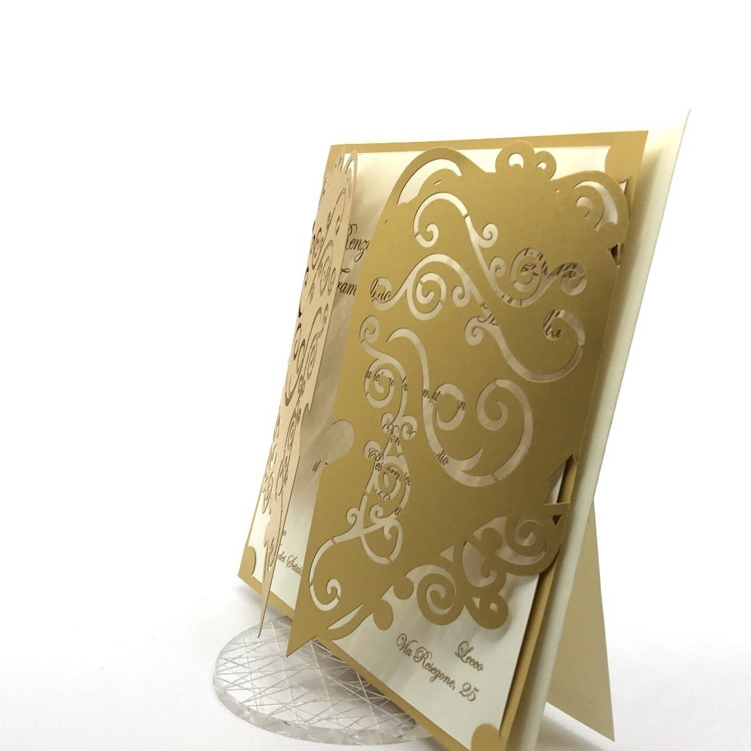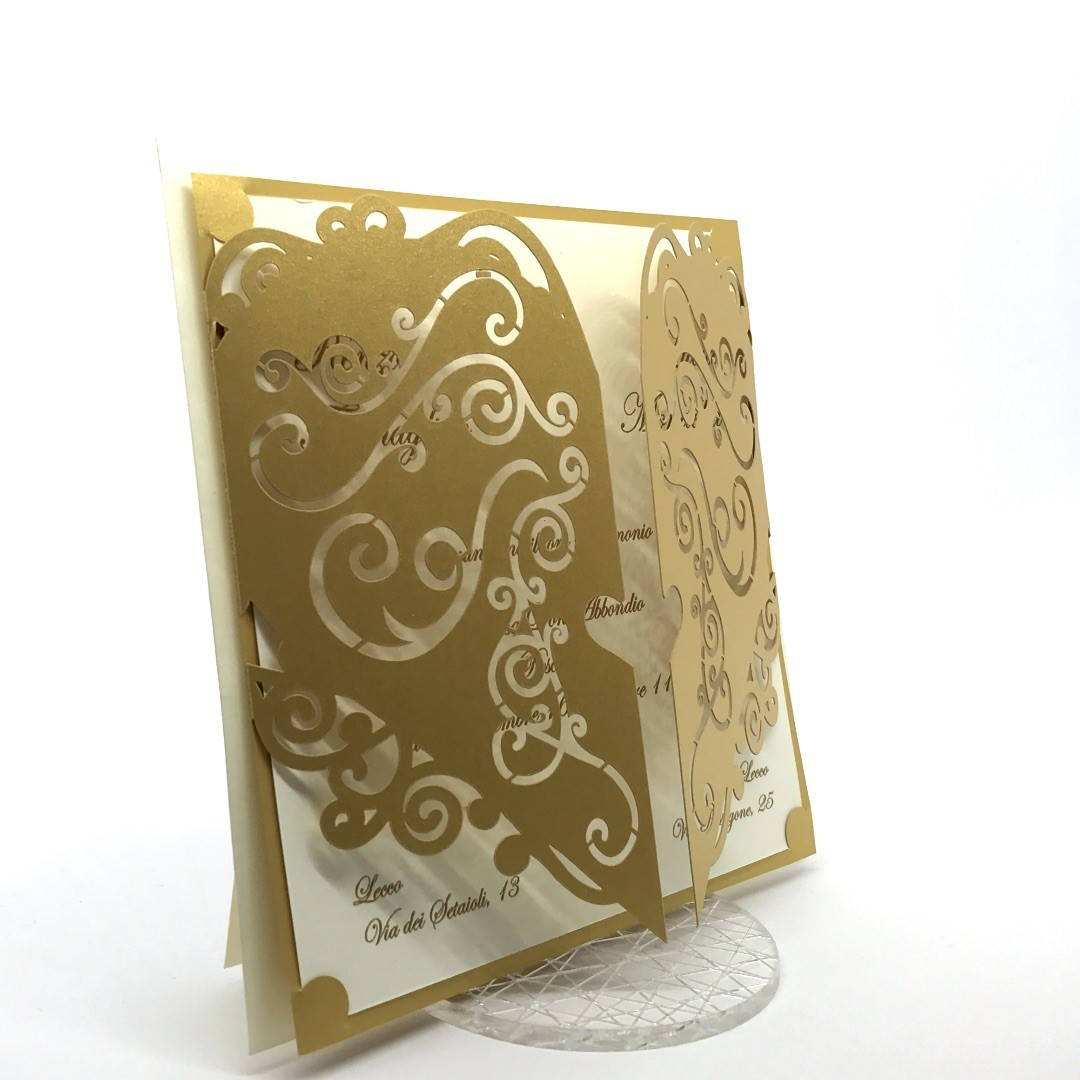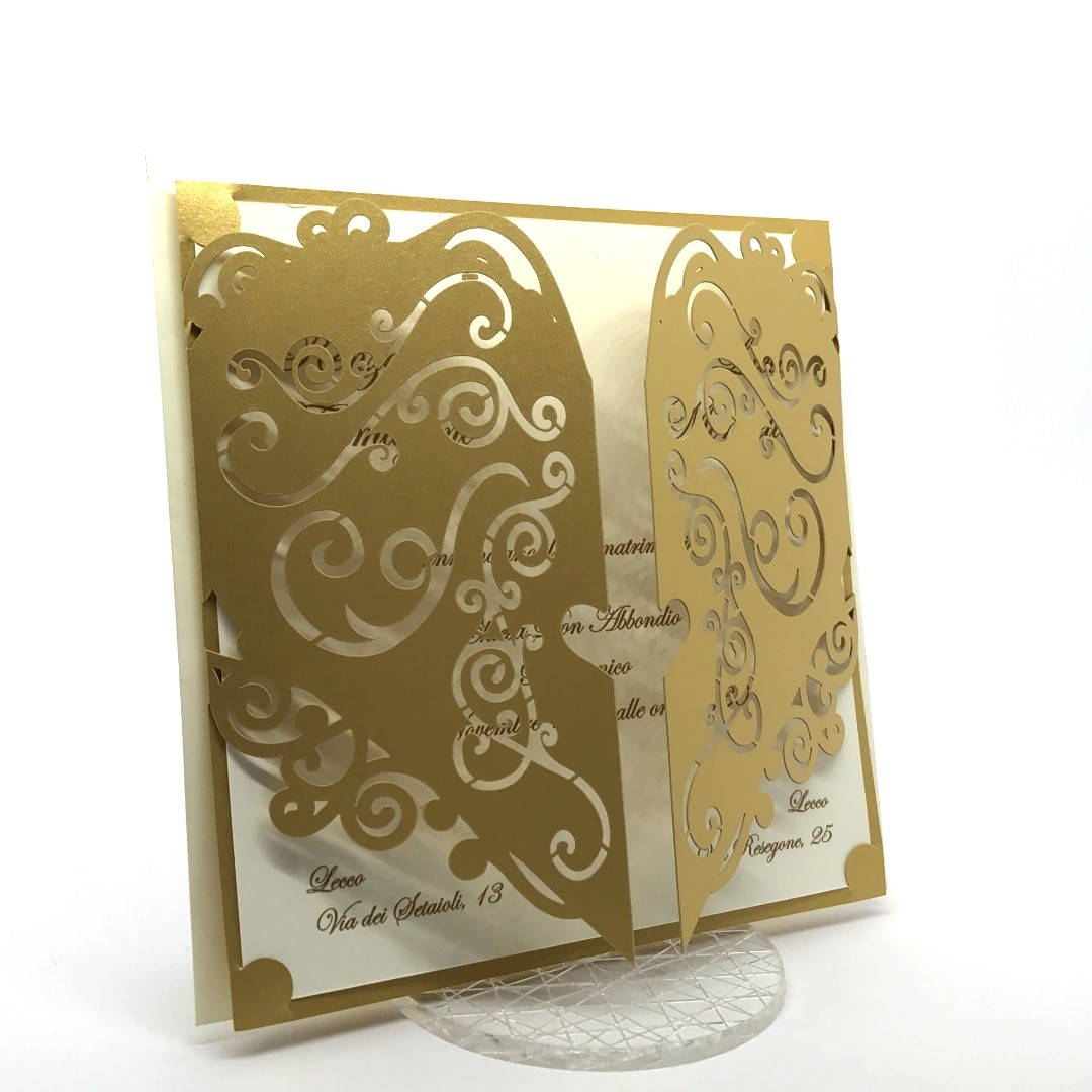 Esterno in carta perlata oro con ghirigori intagliati a laser ed interno in carta avorio.