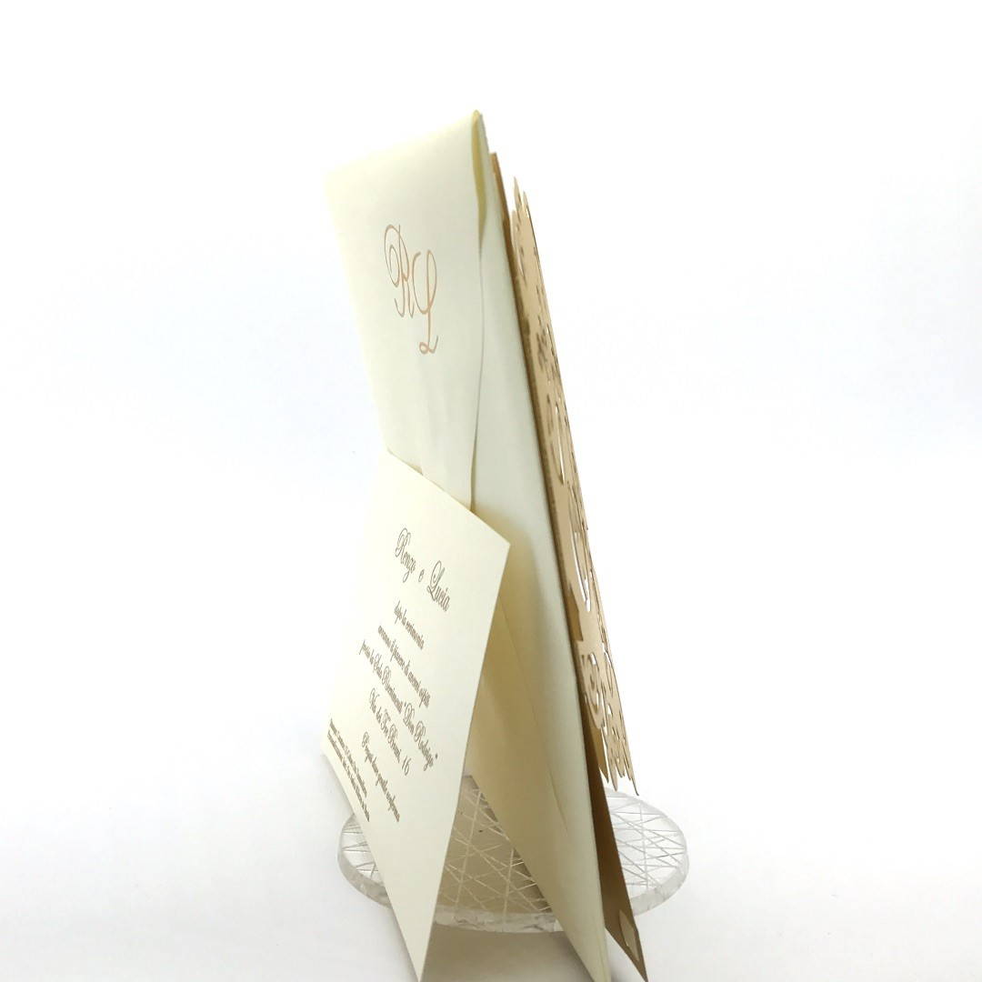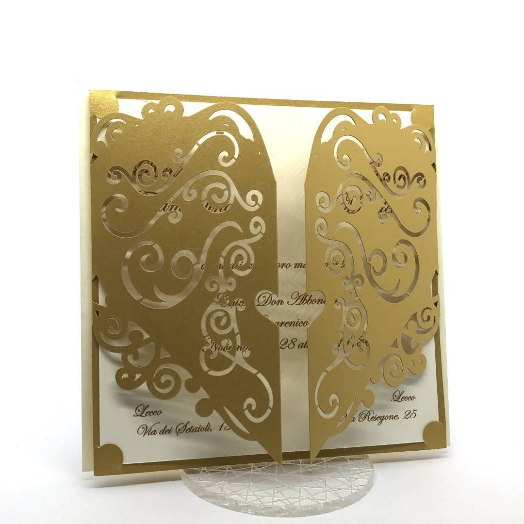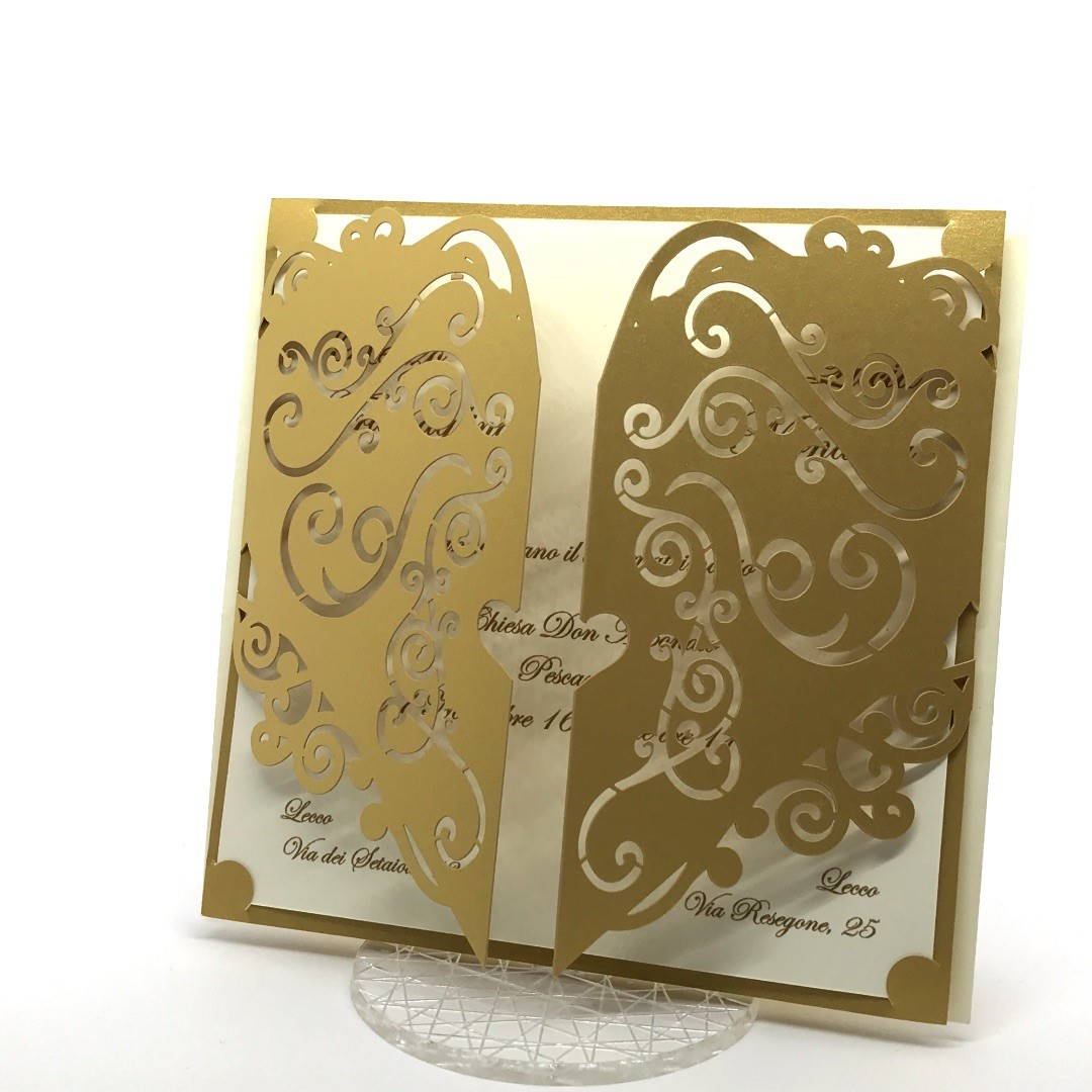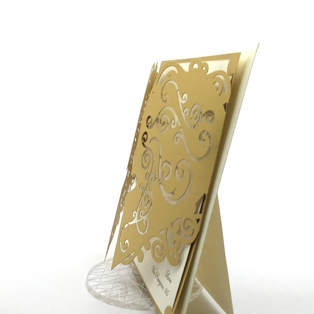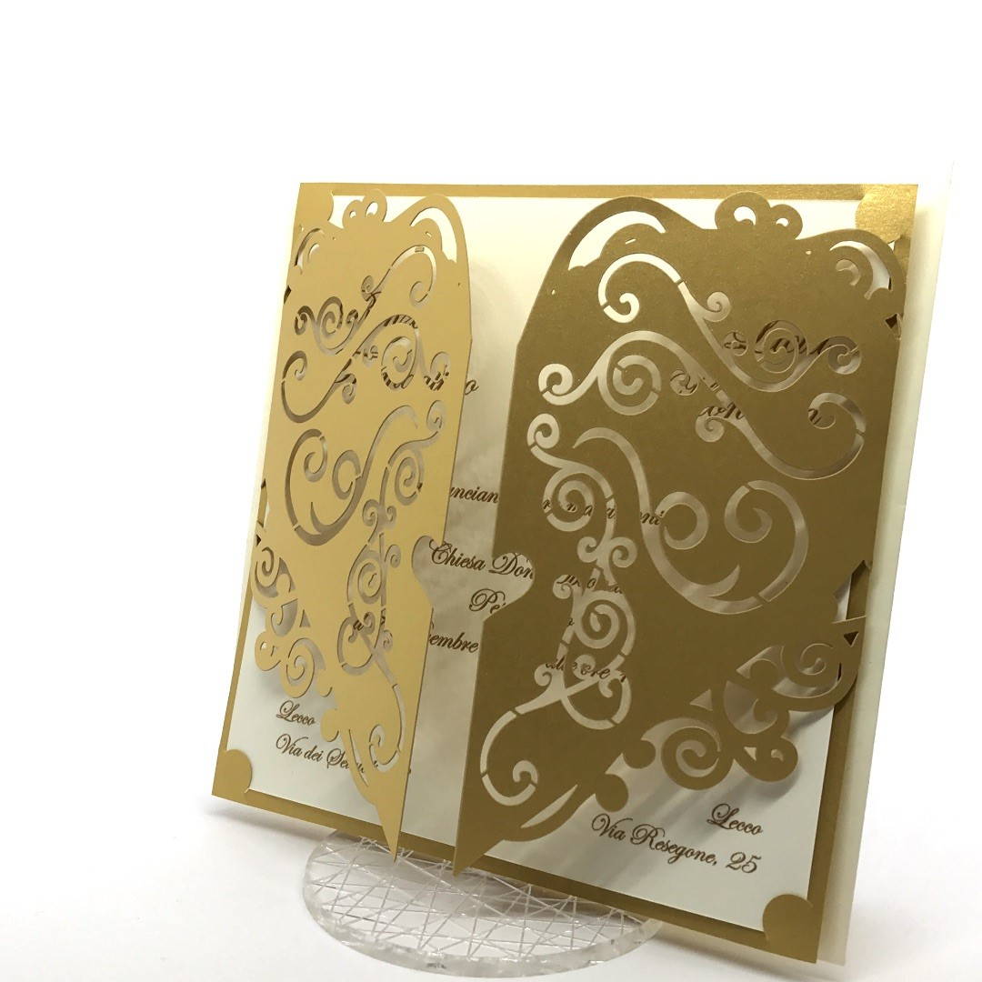 Esterno in carta perlata oro con ghirigori intagliati a laser ed interno in carta avorio.