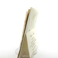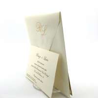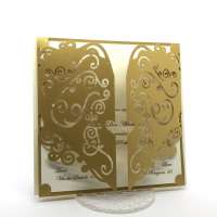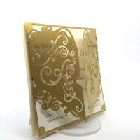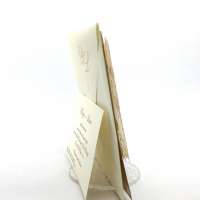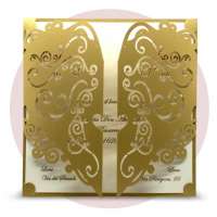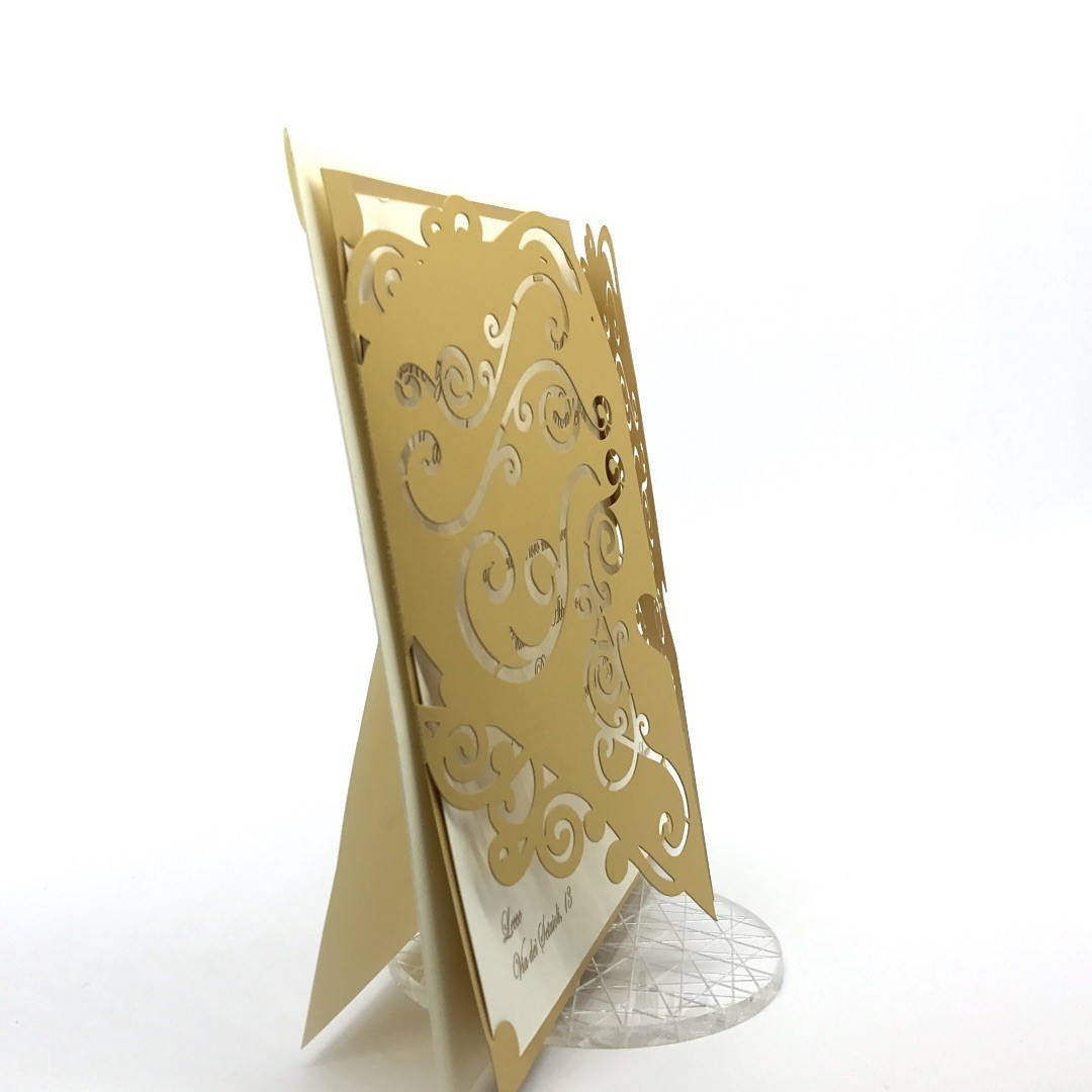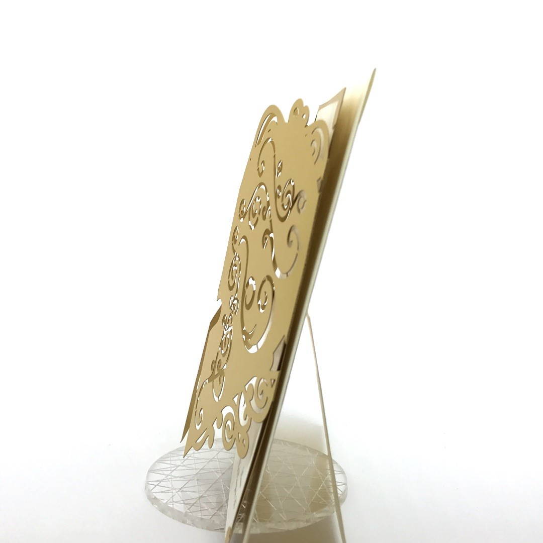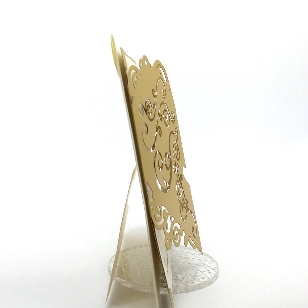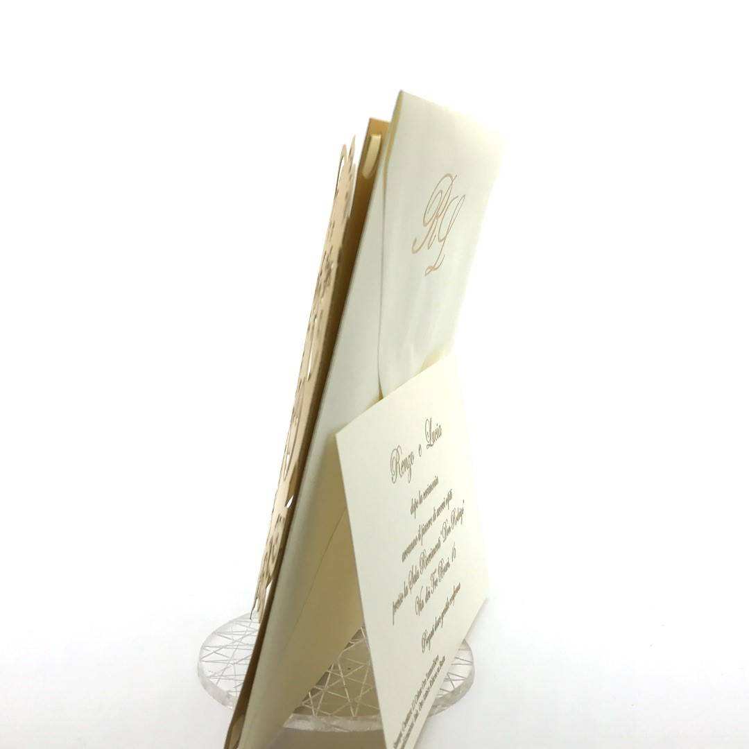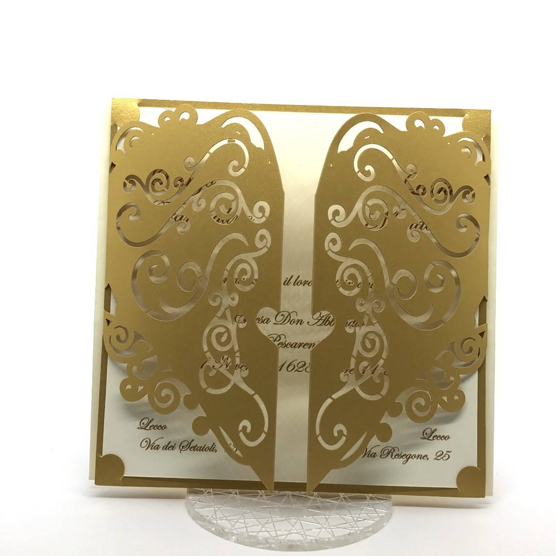 Esterno in carta perlata oro con ghirigori intagliati a laser ed interno in carta avorio.