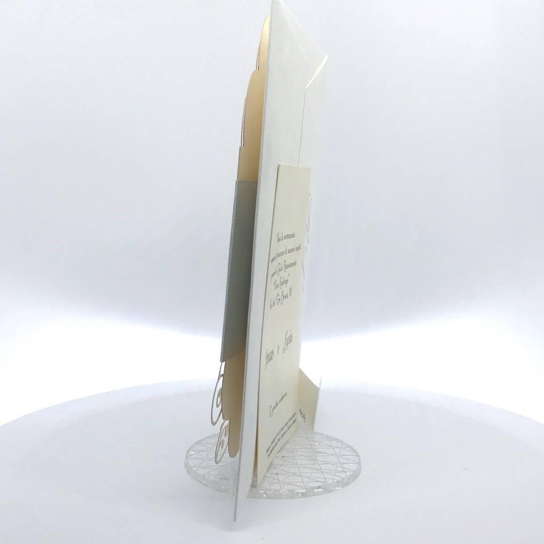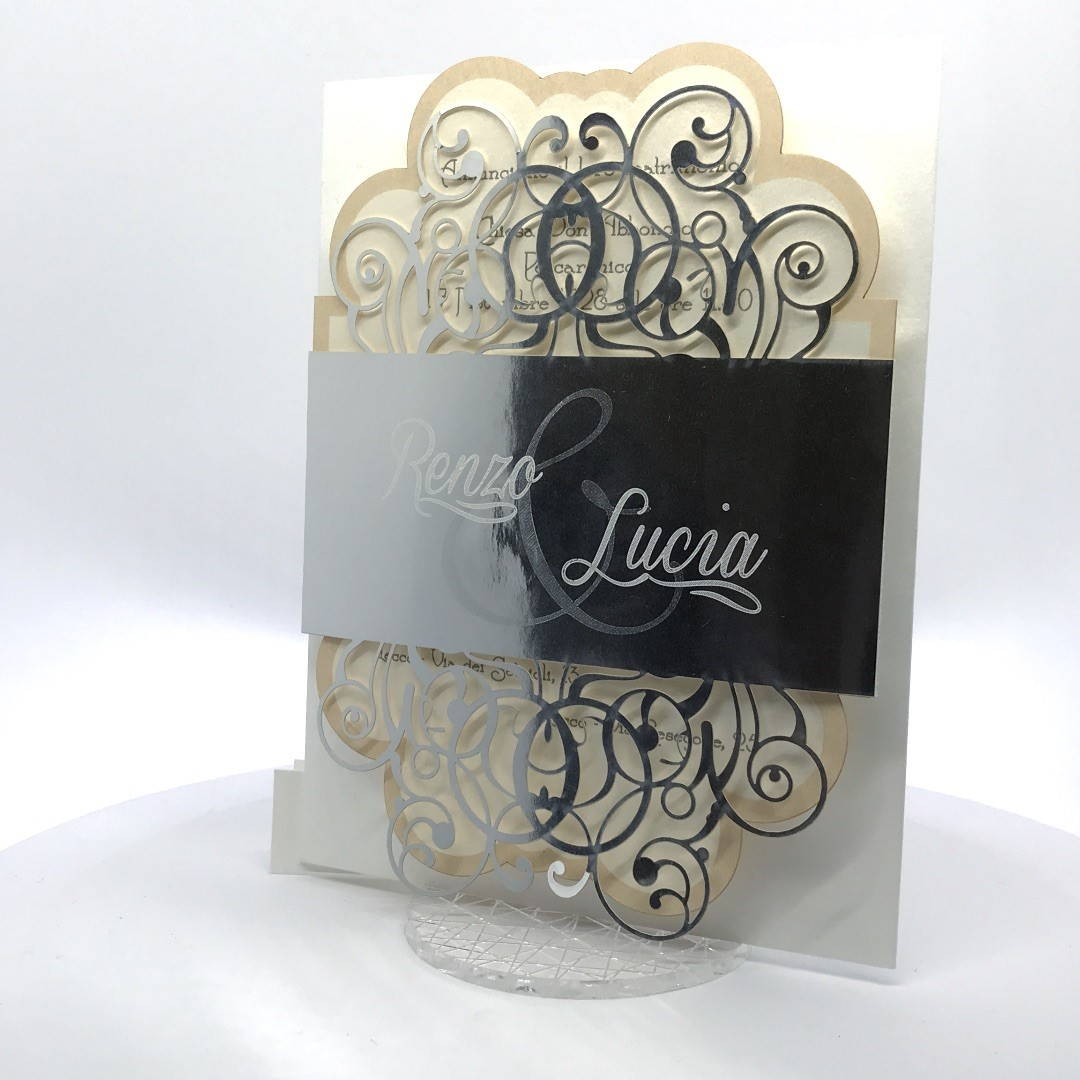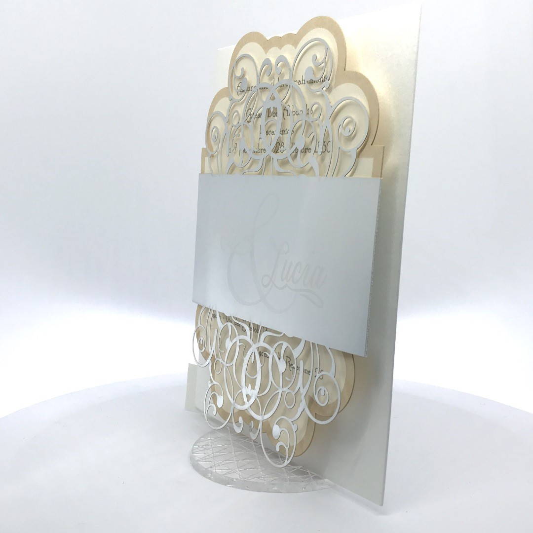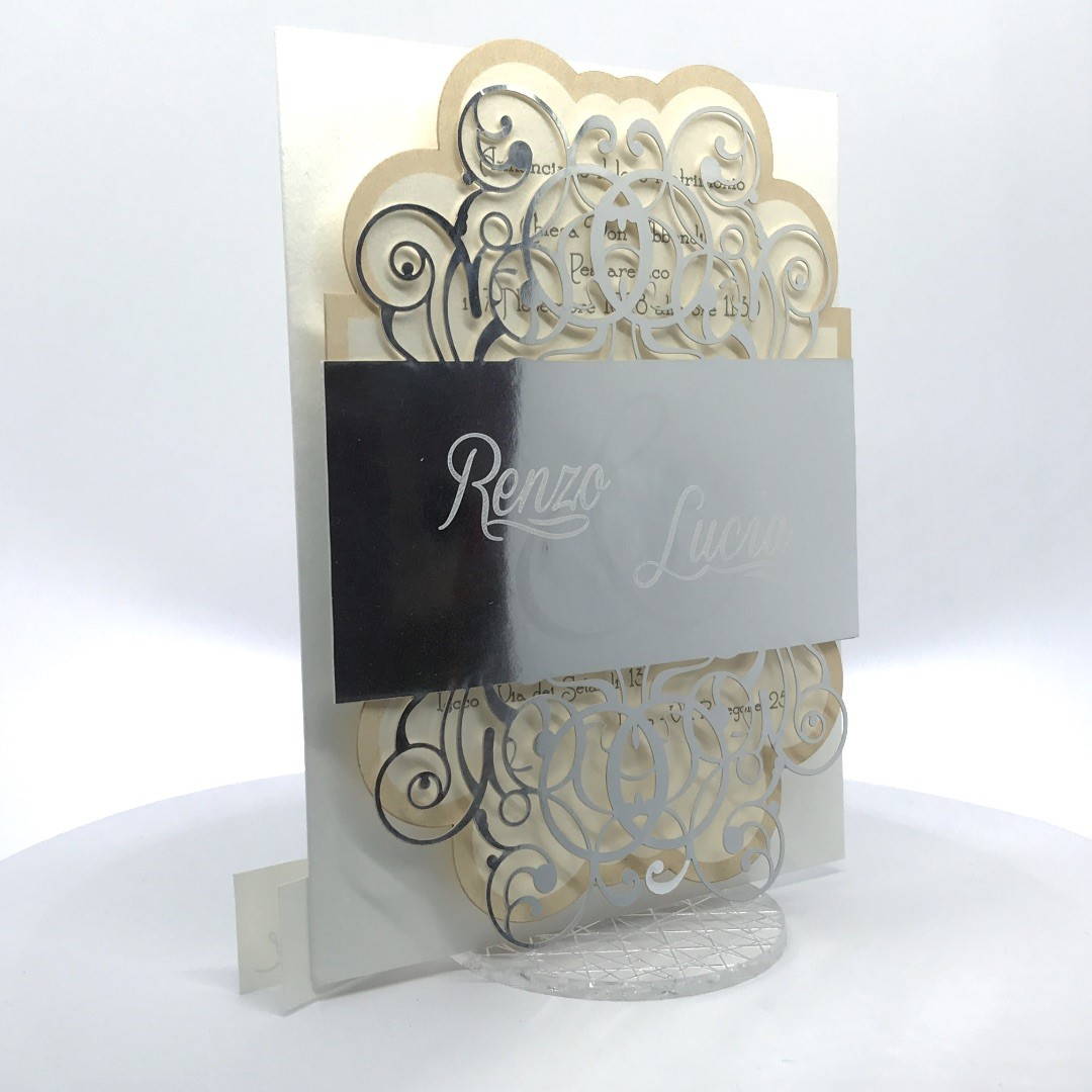 Cartoncino sagomato realizzato su carta perlata e fascetta realizzata su carta specchiata argento con iniziali incise e decori intagliati a laser.