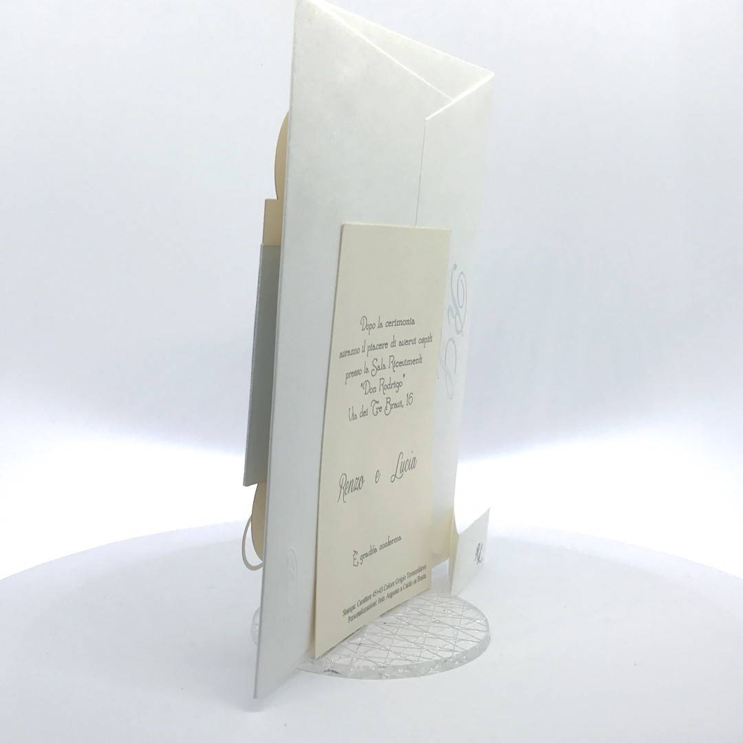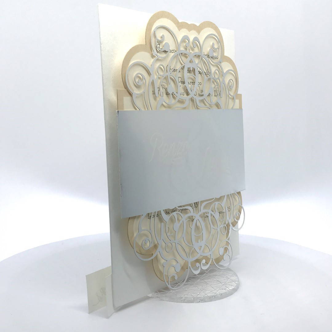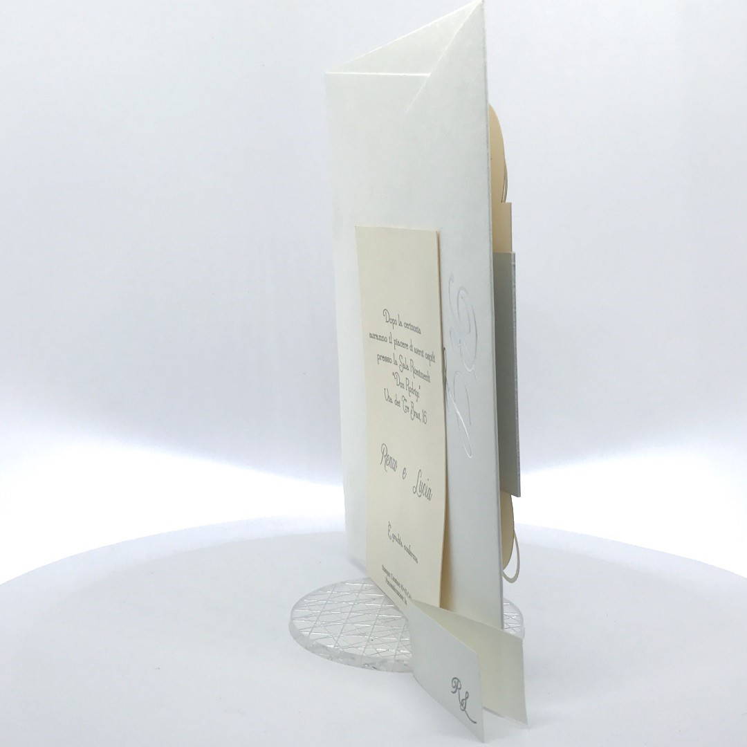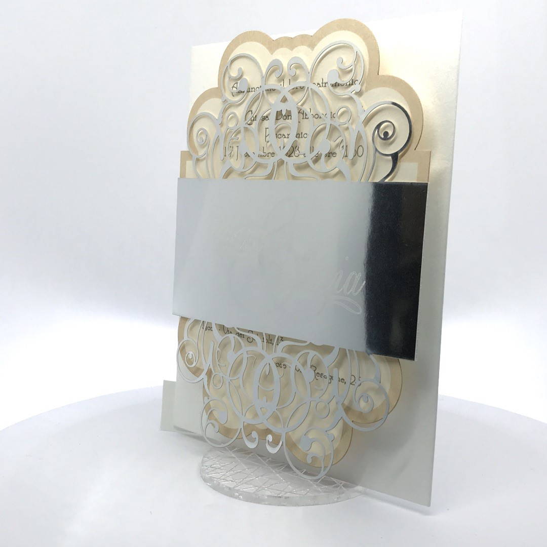 Cartoncino sagomato realizzato su carta perlata e fascetta realizzata su carta specchiata argento con iniziali incise e decori intagliati a laser.