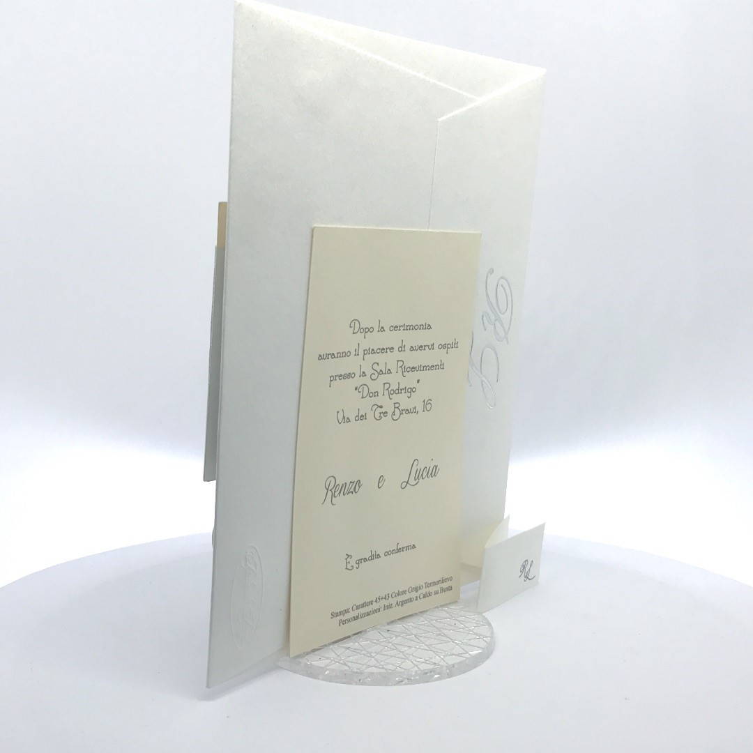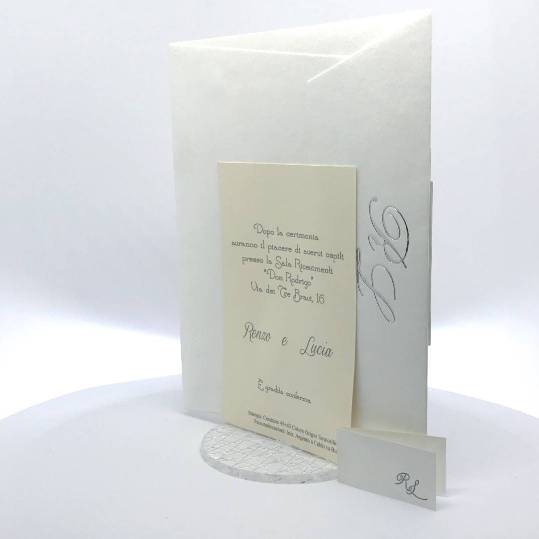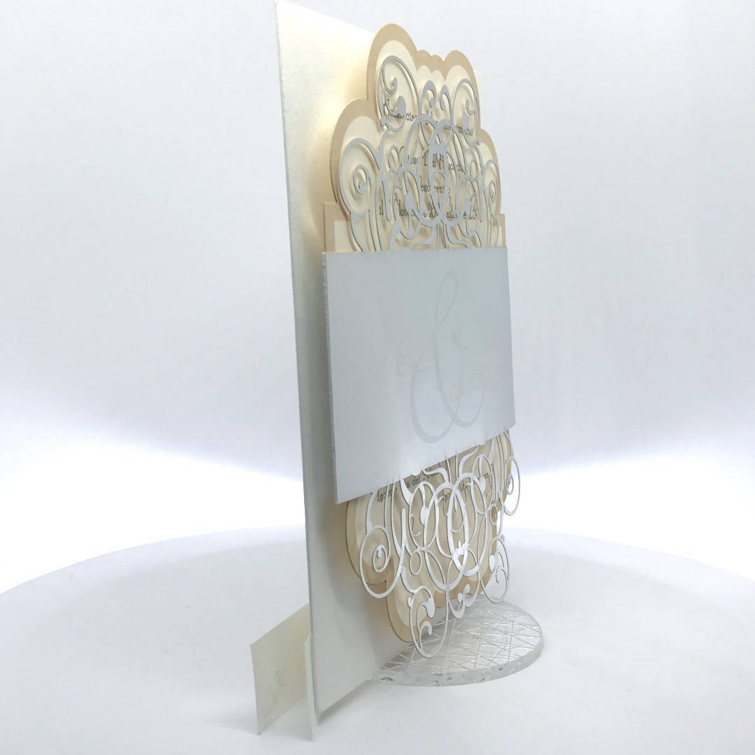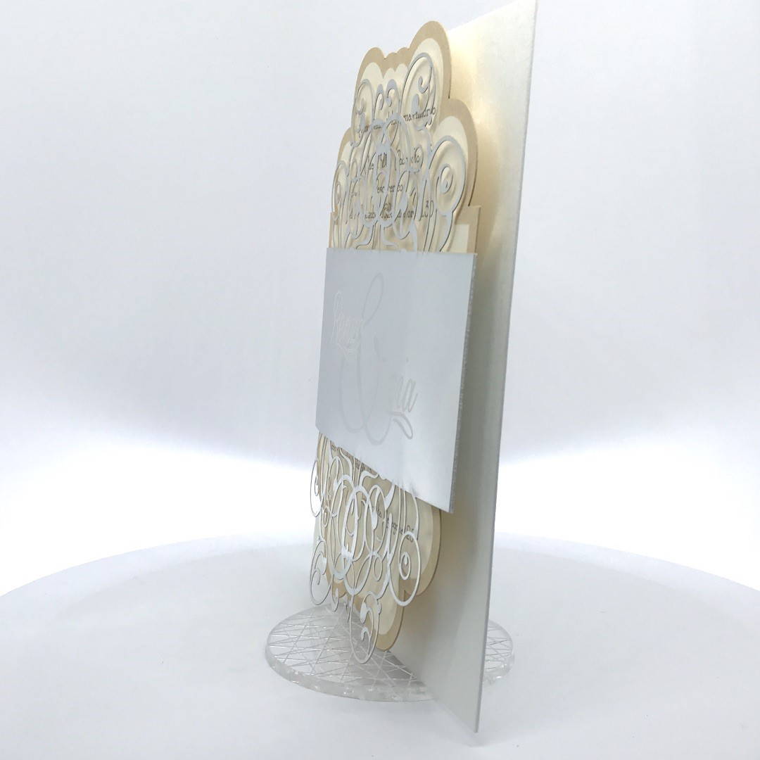 Cartoncino sagomato realizzato su carta perlata e fascetta realizzata su carta specchiata argento con iniziali incise e decori intagliati a laser.